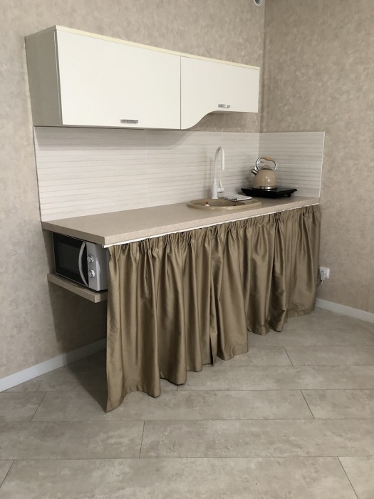 - Комфортный кухонный блок (холодильник, микроволновая печь, индукционная плита, стиральная машинка, посуда).