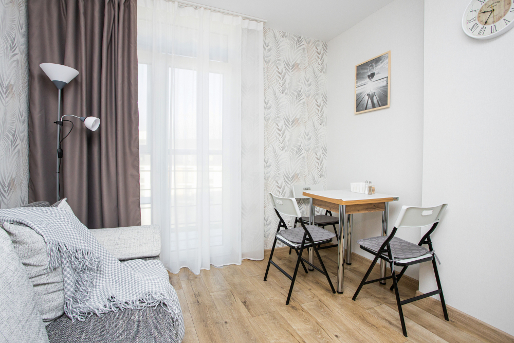 Однокомнатная квартира в новом ЖК, находится в 10 минутах ходьбы от пляжа и центра г. Пионерский. Расстояние до железнодорожного вокзала г. Пионерский составляет 300 м, а до международного аэропорта Храброво 20 км. Расстояние до г. Калининград составляет 32 км.