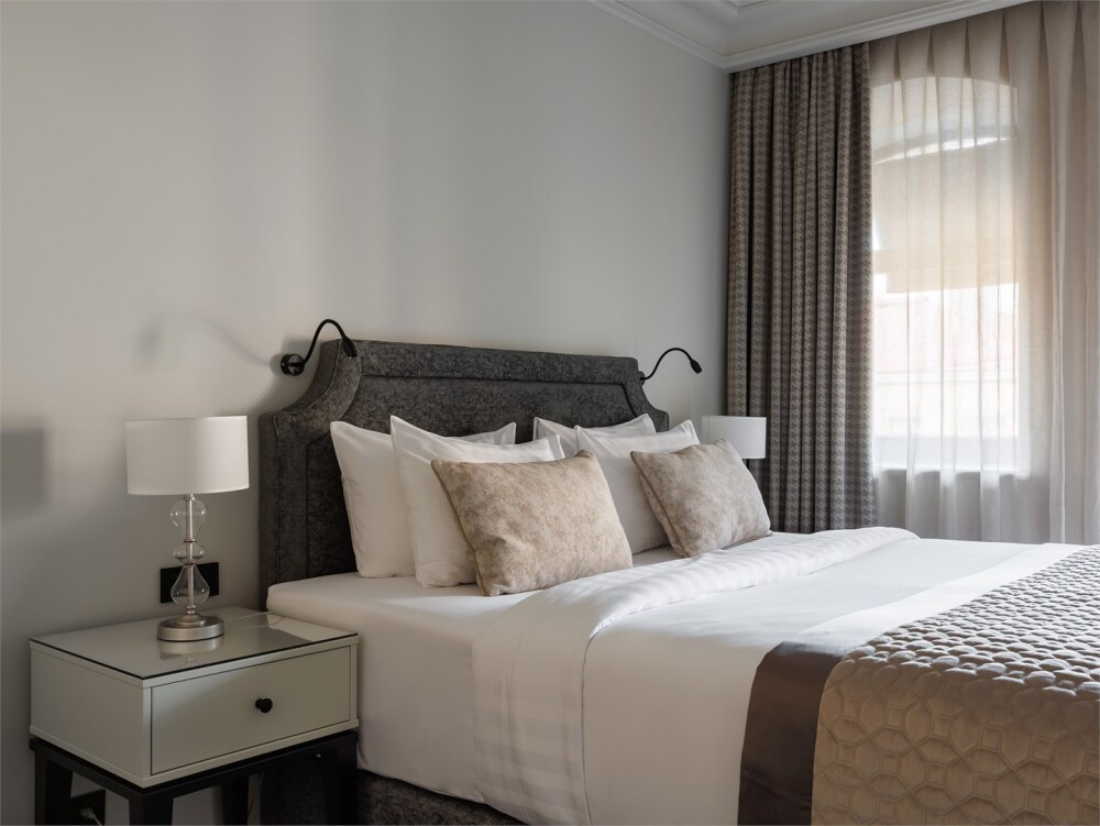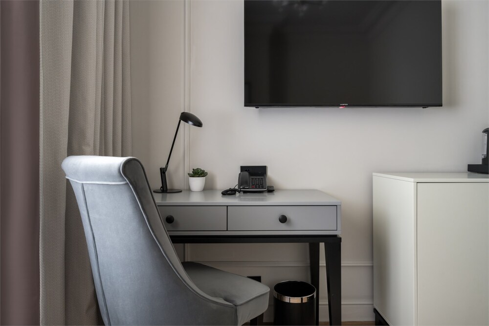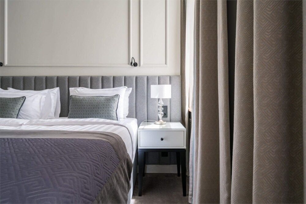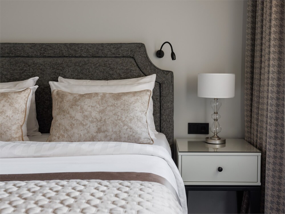 В номере имеется большая, удобная кровать, ортопедический матрас, гипоаллергенное постельное белье, современное техническое оснащение, шторы Блэк-аут.