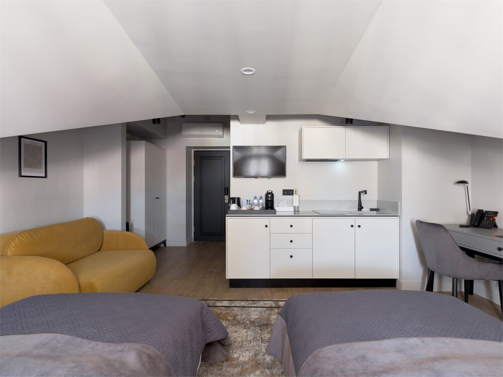 Номер категории Стандарт АТТИК оснащён кухней с варочной панелью и необходимой посудой. Также в номере имеются две односпальные кровати, ортопедические матрасы, гипоаллергенное постельное белье, ванная, современное техническое оснащение, шторы Блэк-аут.