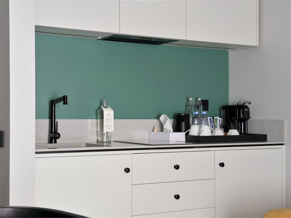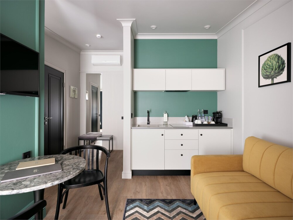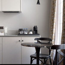 Номер категории Делюкс с кухней – это комфорт и стиль в сочетании с классическим интерьером. Просторный номер располагает большими удобными кроватями с ортопедическим матрасом и гипоаллергенным постельным бельем, кухонной зоной с варочной панелью и необходимой посудой, ванной, современным техническим оснащением, шторами Блэк-аут.