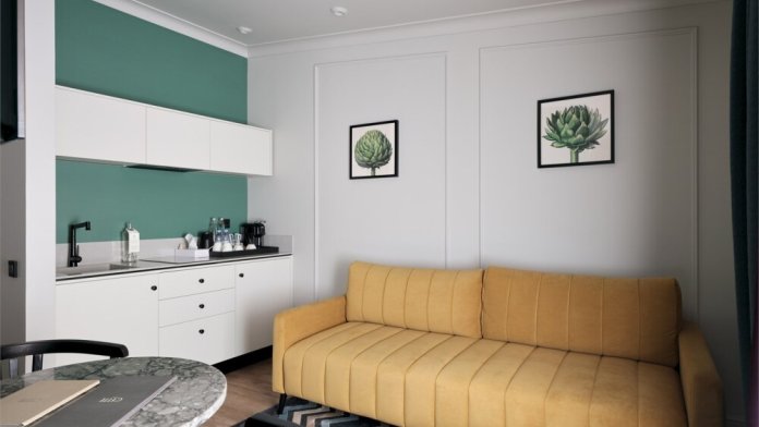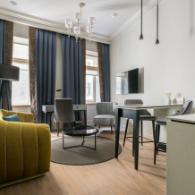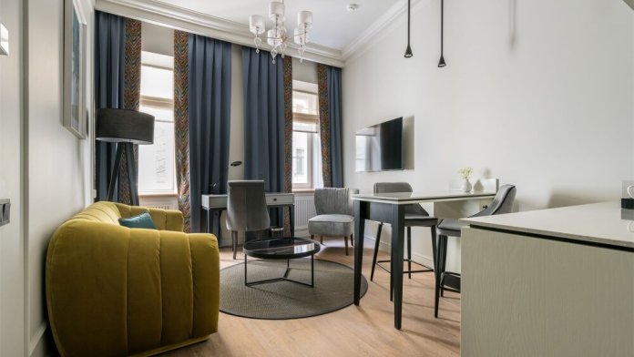 Номера категории Полулюкс – это комфорт и стиль в сочетании с классическим интерьером. Просторный номер располагает большими удобными кроватями с ортопедическим матрасом и гипоаллергенным постельным бельем, ванной, отдельной зоной с кухонной гарнитурой, современным техническим оснащением, шторами Блэк-аут.