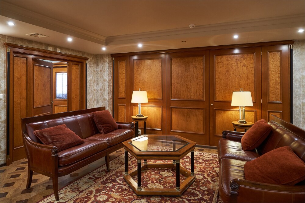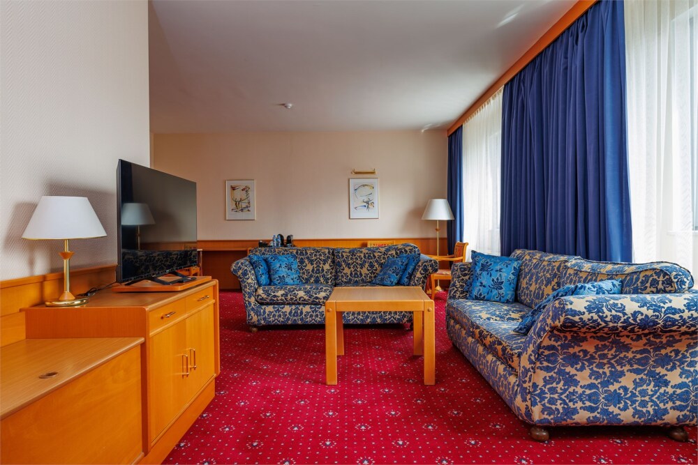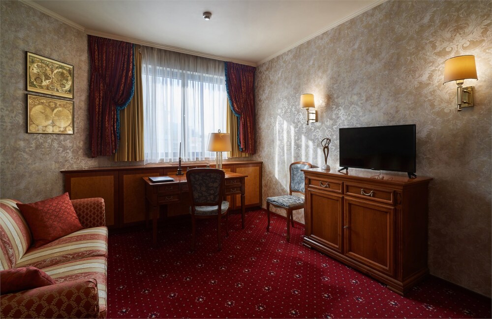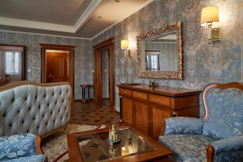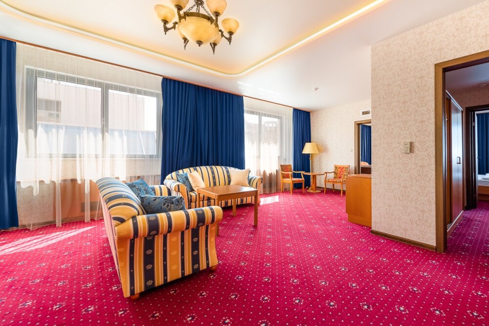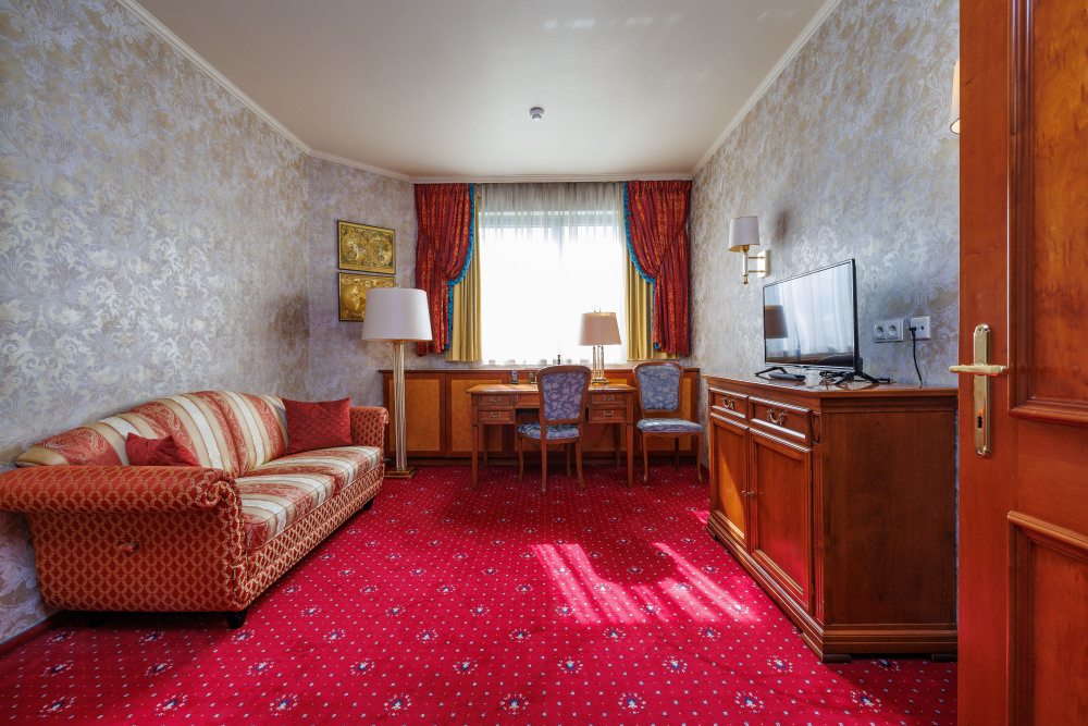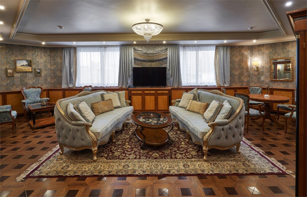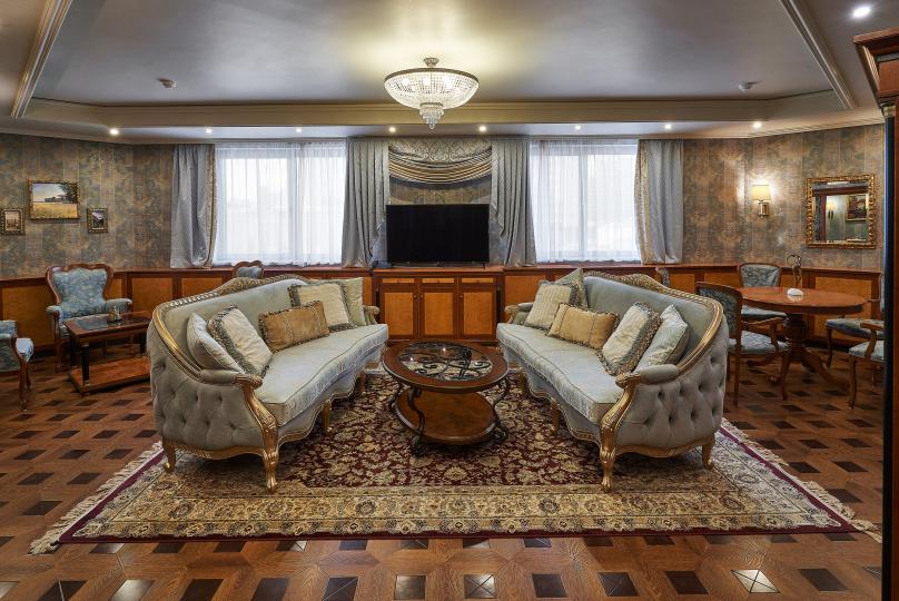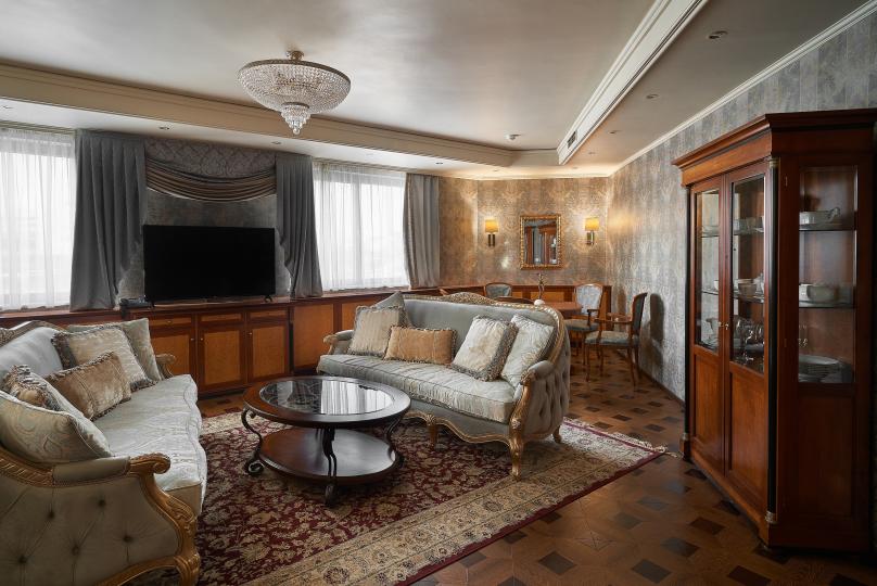 Трехкомнатные апартаменты: гостиная, спальная комната и кабинет. В номере в каждой комнате ж/к телевизор, мини-бар, телефон, сейф, весы, халат, комплект полотенец, тапочки. Смена постельного белья каждый день.