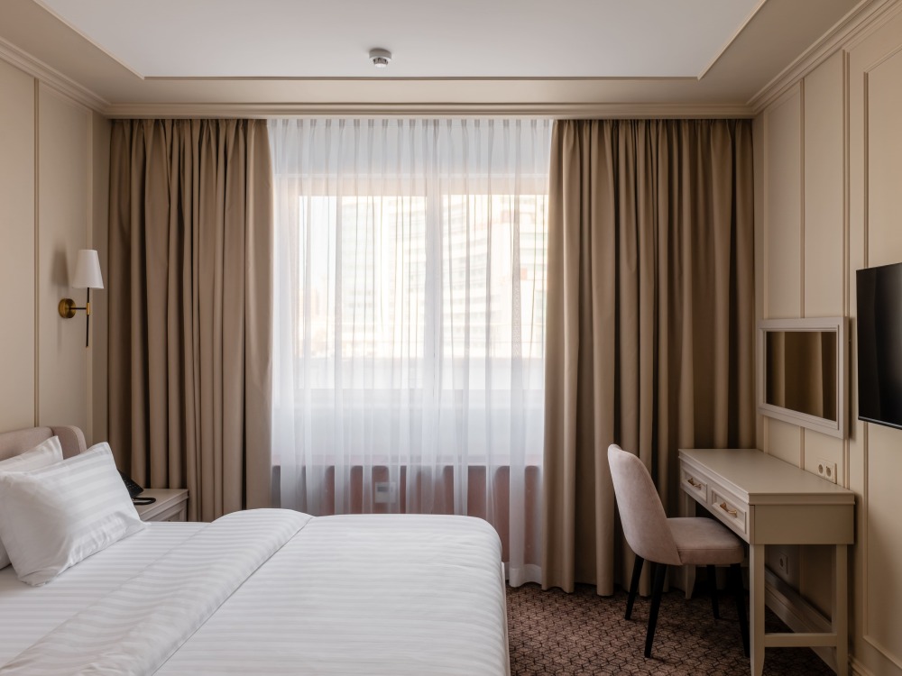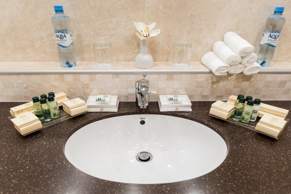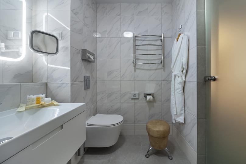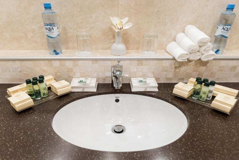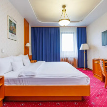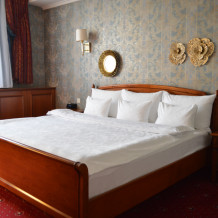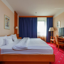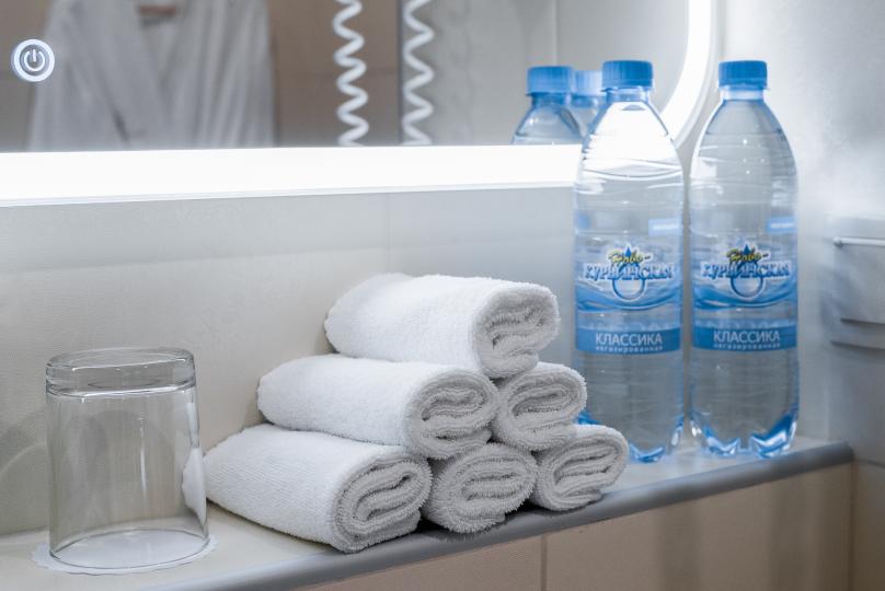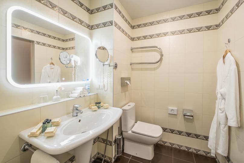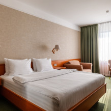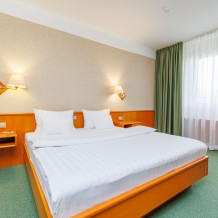 В номере: большая двуспальная кровать, собственная ванная комната, ж/к телевизор, телефон, сейф, гладильная станция, халат, комплект полотенец, гигиенический набор, фен, тапочки.