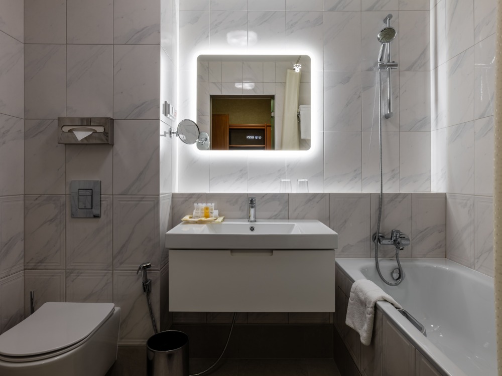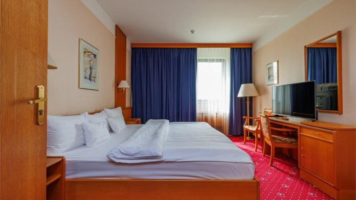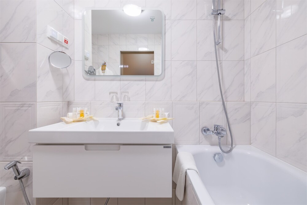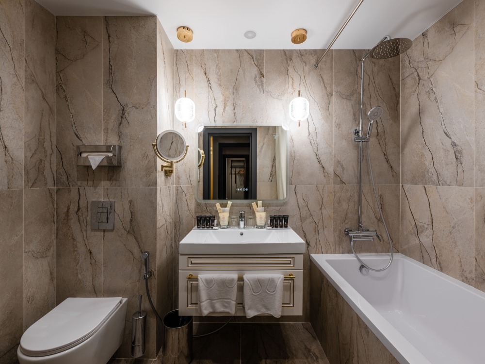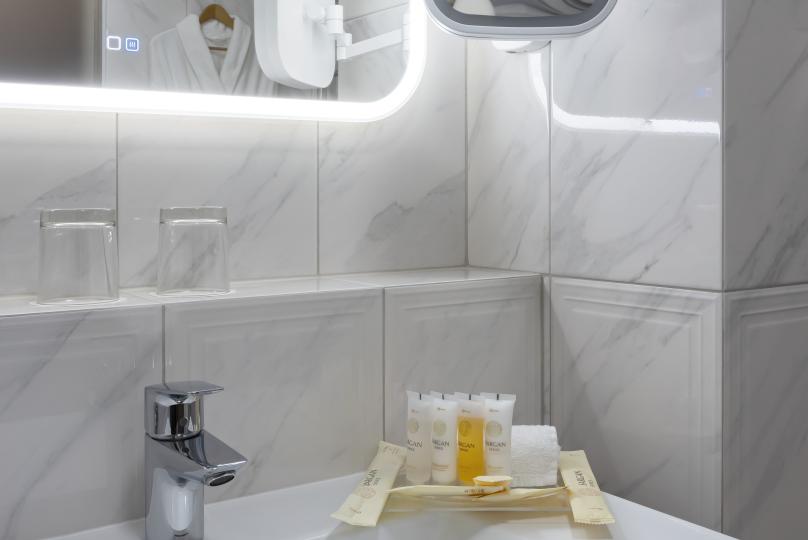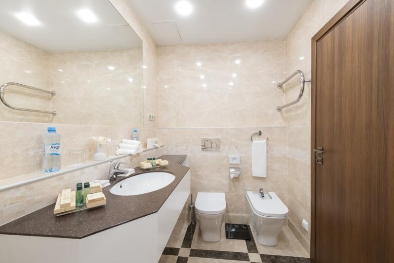 В номере: большая двуспальная кровать, собственная ванная комната, ж/к телевизор, телефон, сейф, гладильная станция, халат, комплект полотенец, гигиенический набор, фен, тапочки.