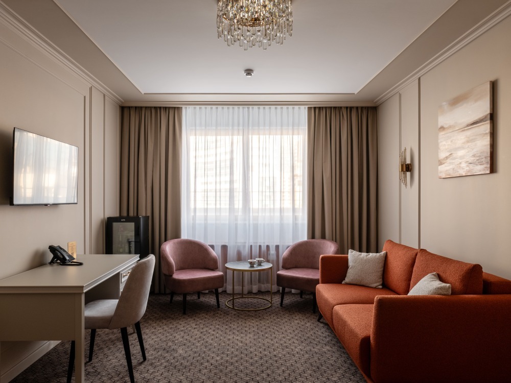 Двухкомнатный номер категории Люкс (гостиная и спальная комната с большой двуспальной кроватью).
