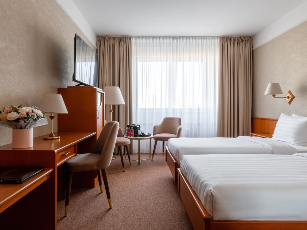 К услугам гостей: 131 просторных номеров от Стандартного до Президентских апартаментов. В каждом номере спутниковое телевидение (22 канала), мини-бар, сейф, кондиционер, ванная комната со всеми необходимыми туалетными принадлежностями, фен, онлайн заказ услуг. Для детей в номерах предоставляется специальная косметика. Во всех номерах отеля работает система кондиционирования (работающая на охлаждение в летнее время и на обогрев в зимнее время). В отеле имеется 2 номера для людей с ограниченными возможностями.