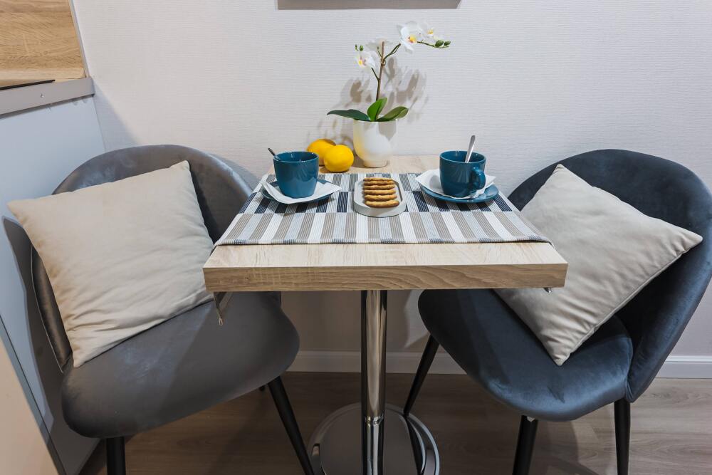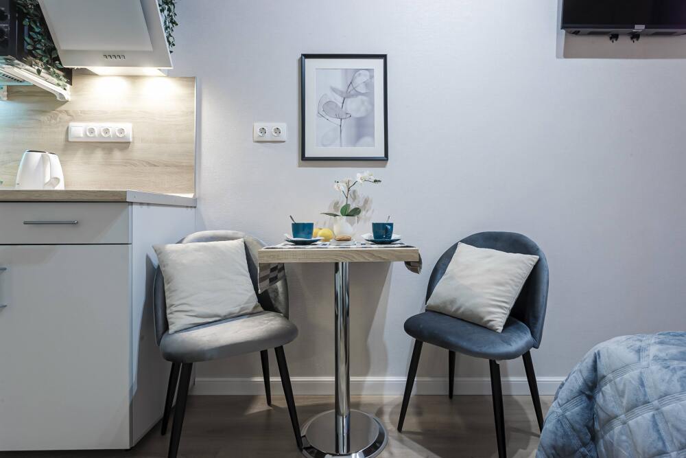 Для вашего удобства мы предоставляем посуду, необходимую технику, средства гигиены. В каждой квартире современный телевизор с функцией Смарт ТВ. Белоснежное постельное белье и махровые полотенца стирает прачечная. Всегда горячая вода 24/7, вы сможете принять душ после дороги.
