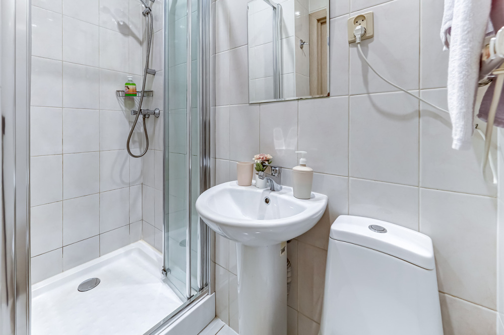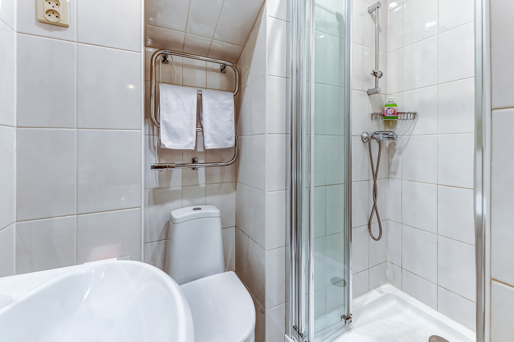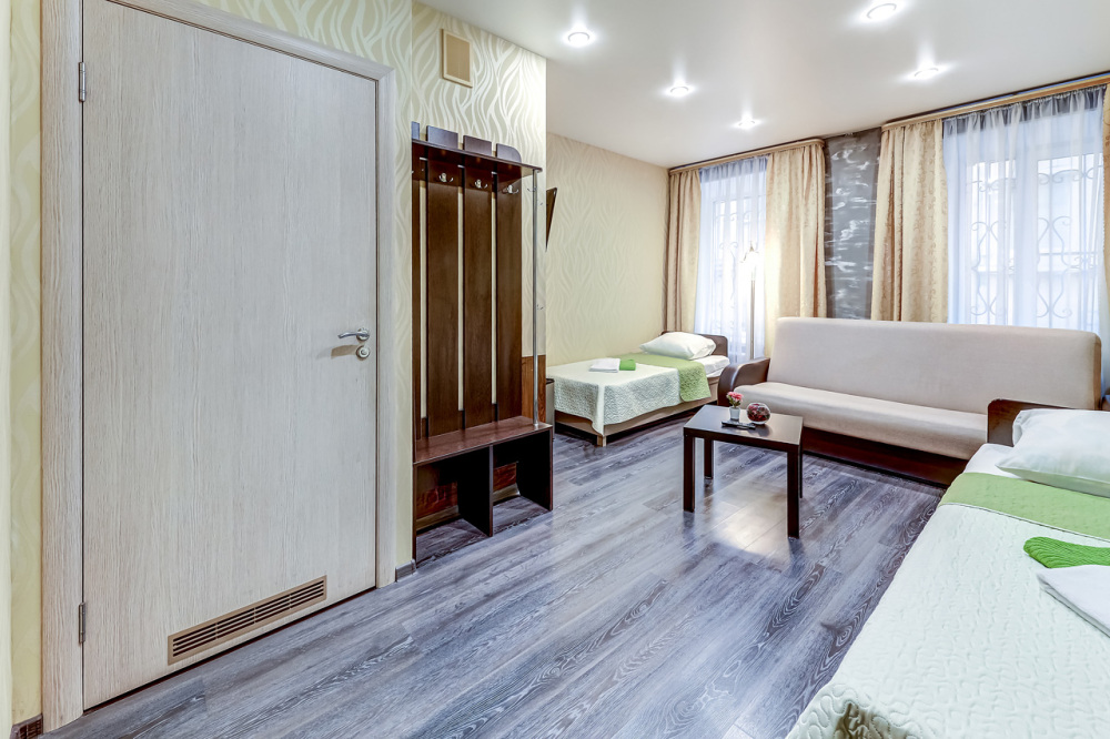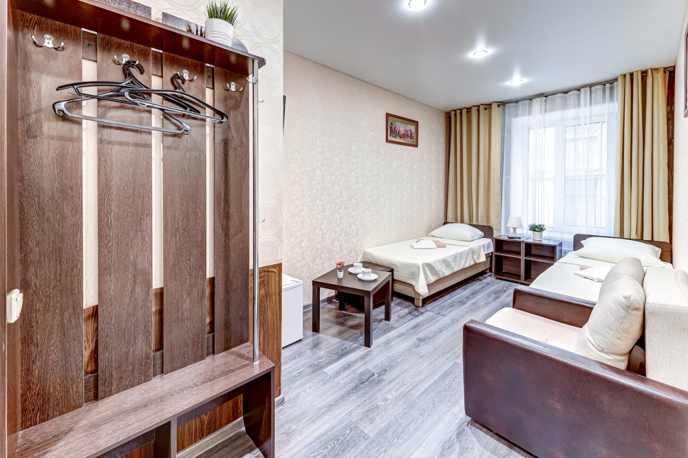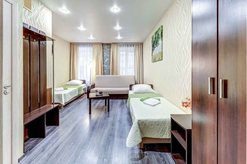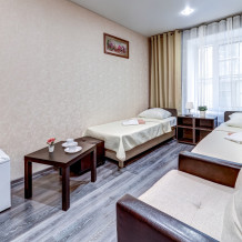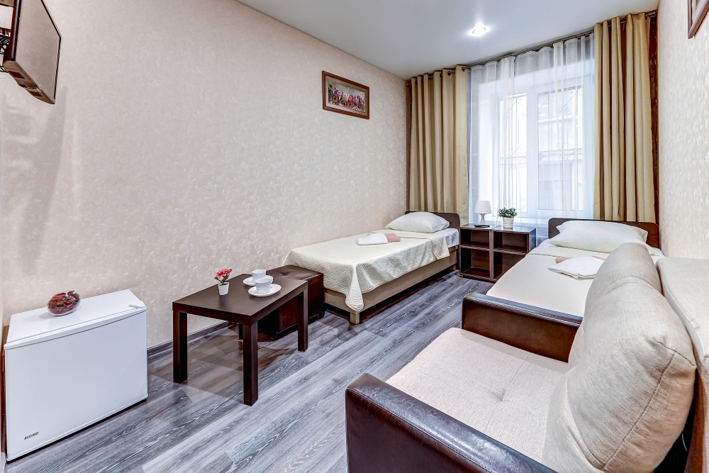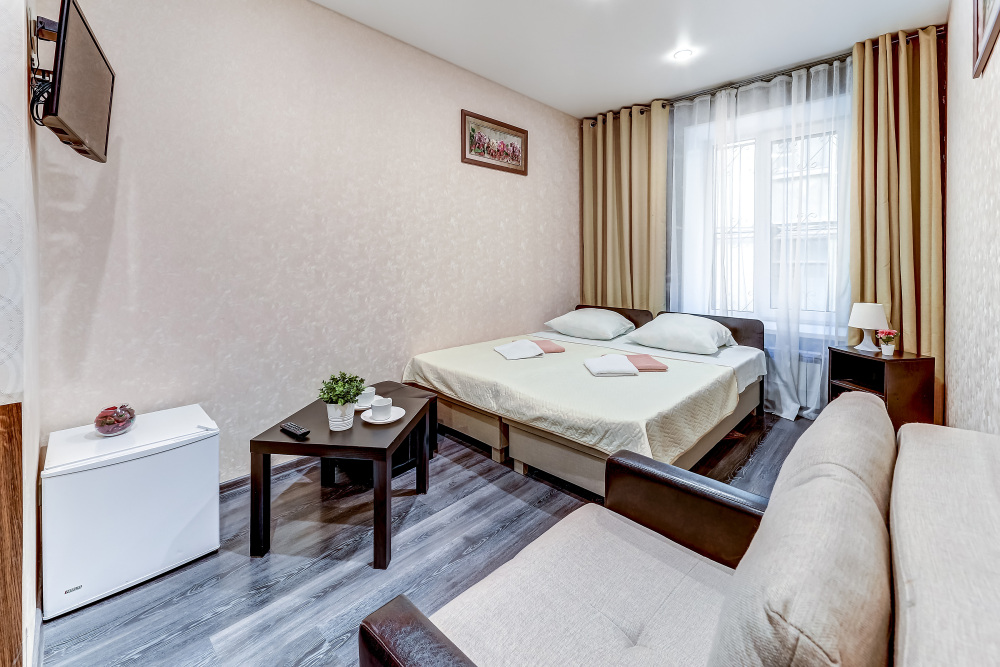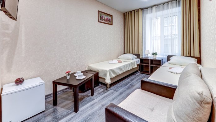 В номере две односпальных кровати и двуспальный диван. Душ и туалет в номере. Вид из окна во двор.