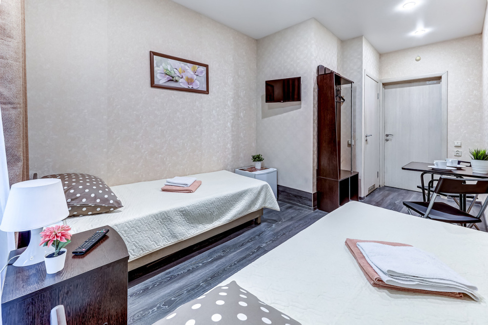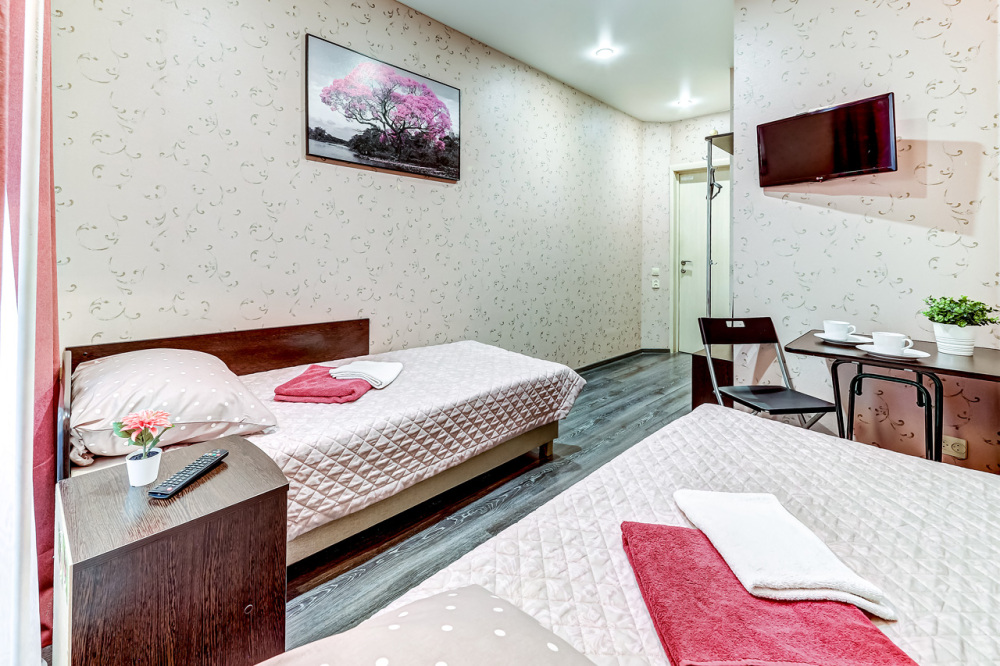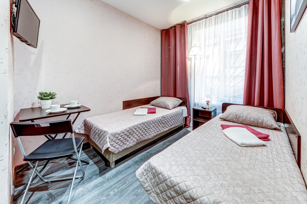 Двухместный номер с двумя односпальными кроватями. Кровати можно трансформировать в одну двуспальную. Вид из окна во двор.