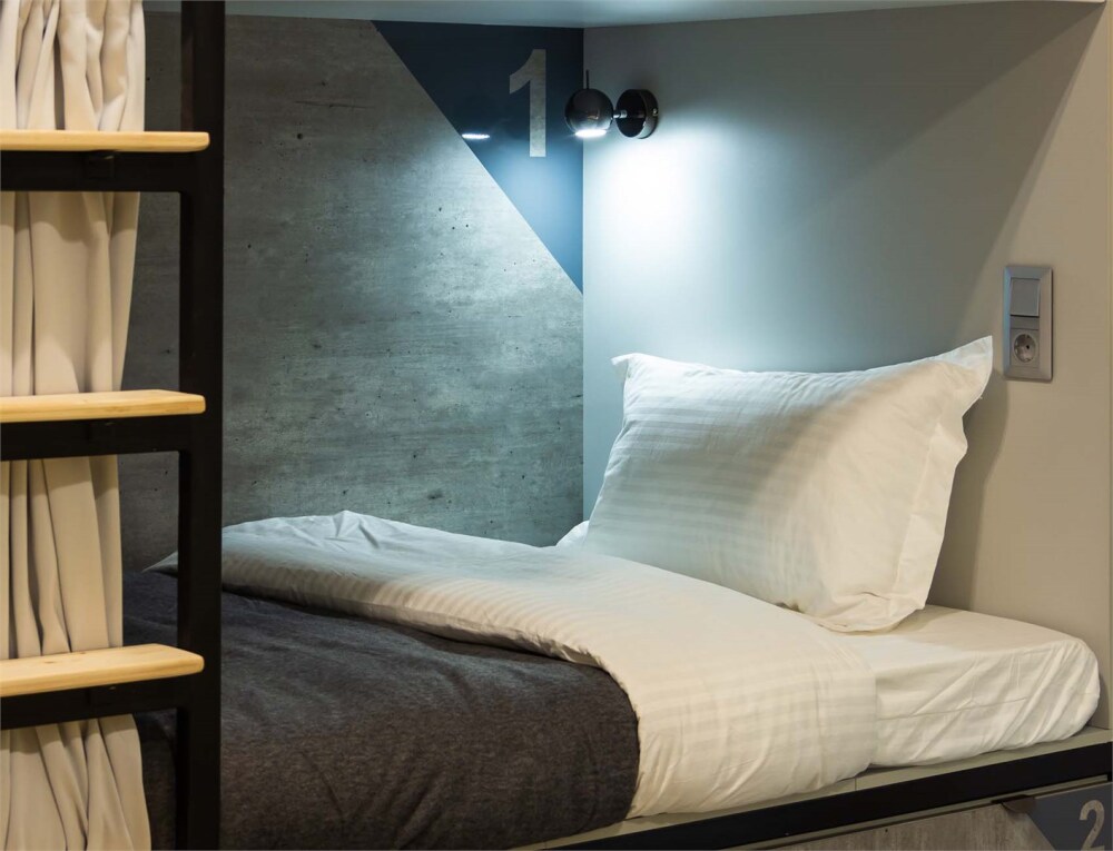 Индивидуальное одноместное пространство 90/200 в общей 10 местной комнате, отгороженное black out шторой, с ортопедическим матрасом, LED светильником и розеткой 220V.