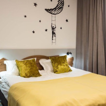 Однокомнатный комфортабельный номер с двуспальной кроватью с ортопедическим матрасом 180/200 (может быть как две кровати 90/200) и двухъярусной кроватью со спальным местом 90/200 идеально подходит для семьи с двумя детьми за небольшие деньги. Прикроватная тумба, рабочий стол и стул, телевизор. Индивидуальная ванная комната: душевая кабина, фен, полотенца.