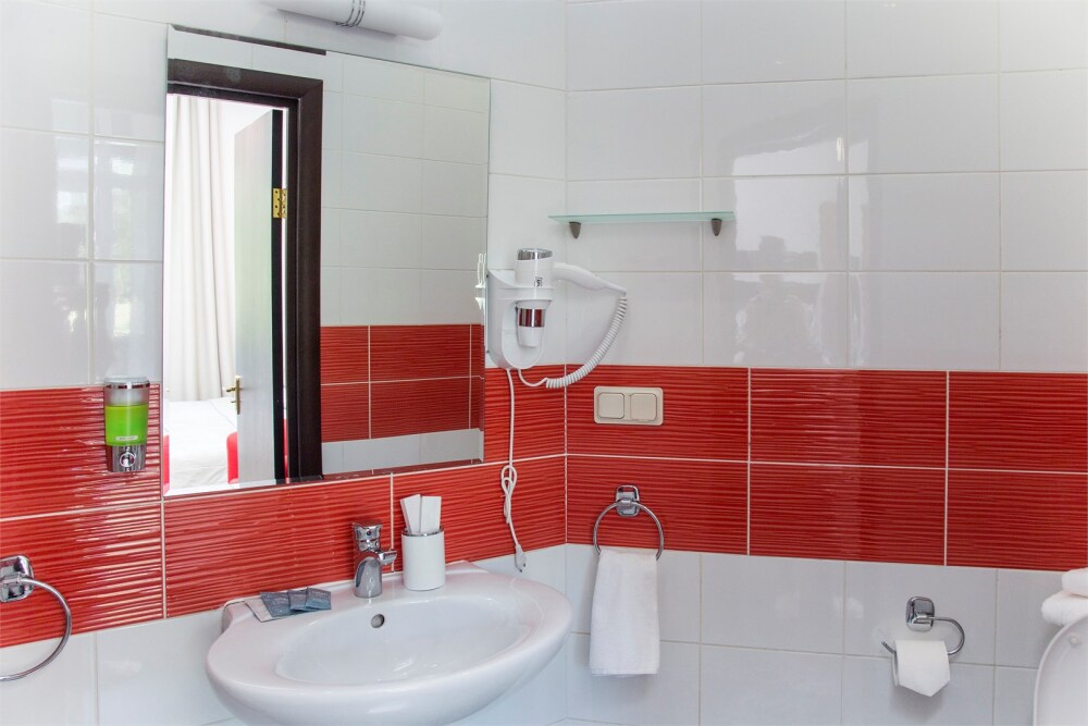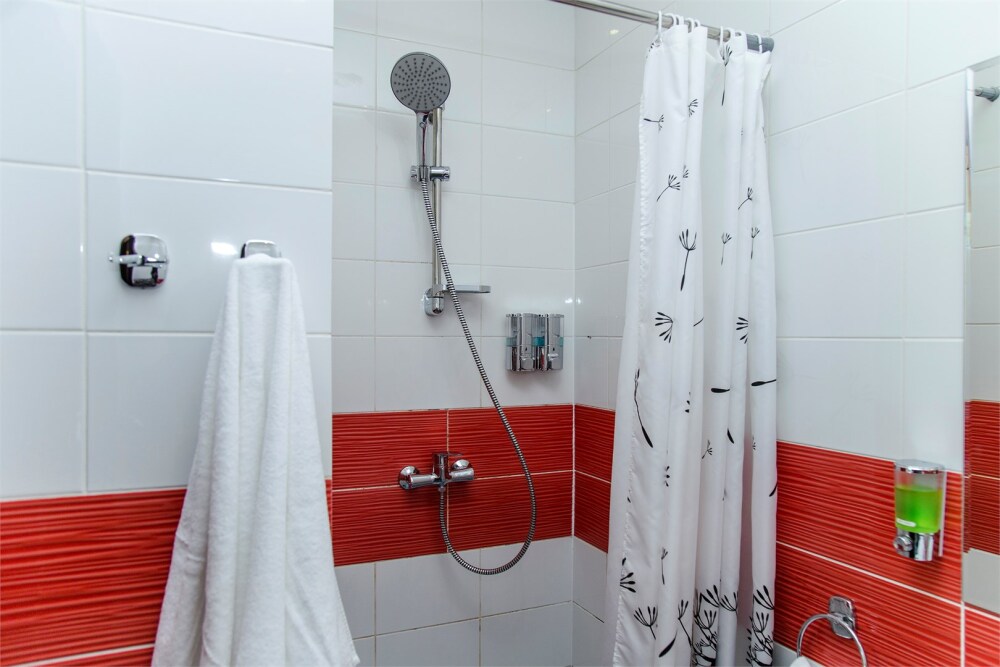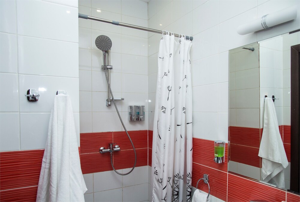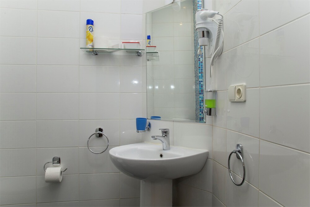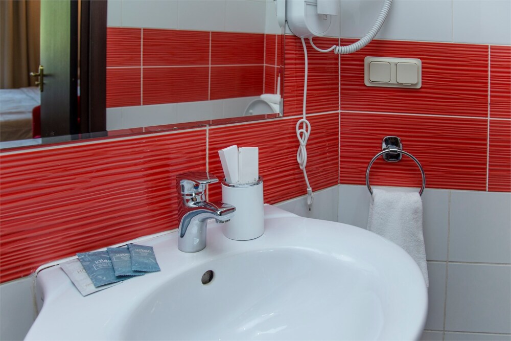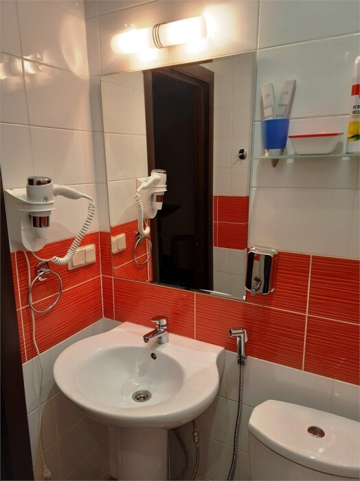 Душ, унитаз, раковина, зеркало с полкой и подсветкой, электрический фен, розетка, полочка в душе. Полотенца, тапочки одноразовые, туалетные принадлежности одноразовые (шампунь, гель для душа, жидкое мыло), чайный набор (чай черный, чай зеленый, 2 сахара).