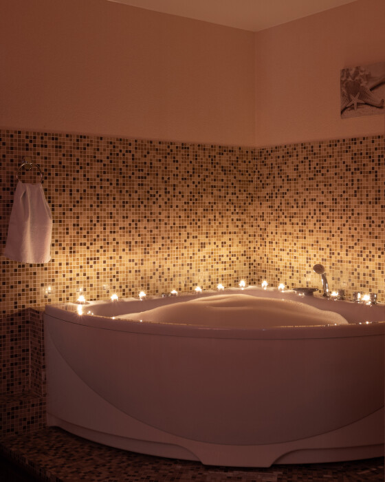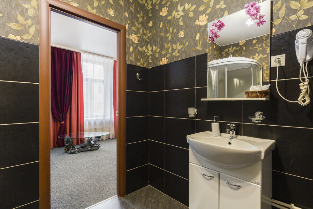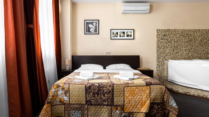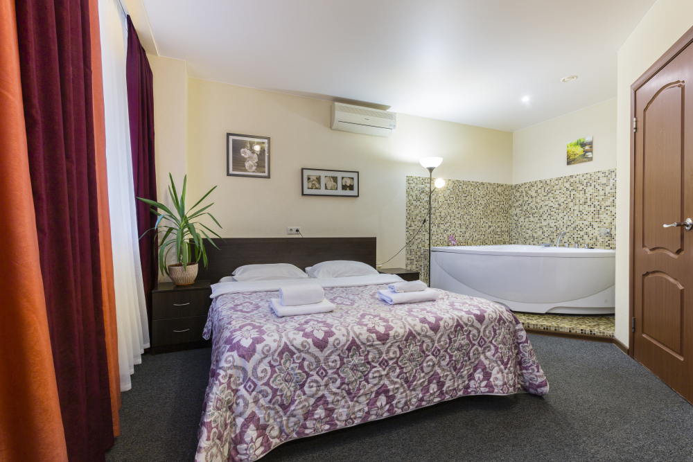 Просторный номер с удобной двуспальной кроватью, рядом с которой установлена гидромассажная ванна. Дополнительно в санузле есть душевая кабина.
