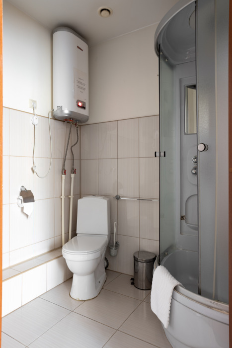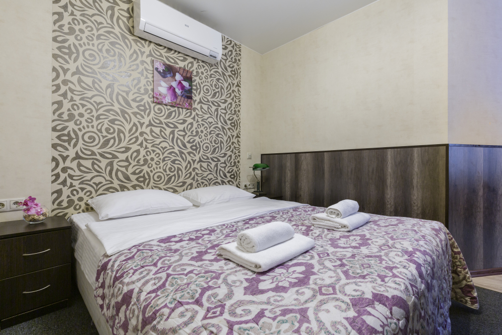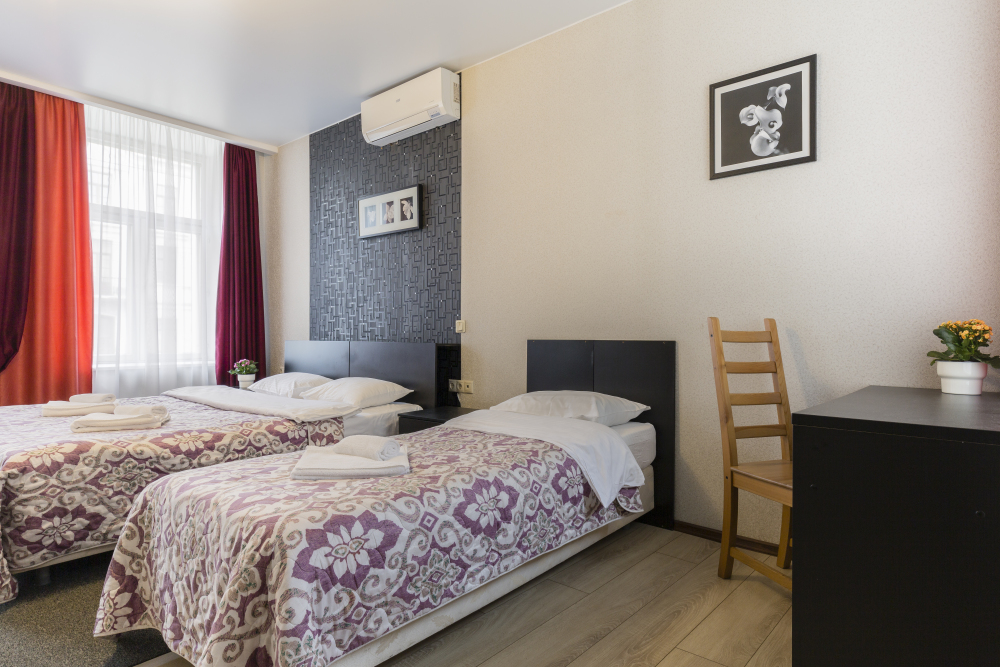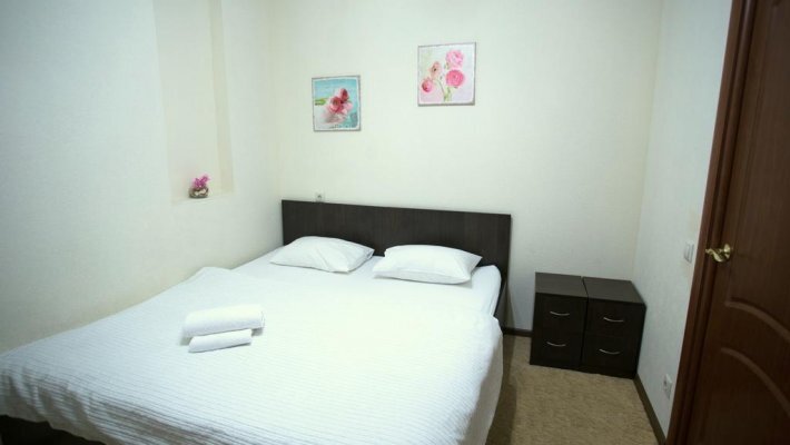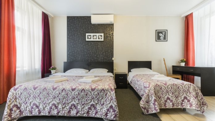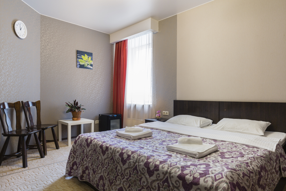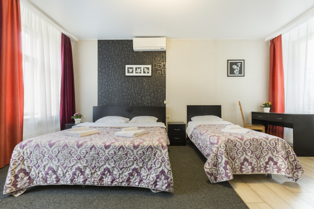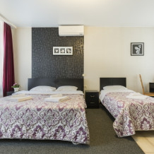 В номерах одна двуспальная и одна односпальная кровати, также возможна установка дополнительных мест - раскладушек