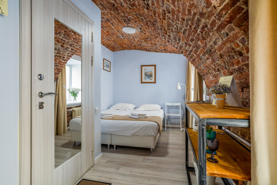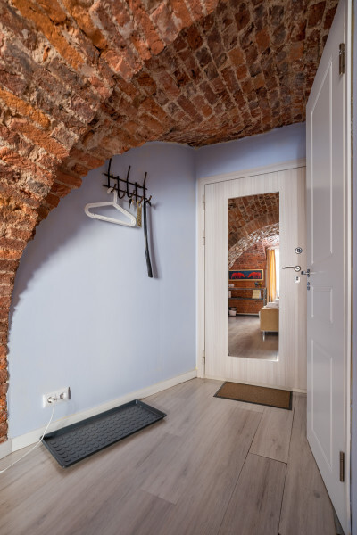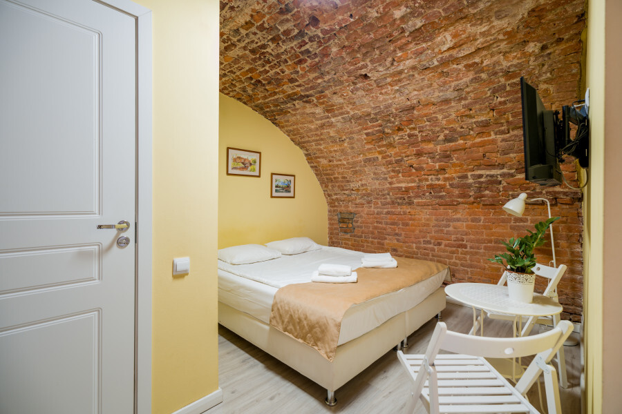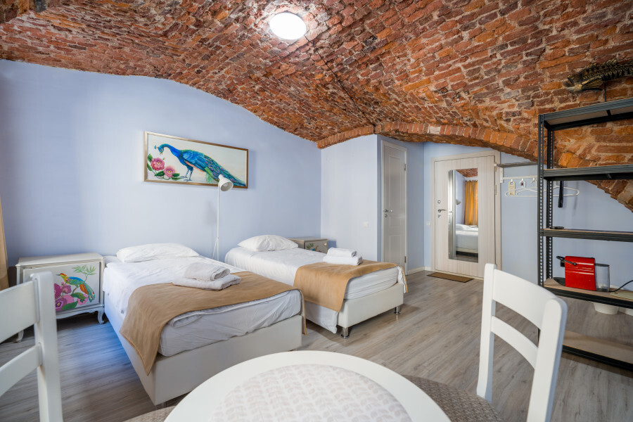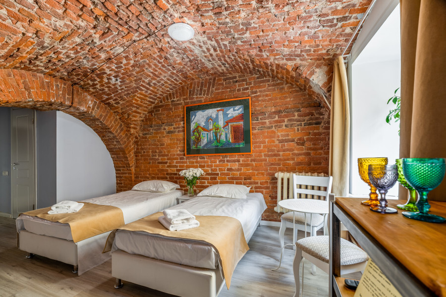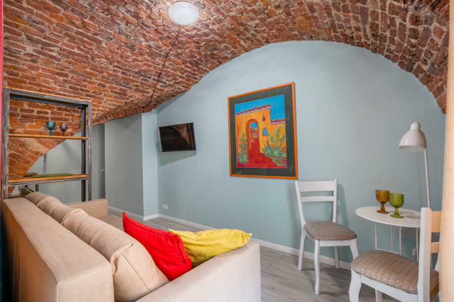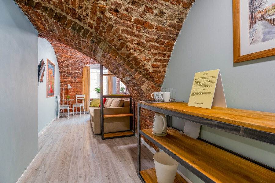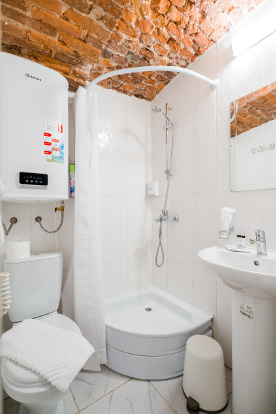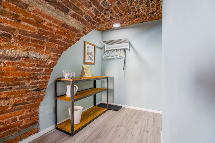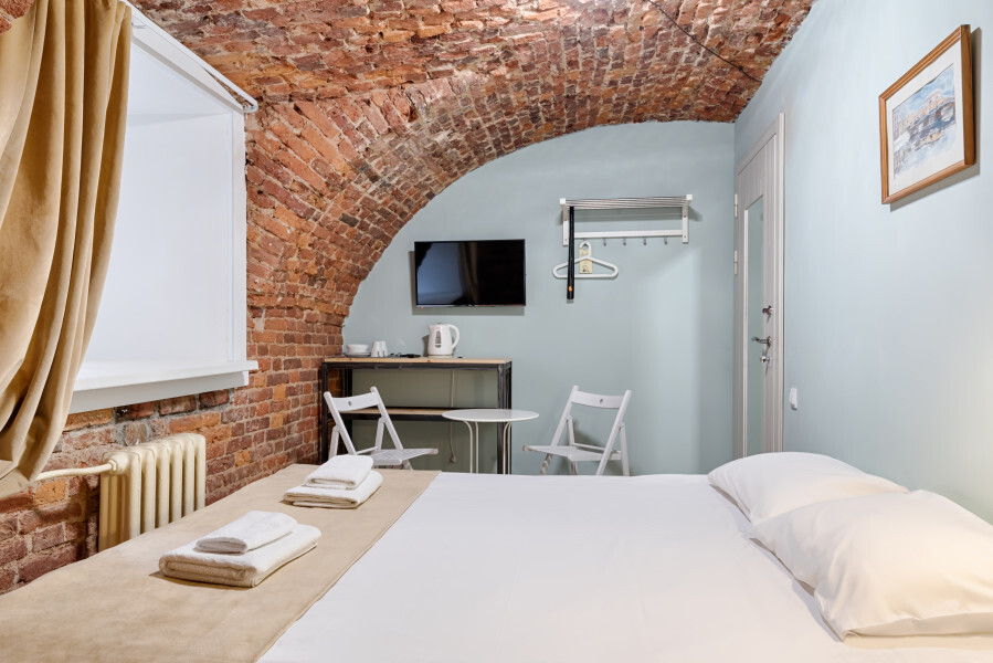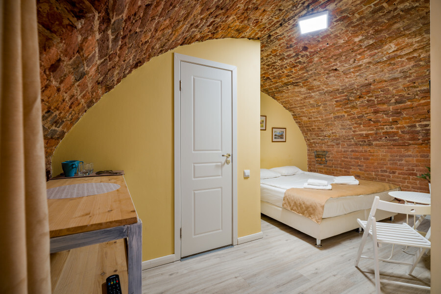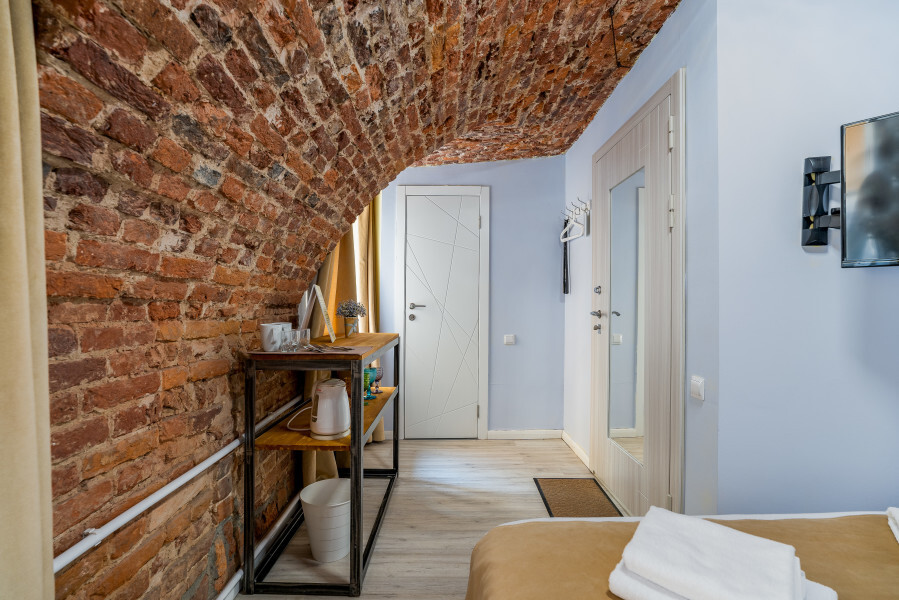 Единственный номер, где сохранилась полукруглая арка старинного помещения каретной при доме Адамини. На потолке - кирпичные своды, являющиеся объектом культурного наследия под охраной государства. Удобная ванная комната с душем, феном, тапочками и набором ванных принадлежностей.