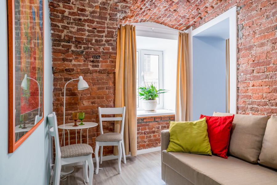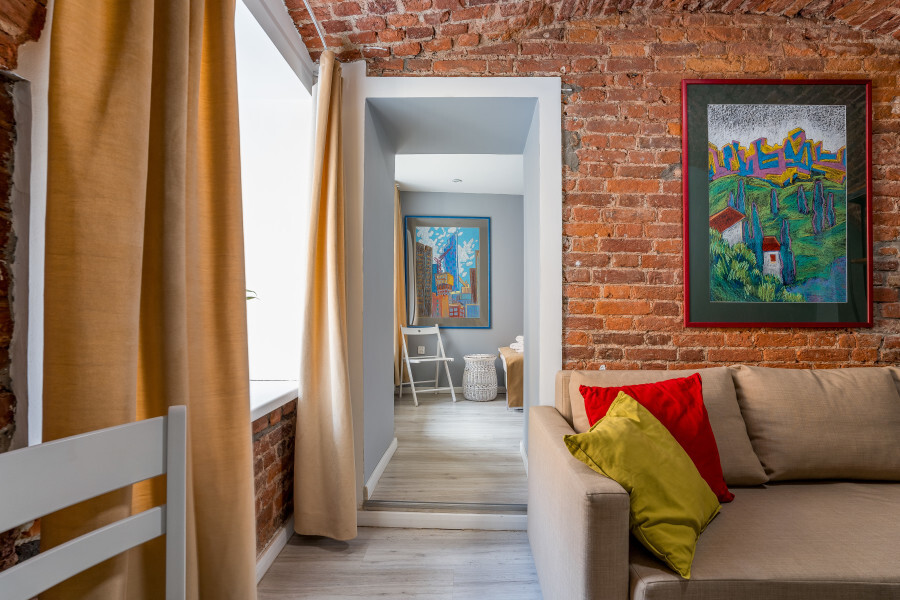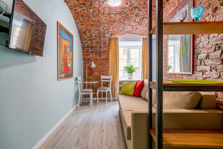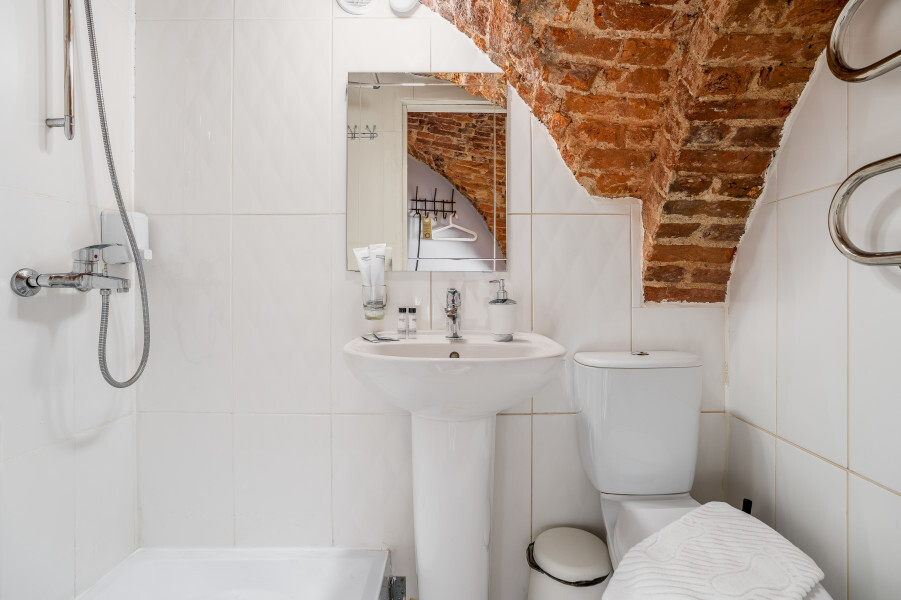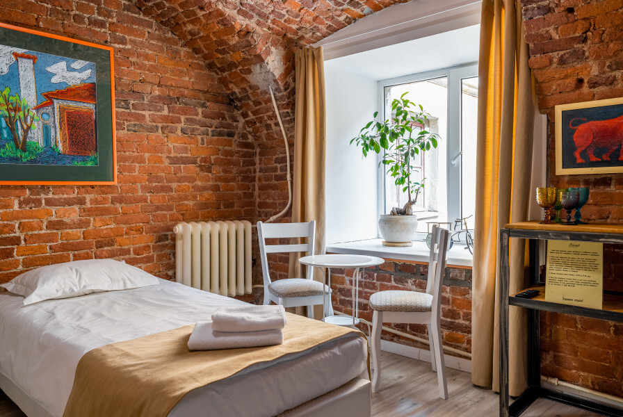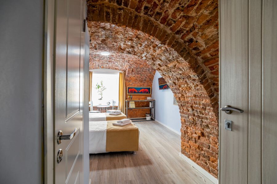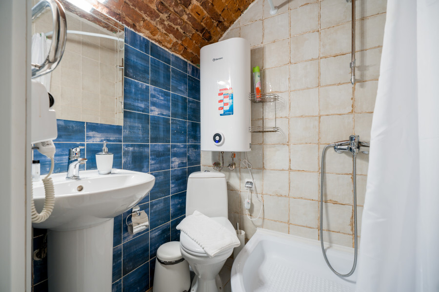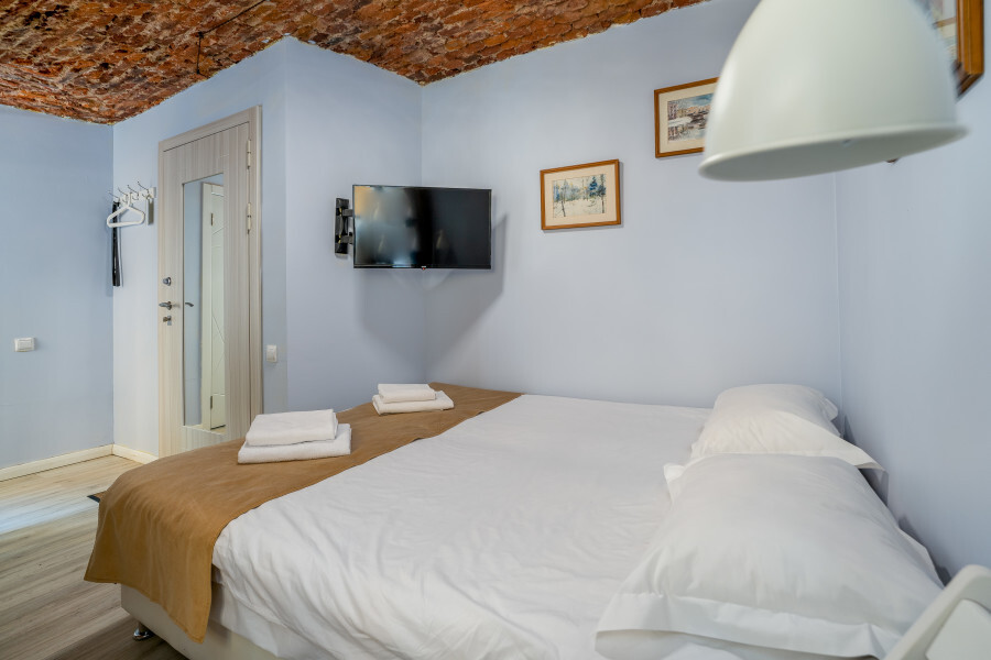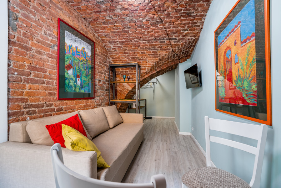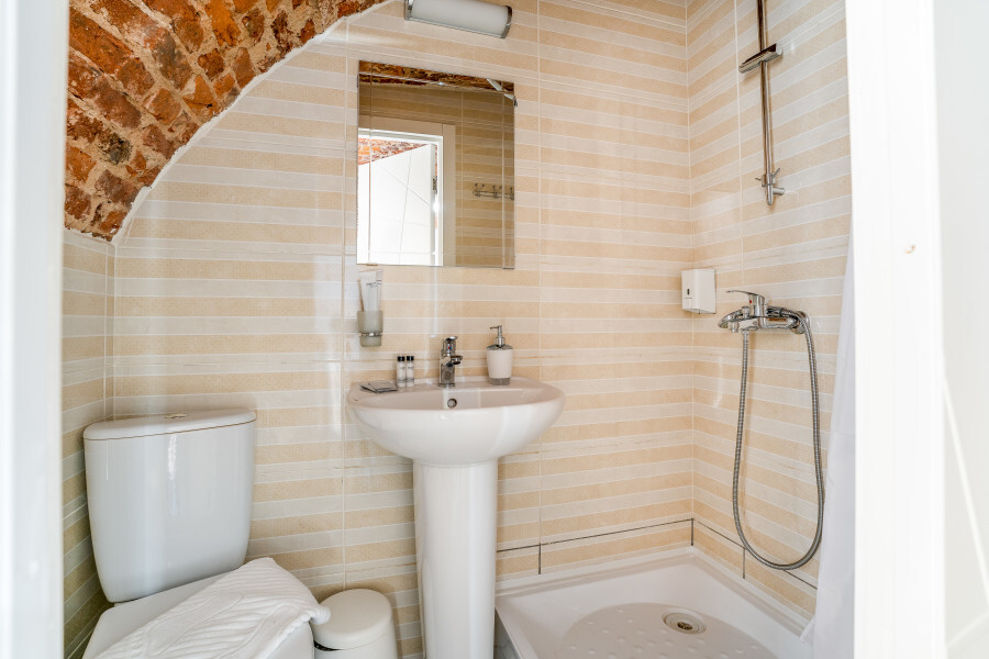 Единственный номер, где сохранилась полукруглая арка старинного помещения каретной при доме Адамини. На потолке - кирпичные своды, являющиеся объектом культурного наследия под охраной государства. Удобная ванная комната с душем, феном, тапочками и набором ванных принадлежностей.