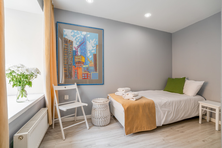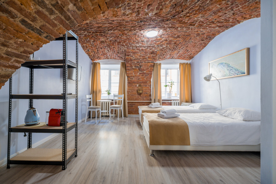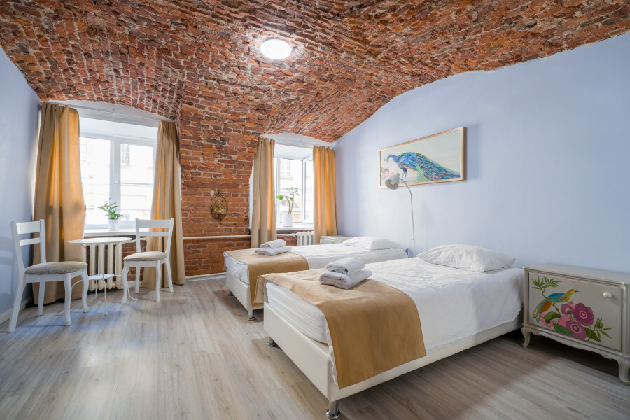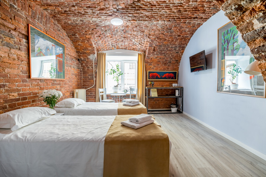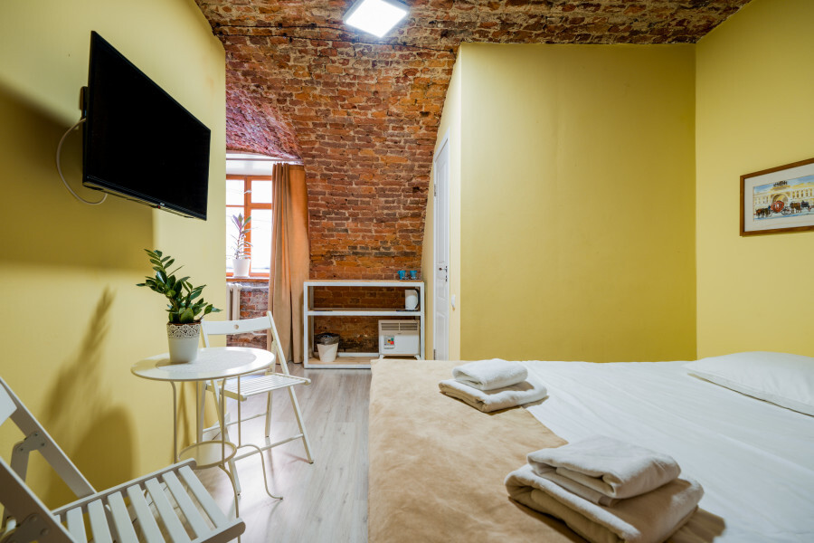 Самый просторный двухкомнатный номер в мини-отеле. Большой, комфортабельный, раскладывающийся диван в одной комнате и односпальная кровать в другой (без двери между ними). Удобные матрасы, качественное белье. Ванная комната с набором косметических принадлежностей, феном и тапочками. Обогреватель, напольный кондиционер, электрочайник и набор посуды. Два окна в тихий двор.