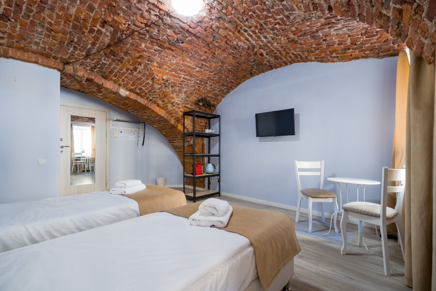 Номер предназначен для проживания одного, двух или трех человек. На выбор - две раздельные кровати или одна большая. А также здесь достаточно места для размещения дополнительного спального места (раскладушки), если проживает и третий человек.