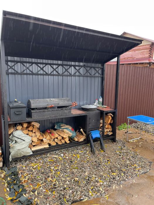 Крытая мангальная зона включает в себя: мангал с крышкой для барбекю, 2 решетки для жарки, комплект прочных шампуров, казан, печь, шумовки, коптильня, кочерга и совок.