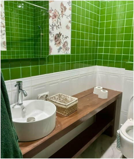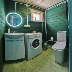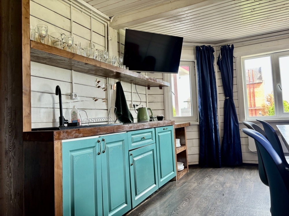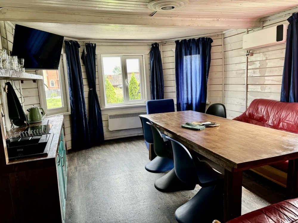 Русская баня находится внутри дома и входит в стоимость аренды. В доме: 4 спальни, кухня-гостиная для застолья и танцев, санузел, предбанник с душем, русская банька на дровах (гости топят сами), холодильник, телевизор со смарт-тв, wi-fi, микроволновая печь, плита, электрочайник, кондиционер, посудомоечная машина, стиральная машина, система «теплый пол» на первом этаже, посуда, приборы, сковорода, кастрюли, постельное белье и полотенца, шампунь, кондиционер, гель для душа, мыло