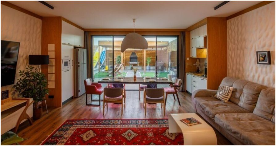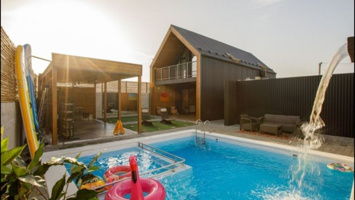 Двухэтажный дом с бассейном и открытой террасой на берегу Каспия. Бассейн с подогревом, водопадом и детской зоной с джакузи.