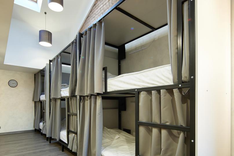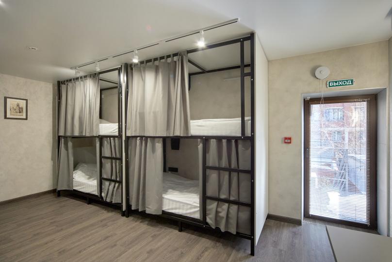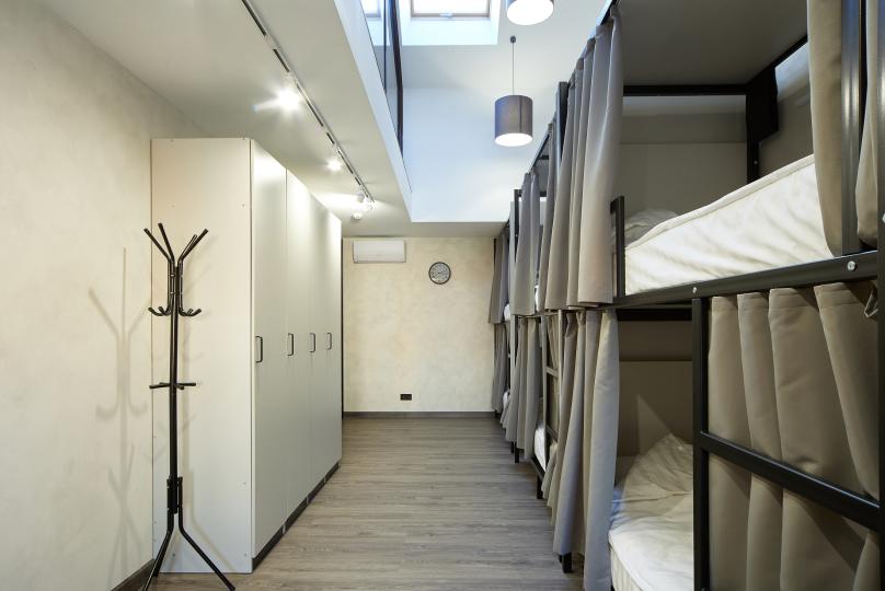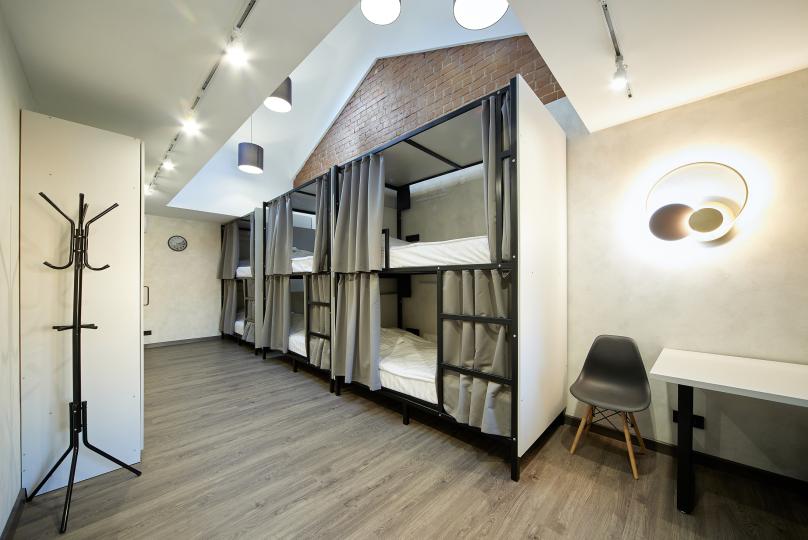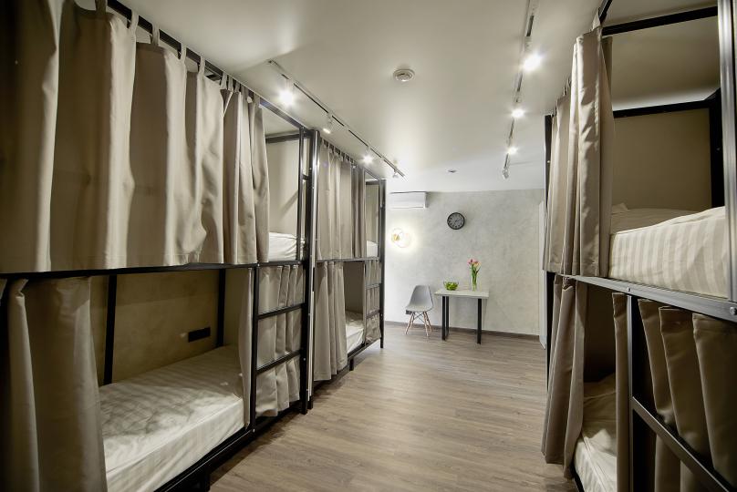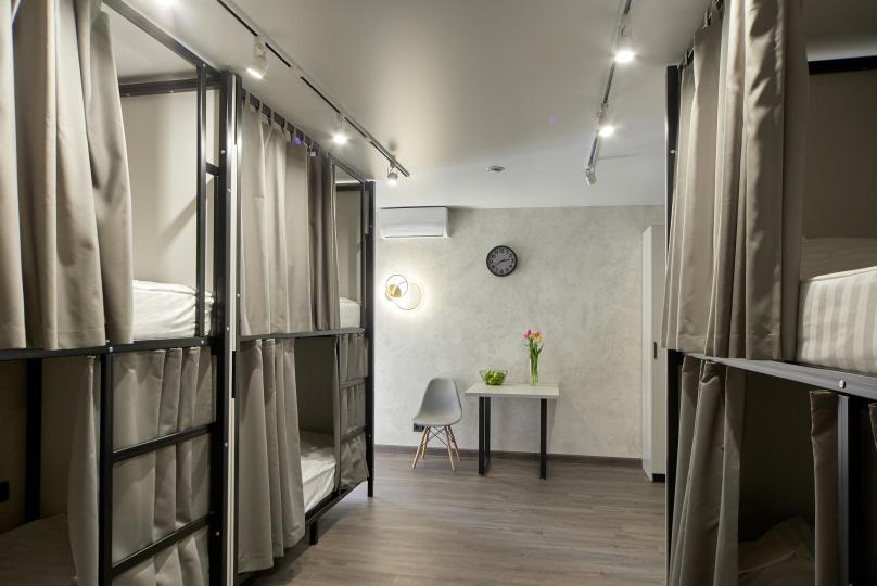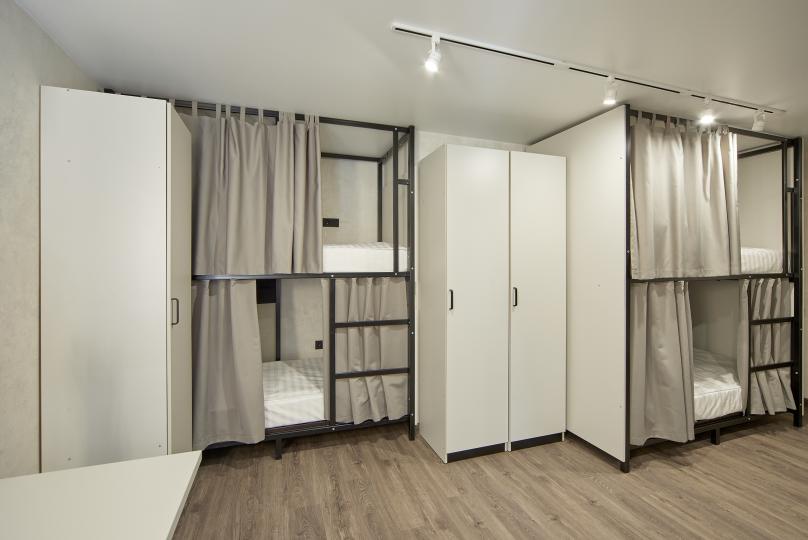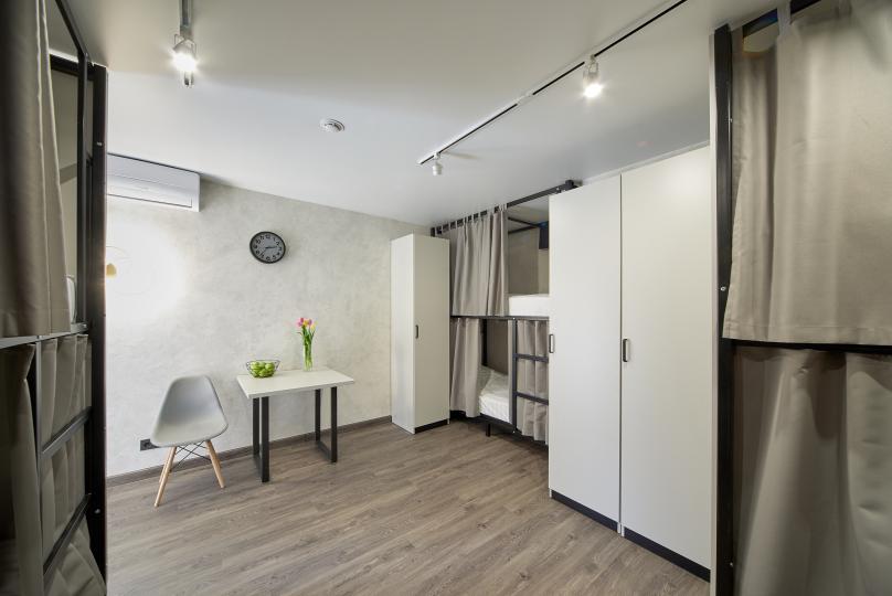 8 койко-мест на двухъярусных кроватях. Комплектация: шкаф, стул, стол, кондиционер. Удобства на этаже.