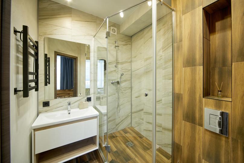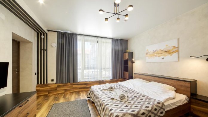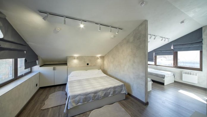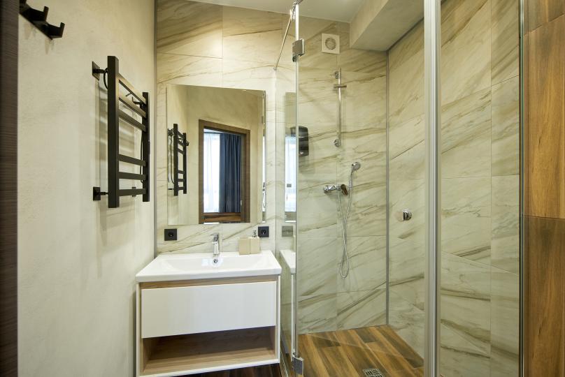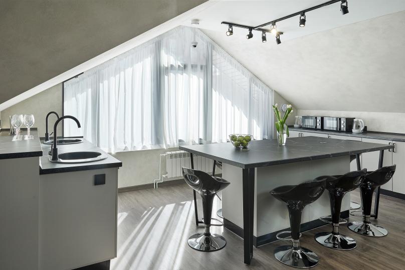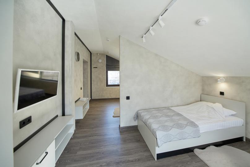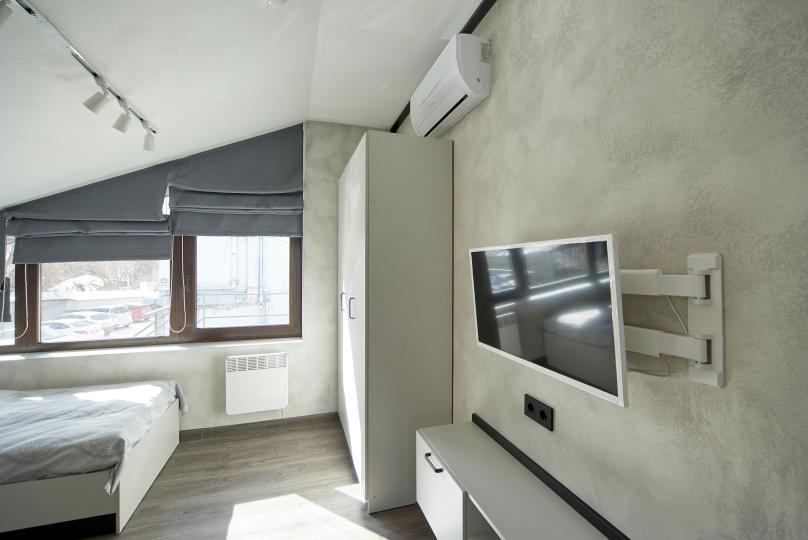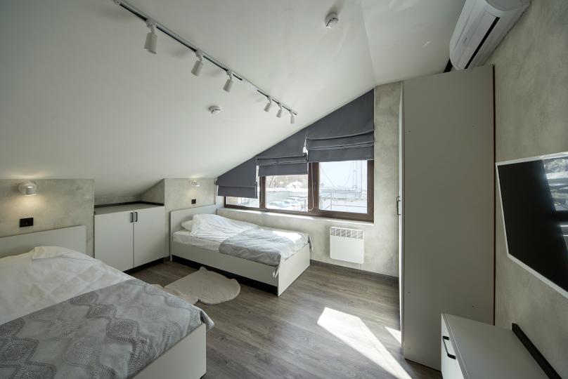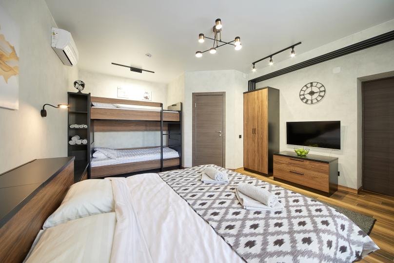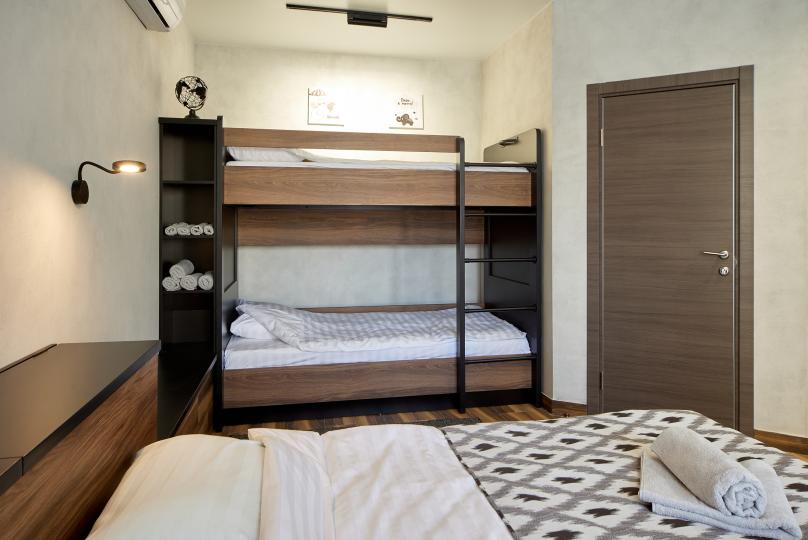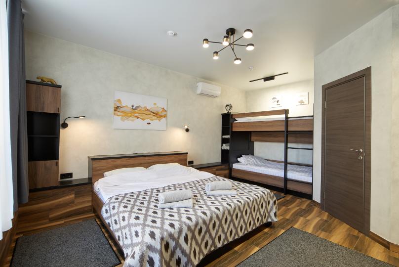Площадь 25 кв., кровать 180*200 и двухъярусная кровать. Санузел в номере. Комплектация: Smart TV, кондиционер, обогреватель, фен, шкаф, стулья.