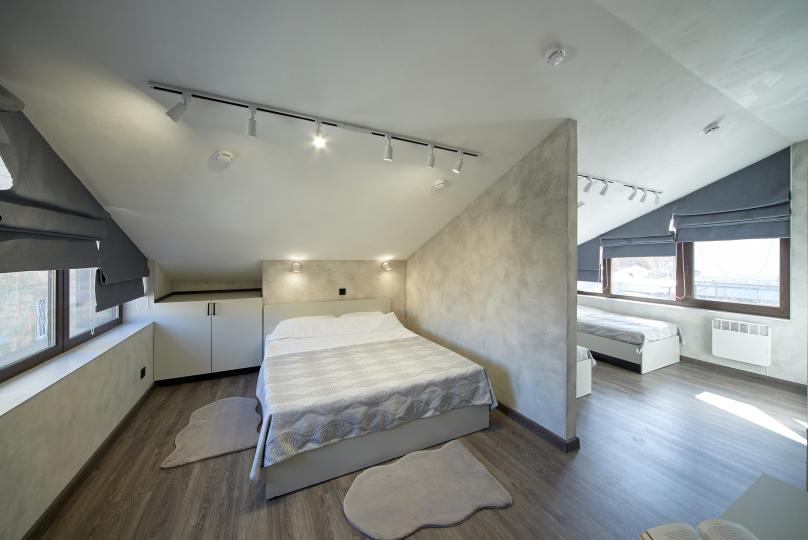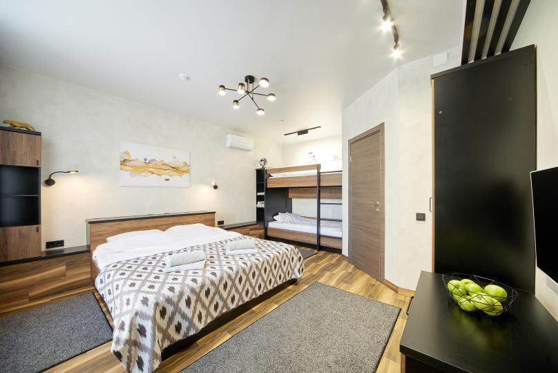 Кровать 160*200 и 2 односпальные кровати 90*200, удобства на этаже. Комплектация: Smart TV, кондиционер, обогреватель, фен, шкаф, стулья.