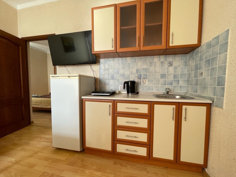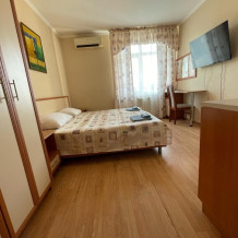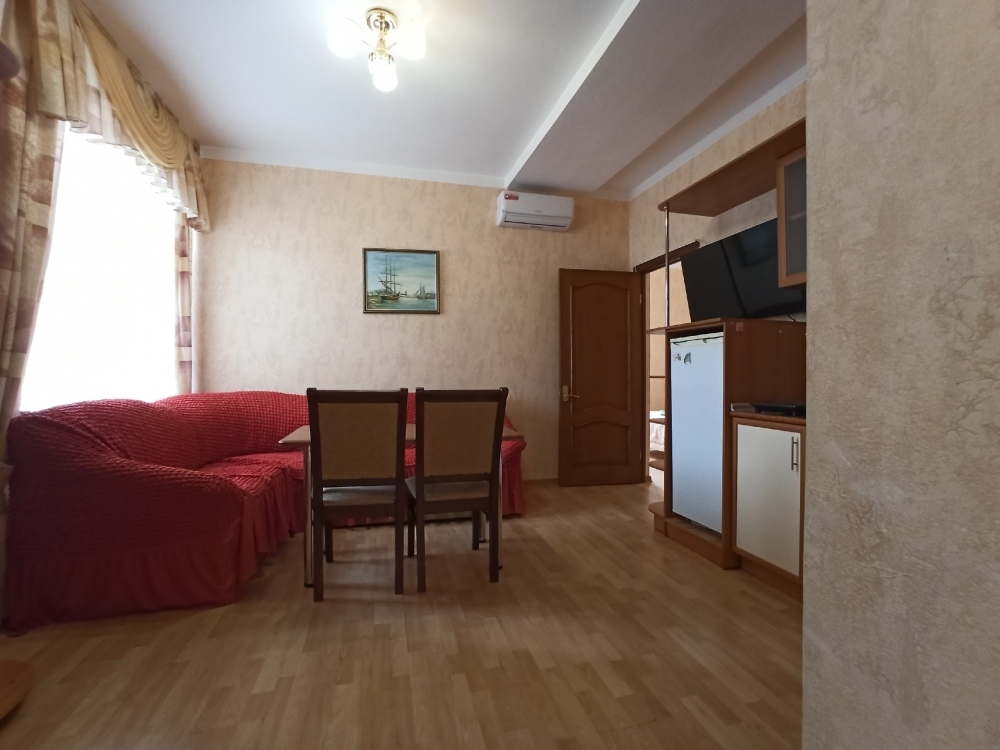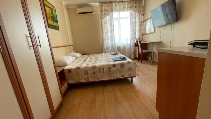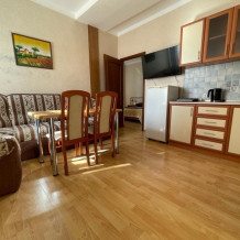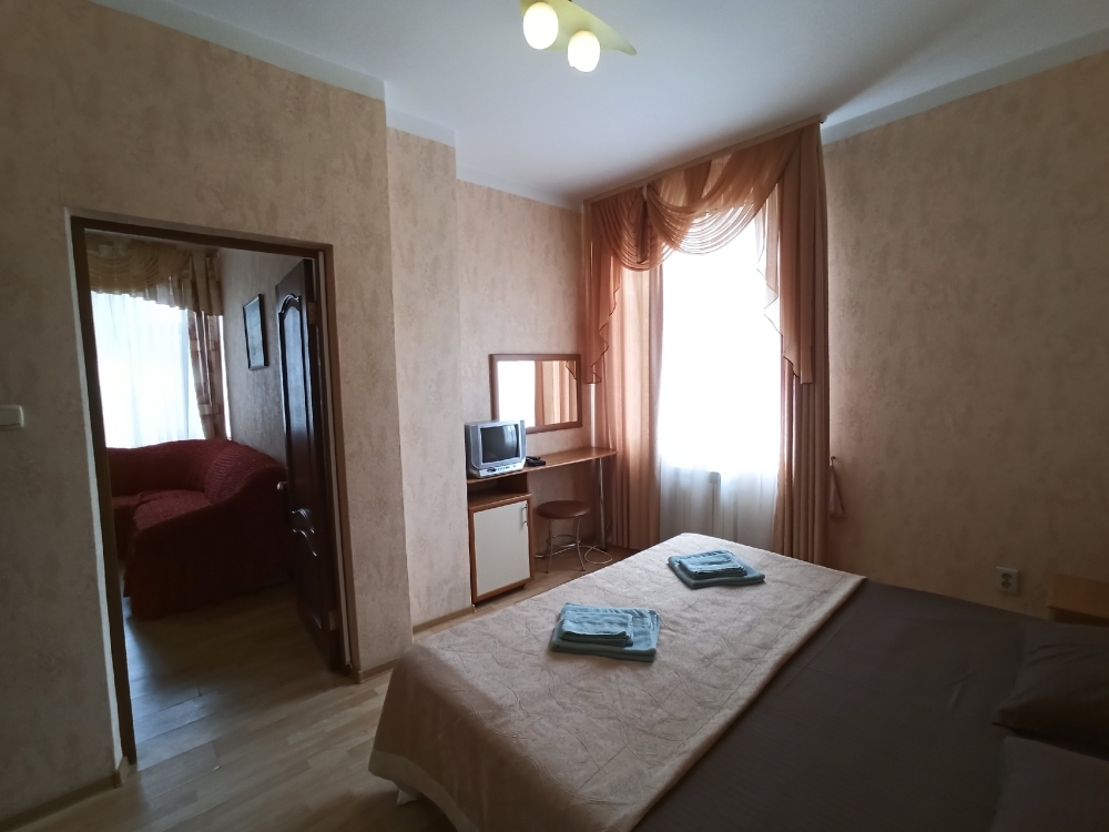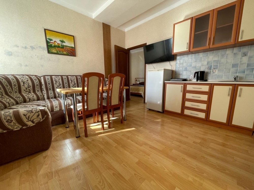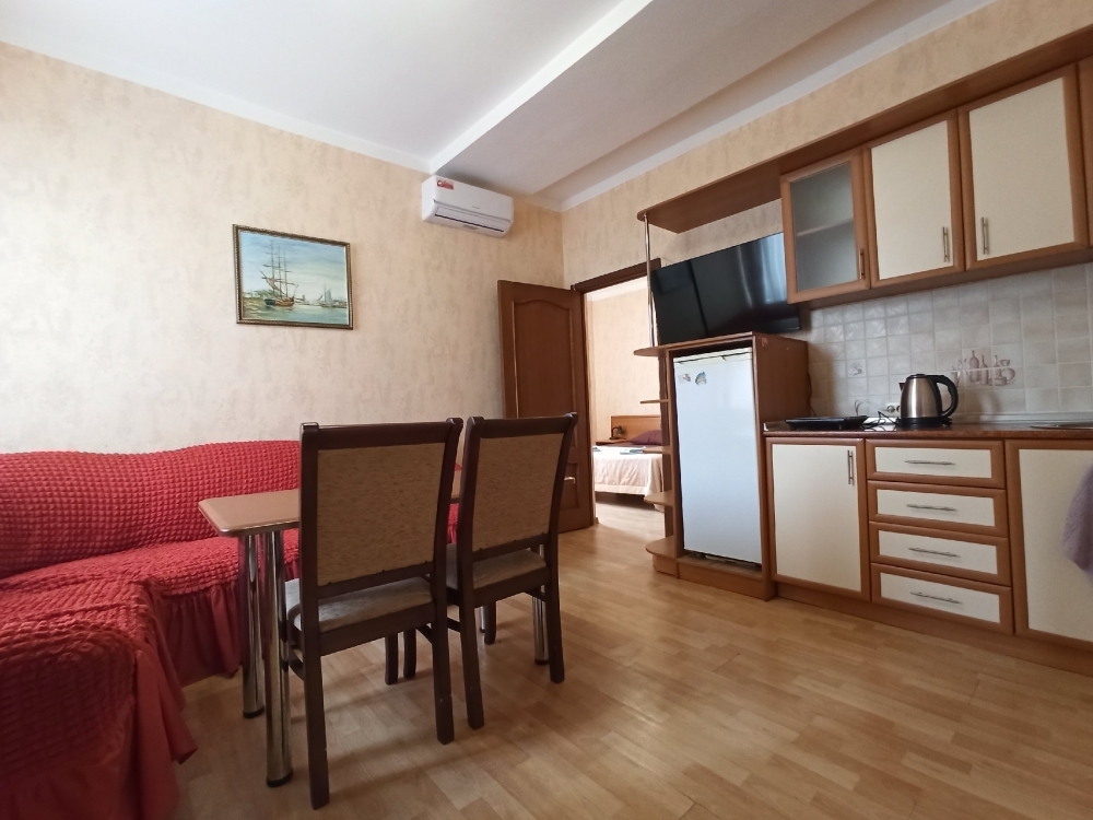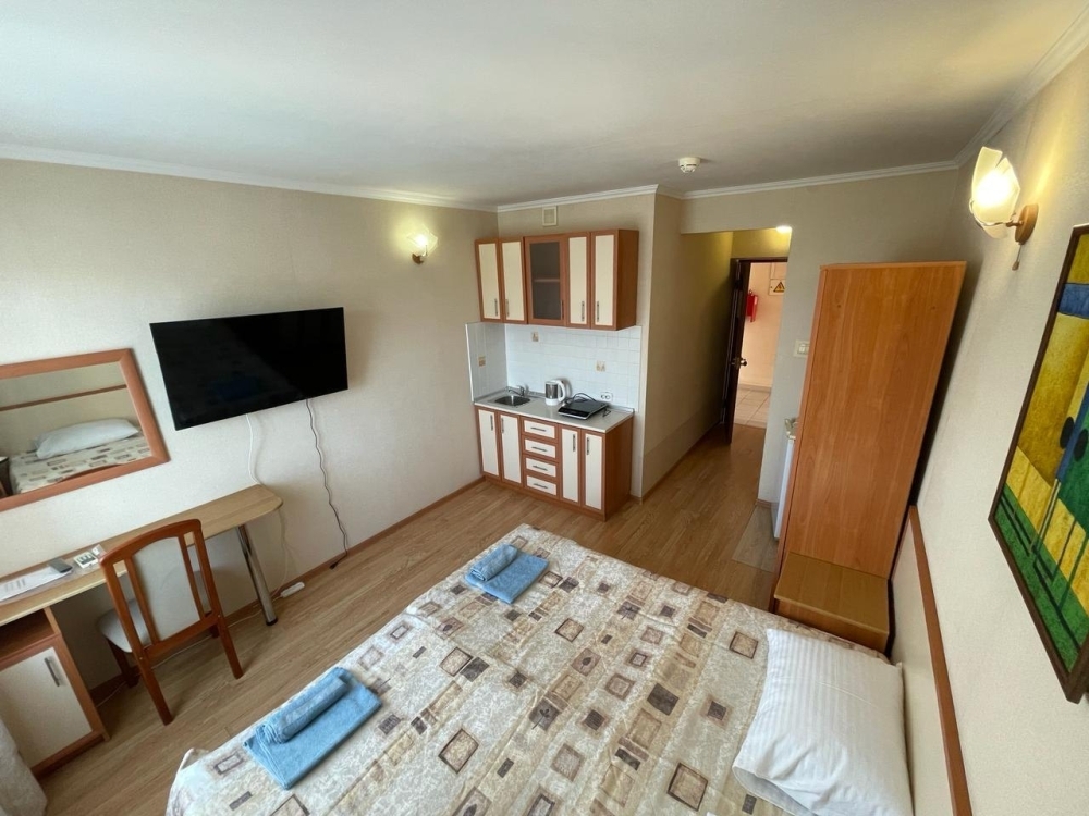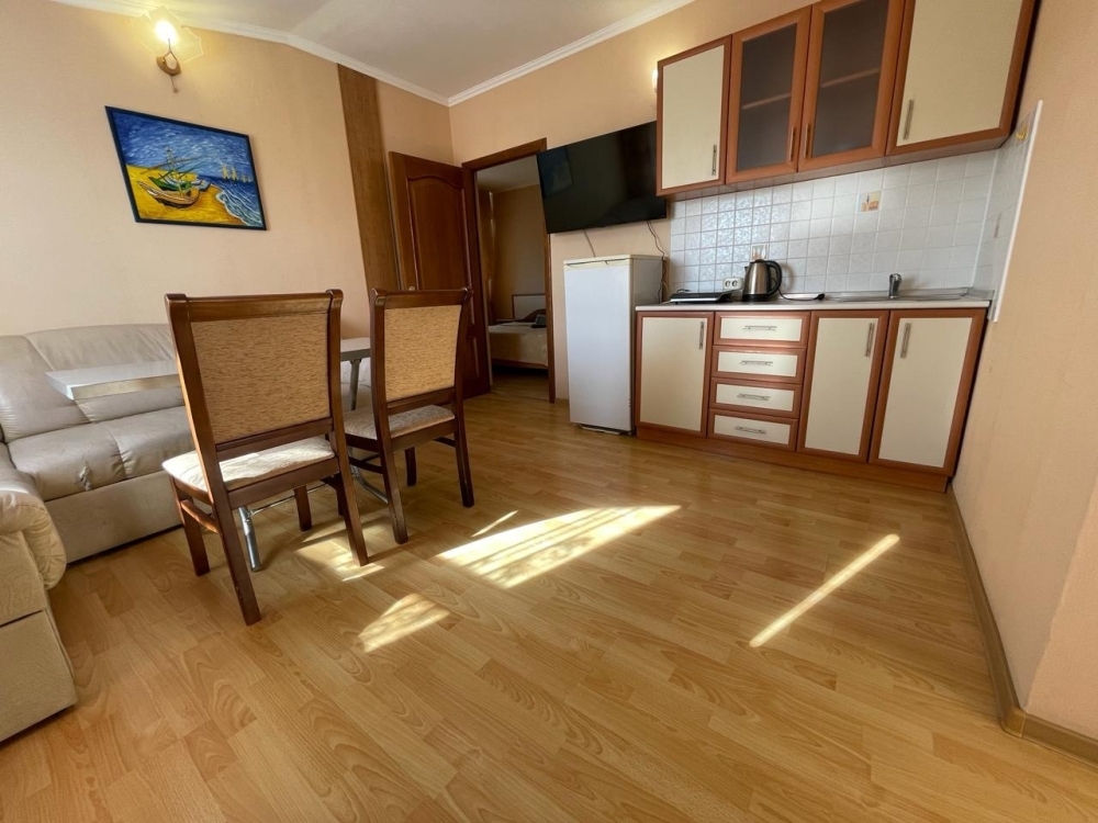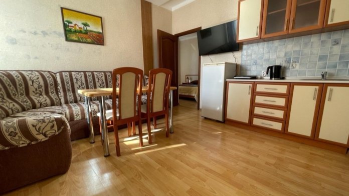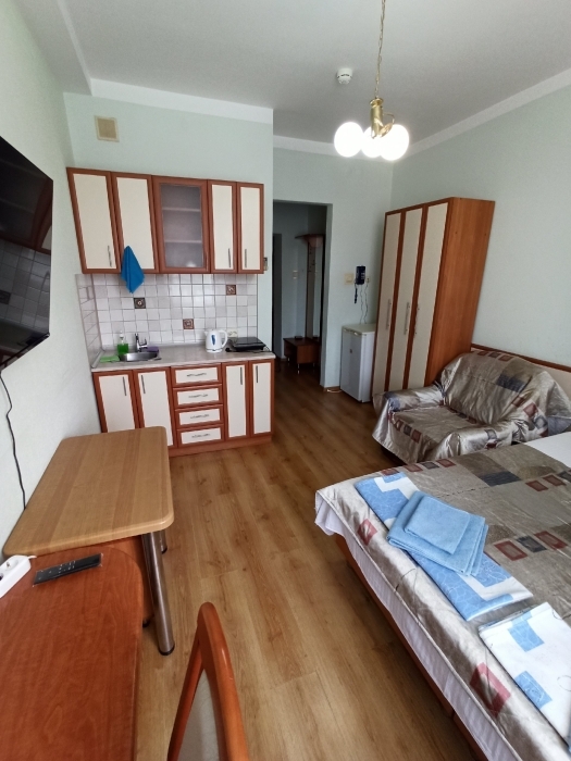 Двухкомнатный номер студия со своей кухней и всеми удобствами. Просторный и светлый номер для 3-4х человек, можно поставить кресло кровать за доп плату. Телевизор в каждой комнате, холодильник, кондиционер в каждой комнате, двух спальный диван, большая двух спальная кровать, тумбочки, два шкафа. туалетный столик с зеркалом, прихожая, обеденный стол и стулья, хороший интернет. Имеется полноценная кухня с инфракрасной плиткой и мойкой, вся необходимая посуда в номере. Удобства также в номере, предоставляется фен.
