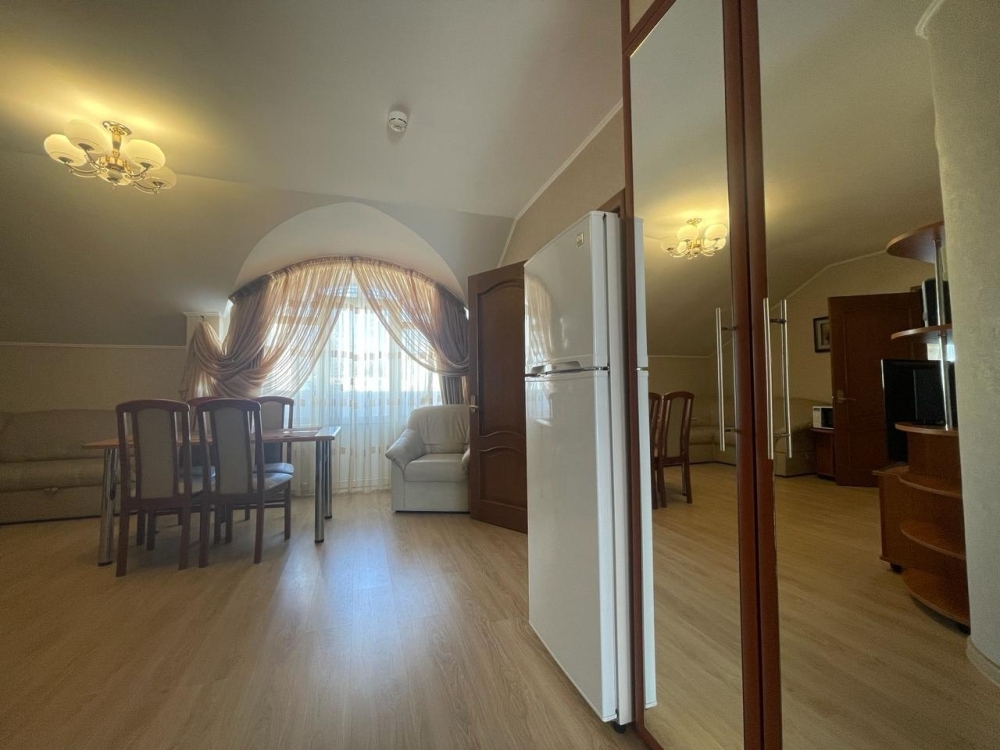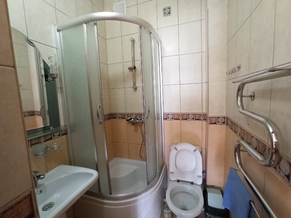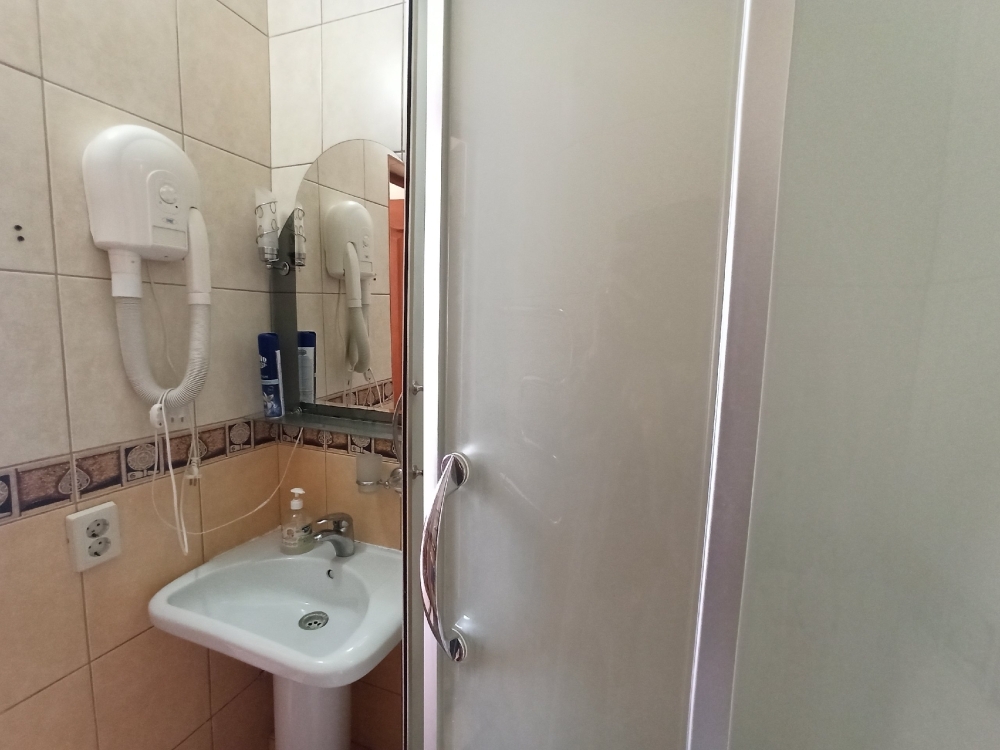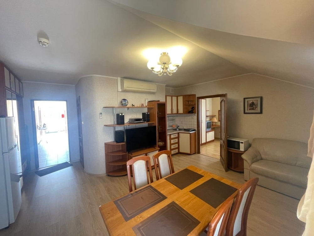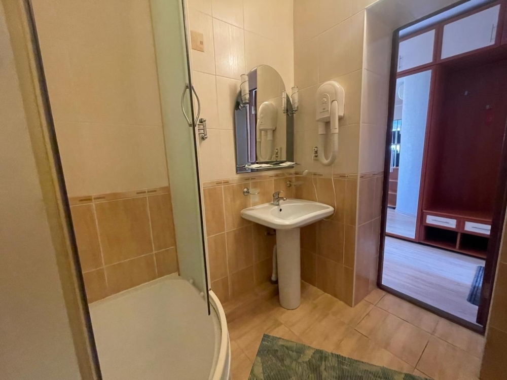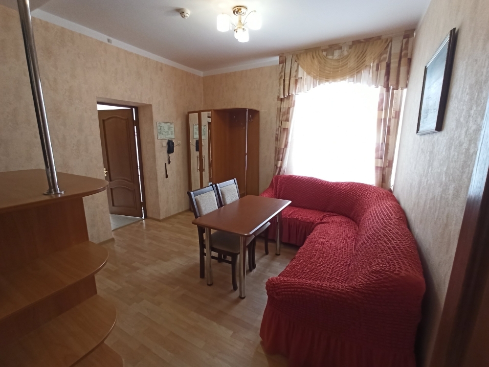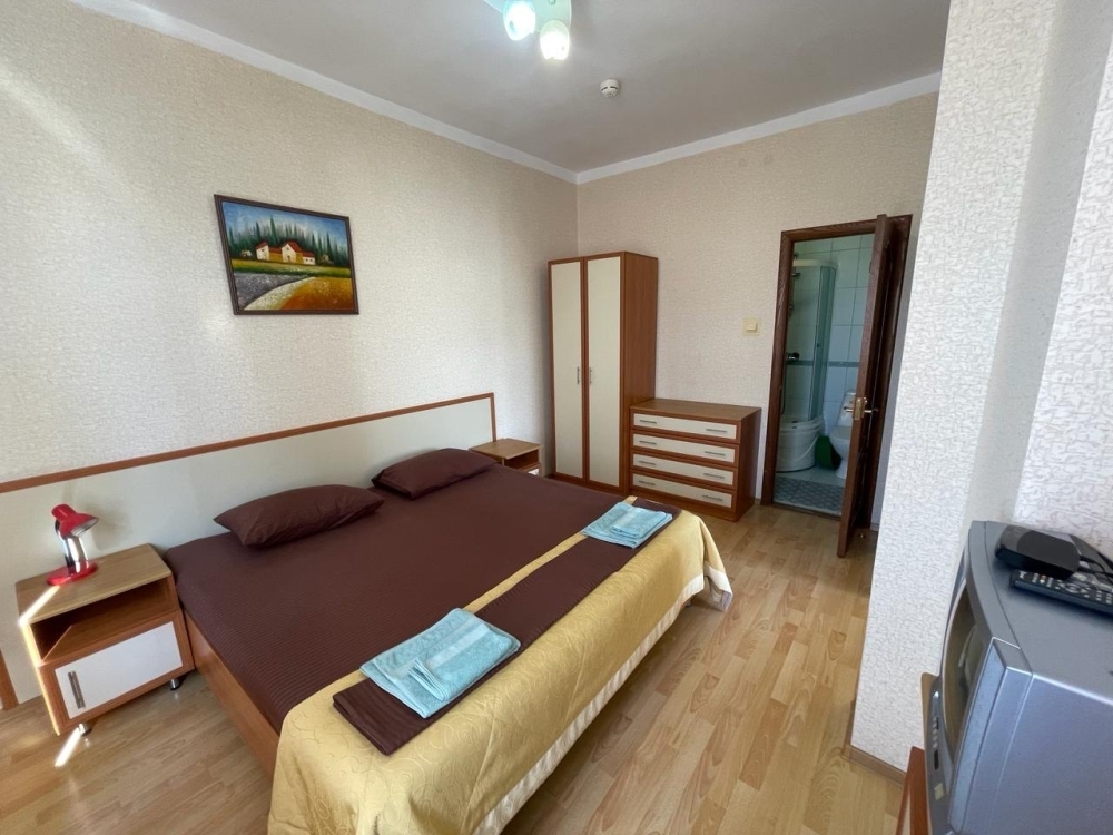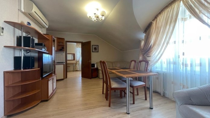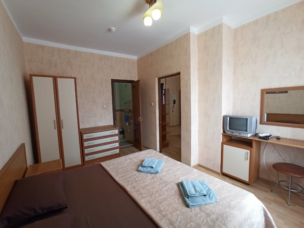 Двухкомнатный номер студия со своей кухней и всеми удобствами. Просторный и светлый номер для 3-4х человек, можно поставить кресло кровать за доп плату. Телевизор в каждой комнате, холодильник, кондиционер в каждой комнате, двух спальный диван, большая двух спальная кровать, тумбочки, два шкафа. туалетный столик с зеркалом, прихожая, обеденный стол и стулья, хороший интернет. Имеется полноценная кухня с инфракрасной плиткой и мойкой, вся необходимая посуда в номере. Удобства также в номере, предоставляется фен.