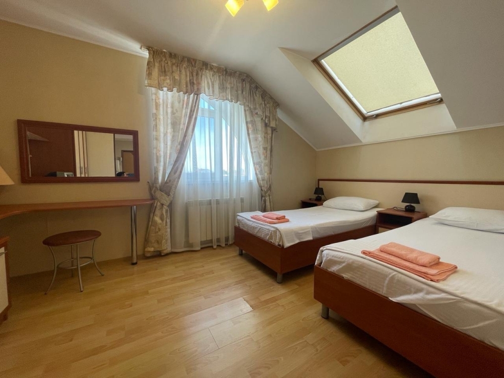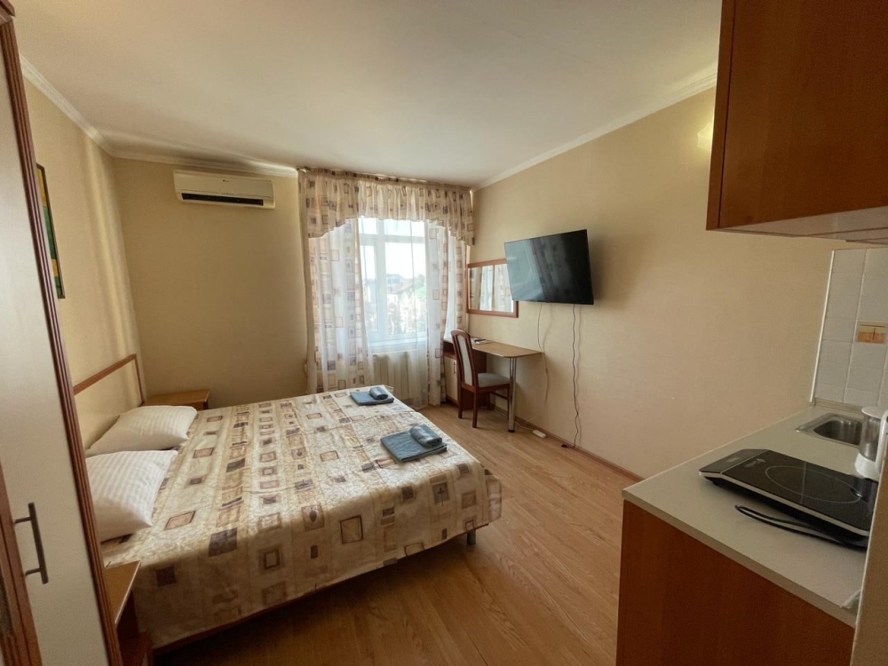 Уютный двухместный номер студия со своей кухней и всеми удобствами. Большой телевизор, кондиционер, холодильник, инфракрасная плитка, вся необходимая посуда в номере. Двух спальная или две односпальных кровати, при желании за доп плату можно поставить кресло кровать. Санузел в номере.