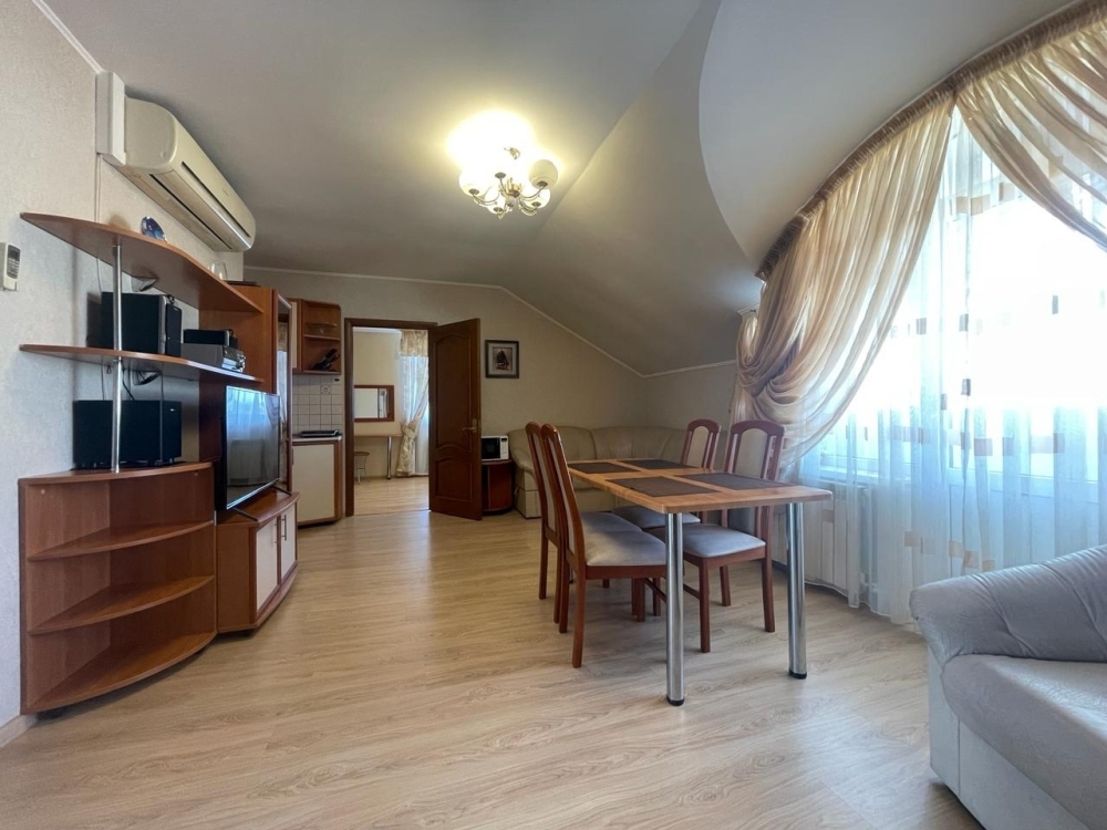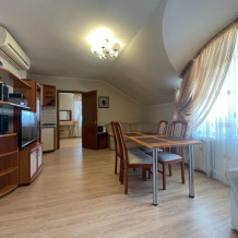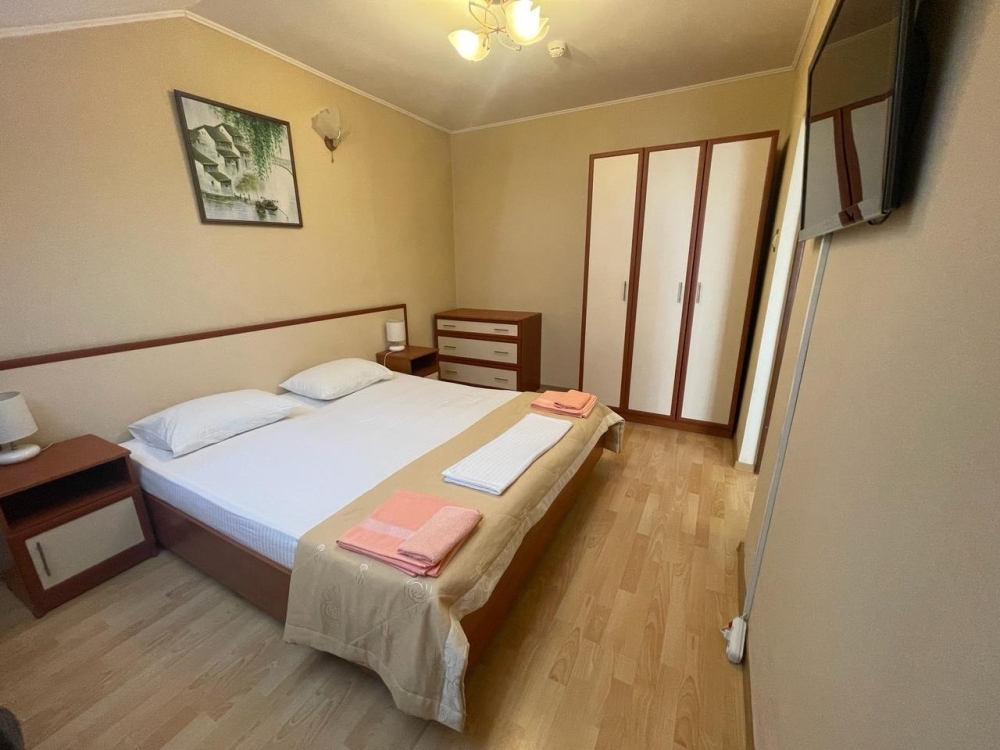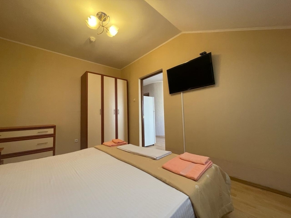 Просторные 3-комнатные апартаменты со своей кухней и балконом. Детская спальня, взрослая спальня. зал. Кондиционер в каждой комнате, телевизор в каждой комнате, обеденный стол и стулья, музыкальный центр, индукционная плитка, мойка, вся необходимая посуда. Санузел в номере. предоставляется фен. Своя сушилка, гладильная дока, утюг.