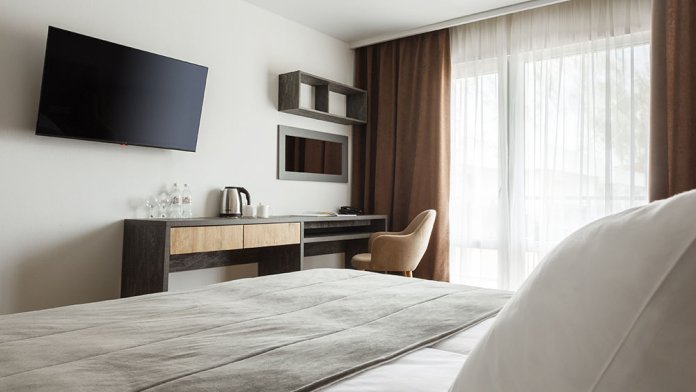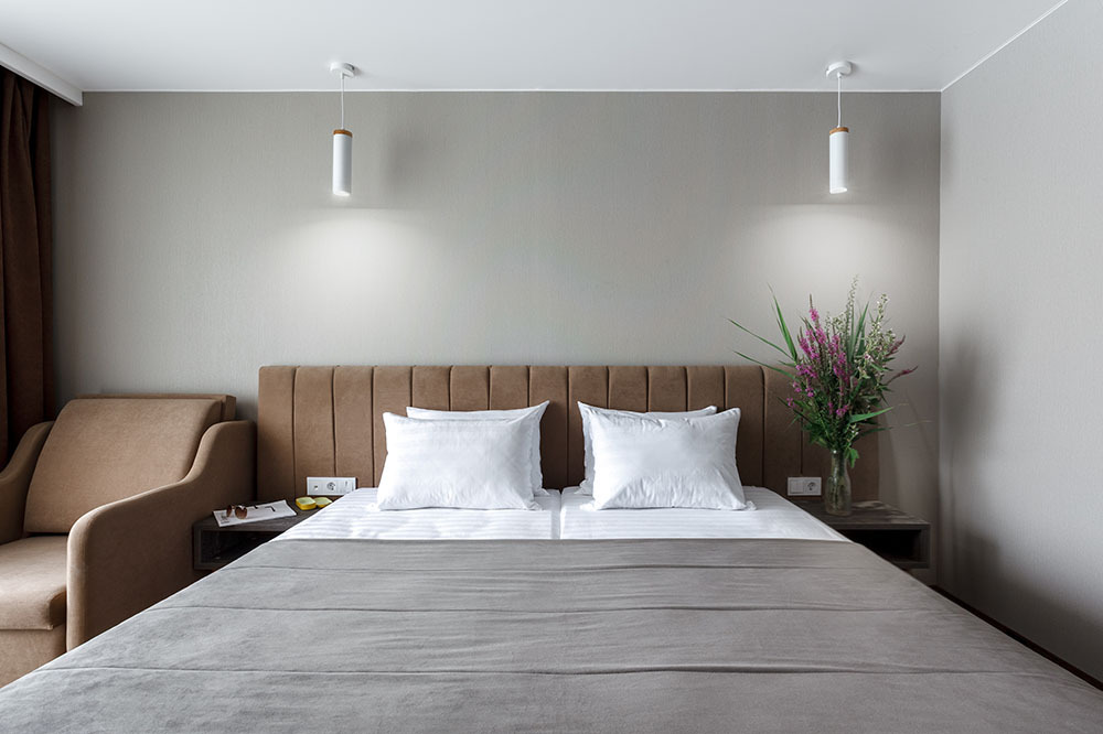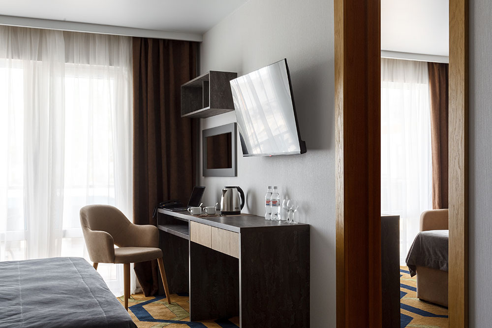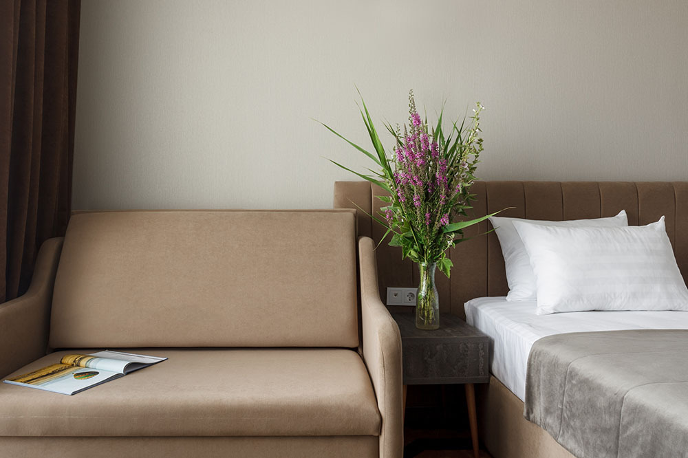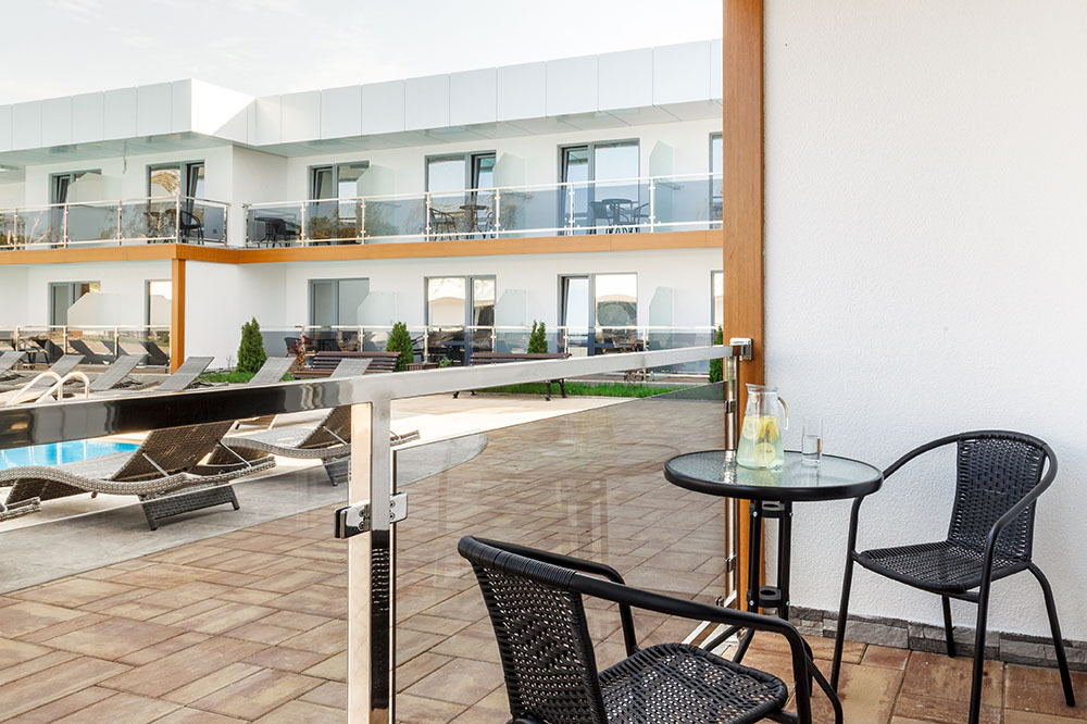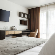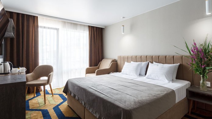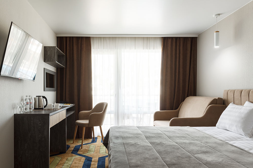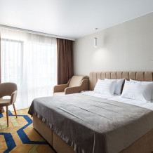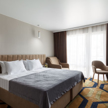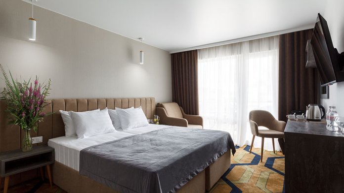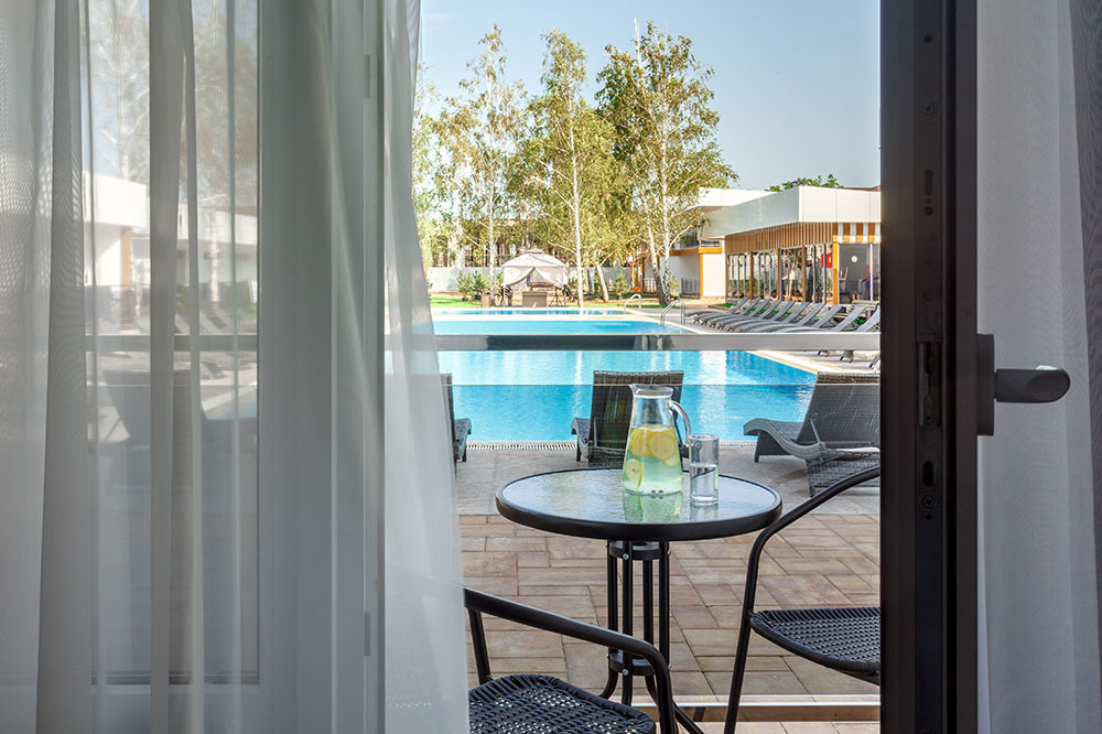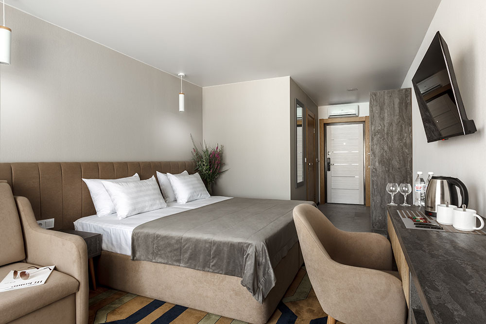 Стильный уютный двухместный номер. Номера расположены на 1 и 2 этажах коттеджа, все номера с балконами. Из панорамных окон открывается чудесный вид на бассейн и зеленую территорию отеля.