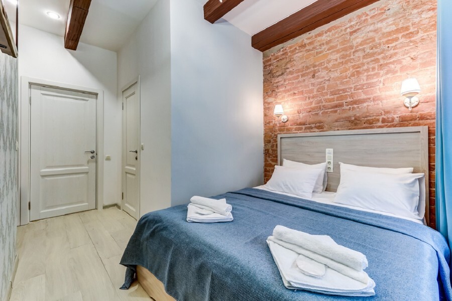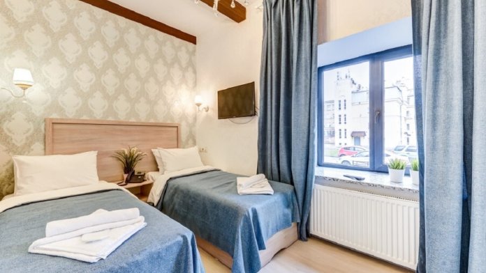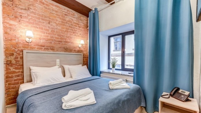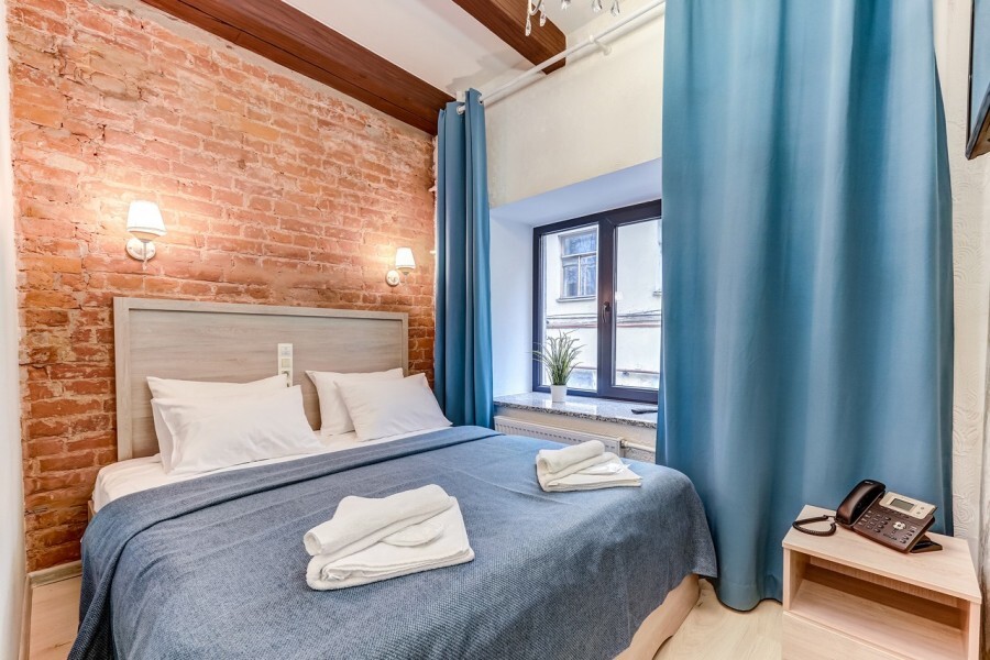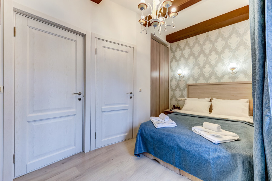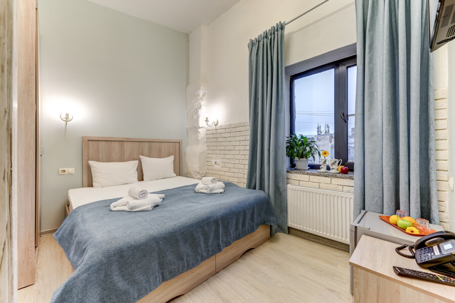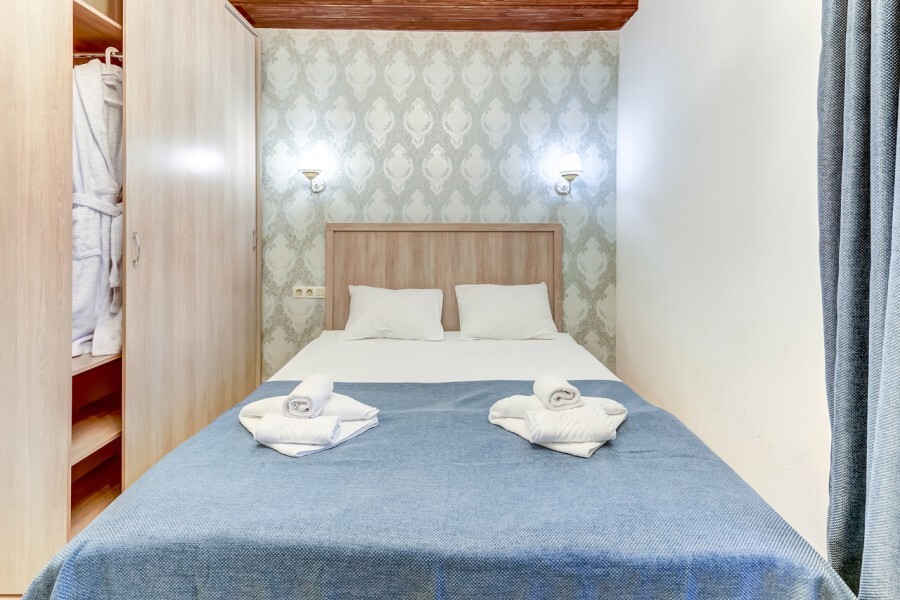 В номере одна большая кровать или две раздельные, мини-холодильник, плазменный ТВ, светильники, плотные шторы, встроенный шкаф, телефон.