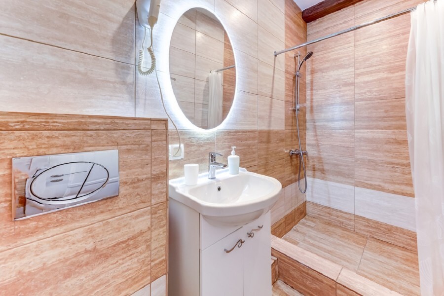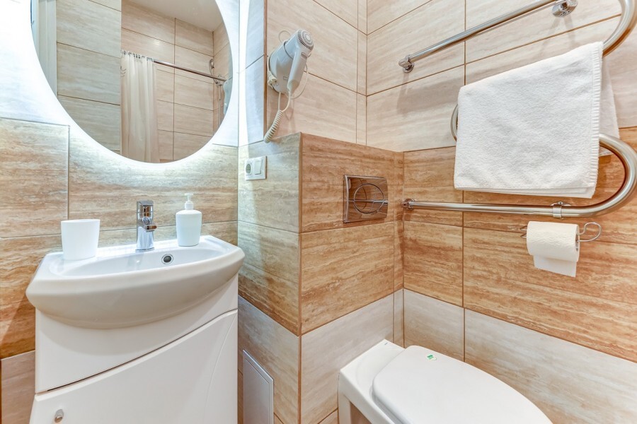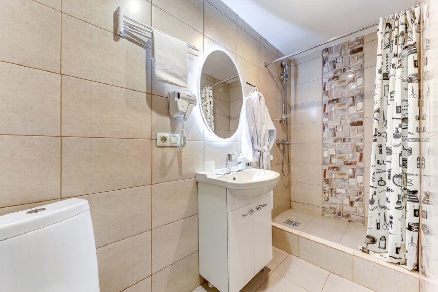 Ванная комната: зеркало с подсветкой, душ, туалет, раковина, фен. Бесплатные гигиенические принадлежности: шампунь, гель для душа, комплект полотенец.