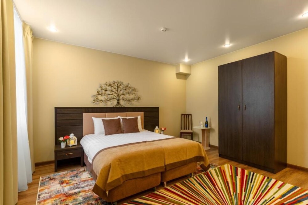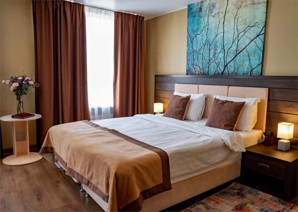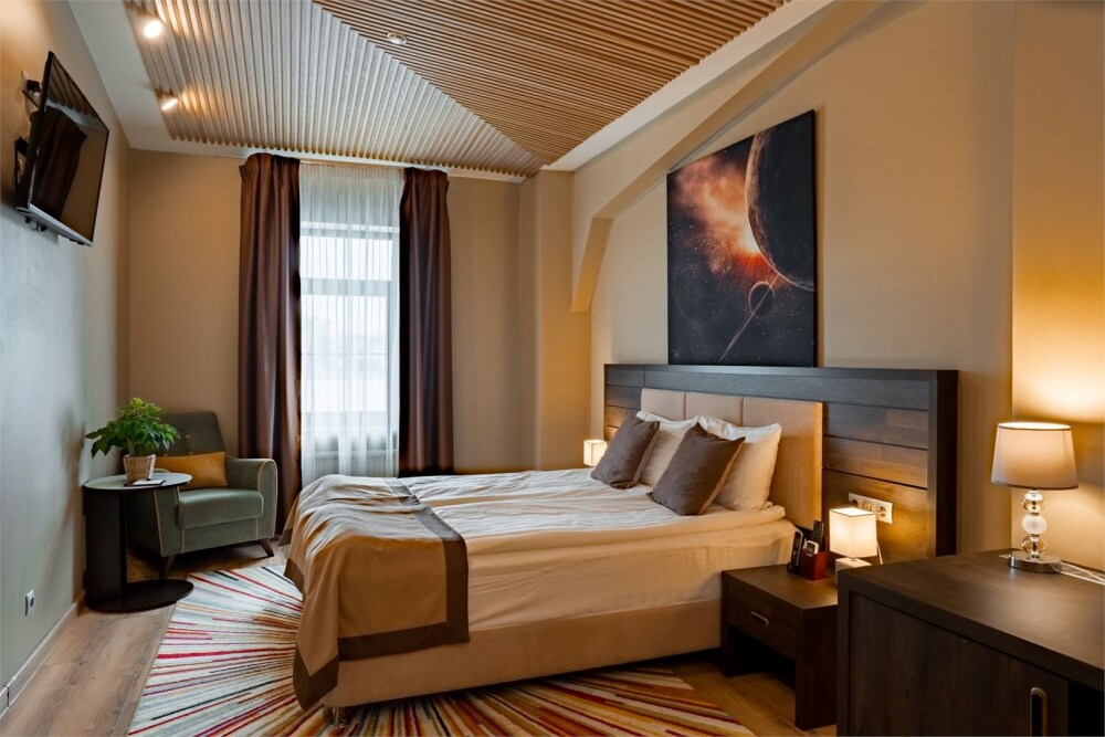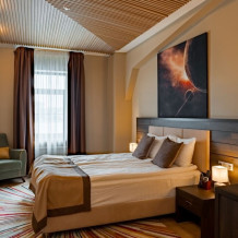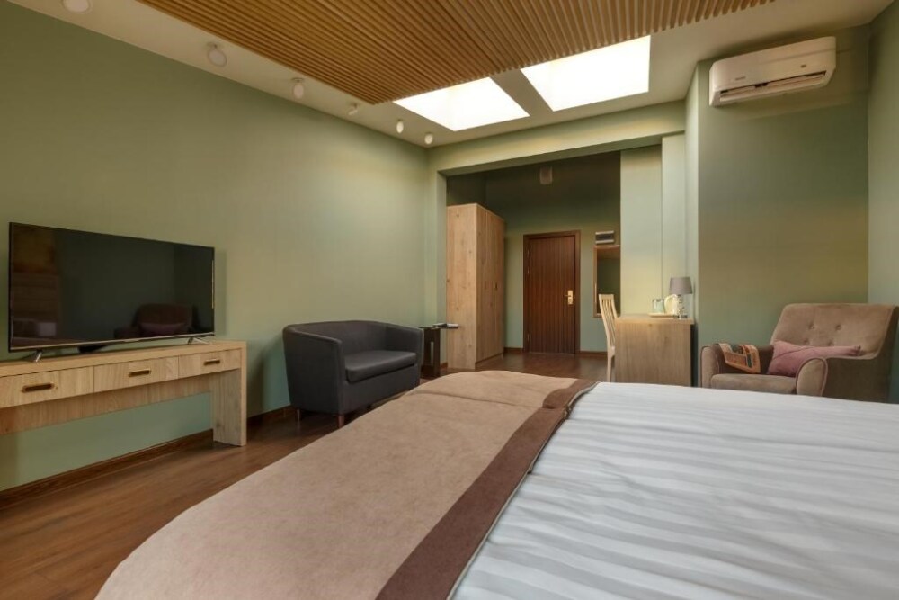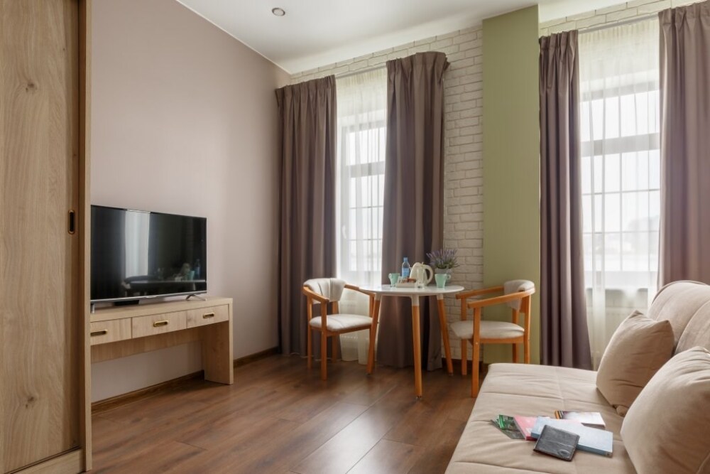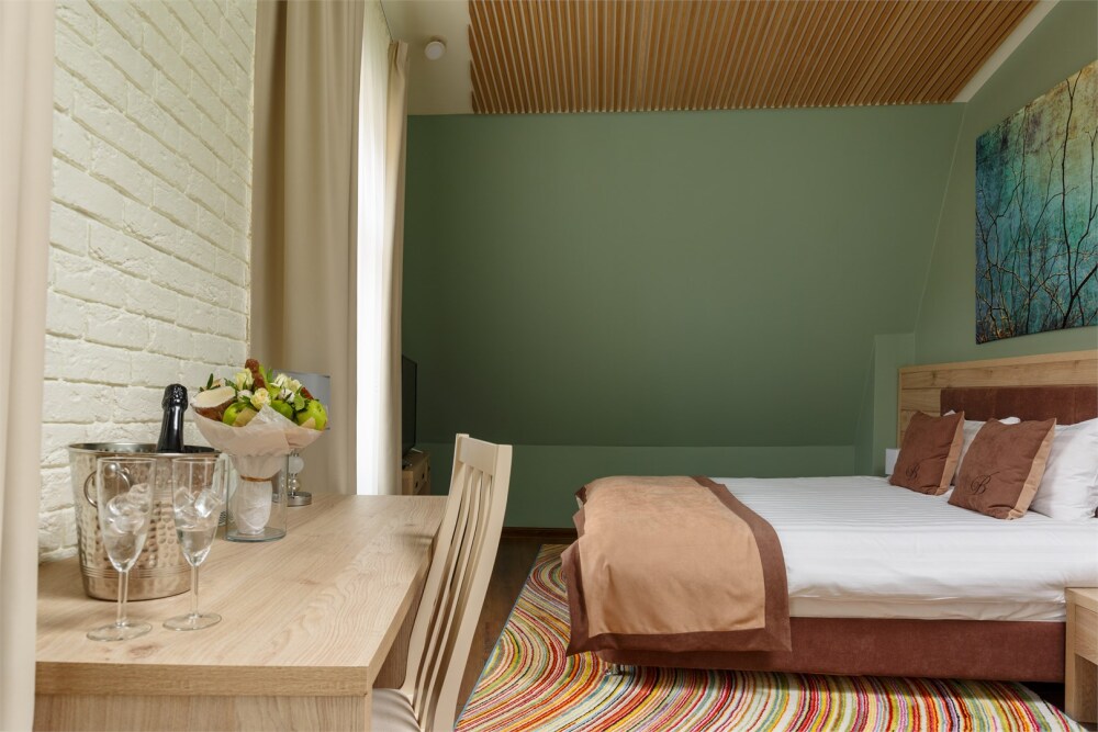 Премиальный номер с видом в тихий дворик-патио и собственной финской сауной - отличный вариант для спокойного отдыха вдали от городского шума. Для комфорта гостей в номере установлено массажное кресло. Мини-бар с алкогольными и безалкогольными напитками предоставляется комплиментарно при заезде.
