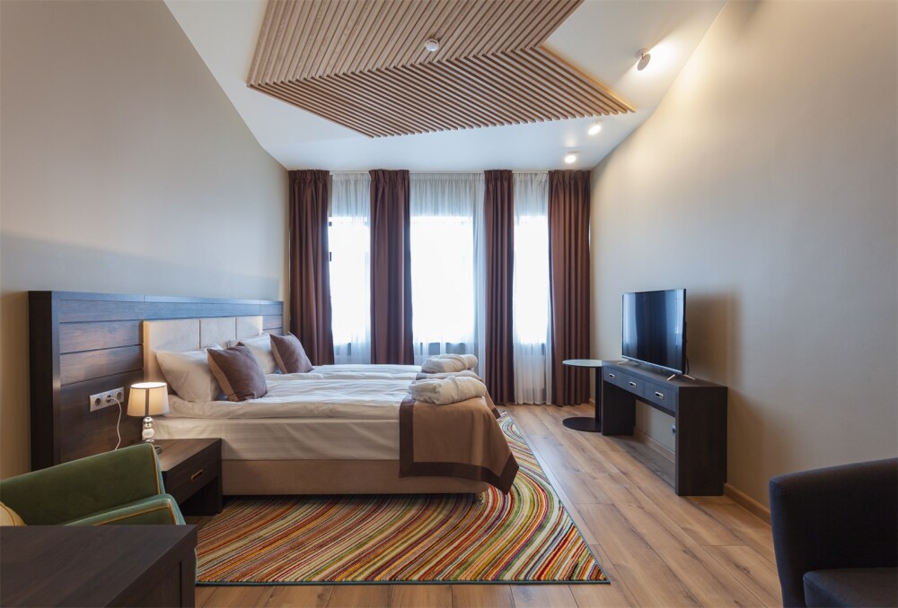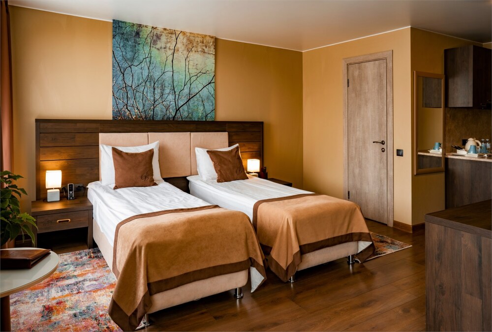 Номер увеличенной площади для комфортного проживания пары или семьи с ребенком, оборудован всем необходимым для отдыха и работы.