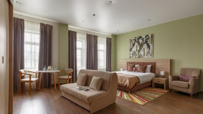 Просторный номер с интересной планировкой для работы и комфортного отдыха для пары или семьи с ребенком.
