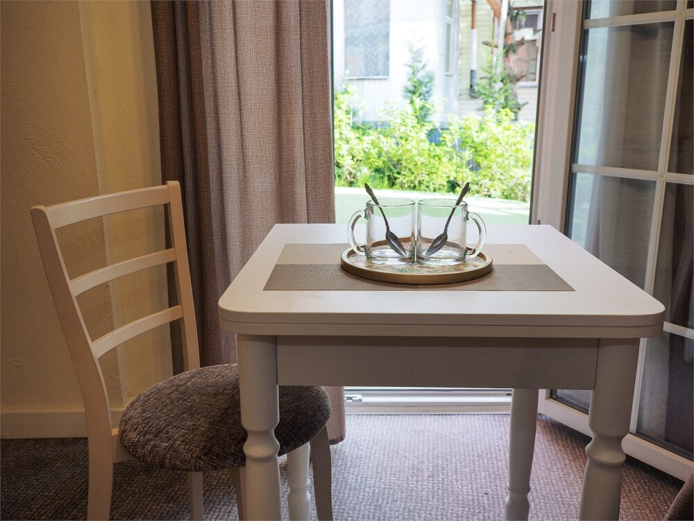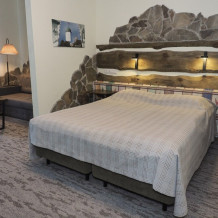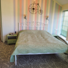Двухкомнатный номер с двумя санузлами, душем и ванной с гидромассажем. Большая круглая кровать и диван. В каждой комнате стол и телевизор. Холодильник. Выход на собственную веранду. Один ребёнок до 3 лет — можно без отдельного спального места.