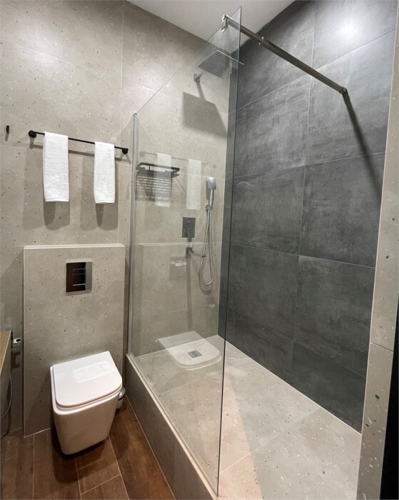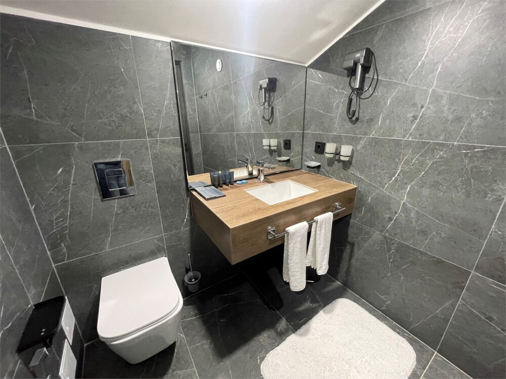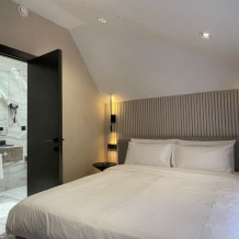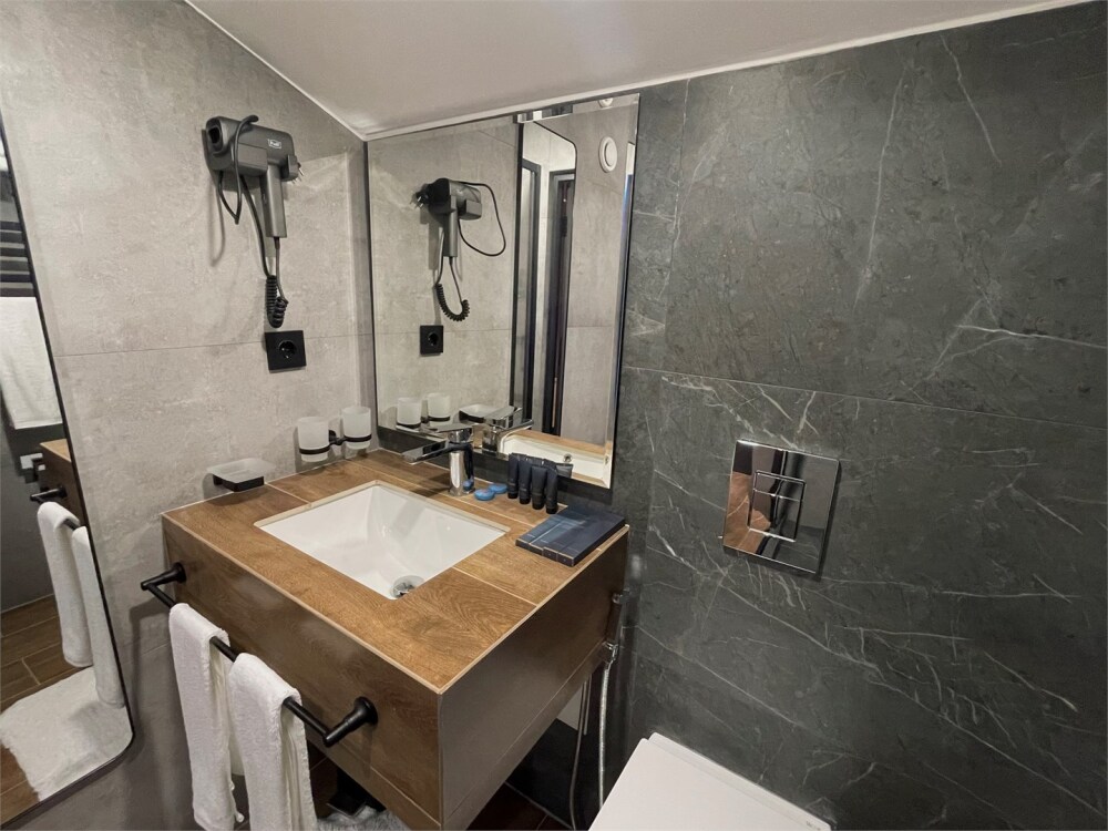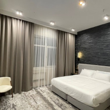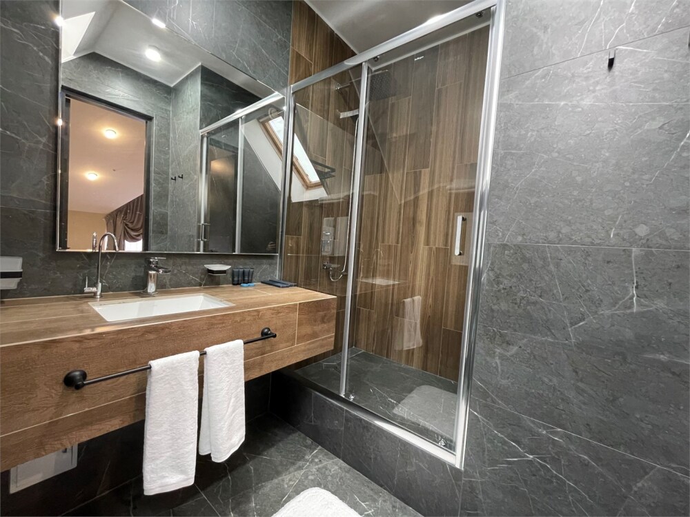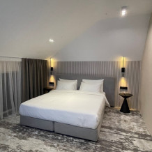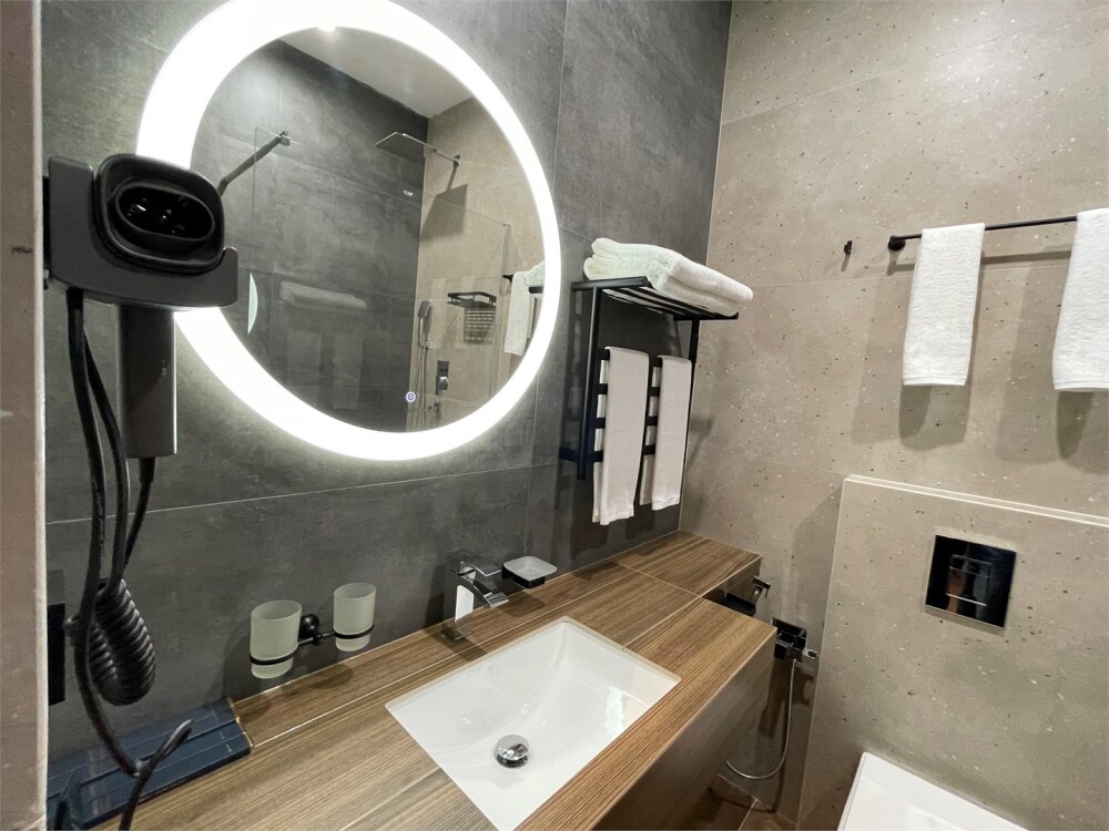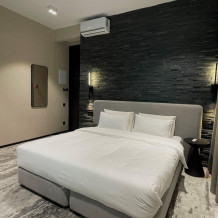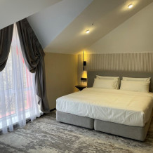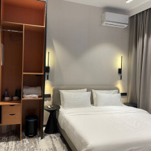 Номер категории «Улучшенный Комфорт» – просторный, элегантный номер в стиле Минимализм. В номере двуспальная кровать, которая при необходимости трансформируется в две односпальные кровати, телевизор, шпонированный стол и шкаф для одежды, санузел с тропическим душем и просторной стеклянной душевой кабиной.
