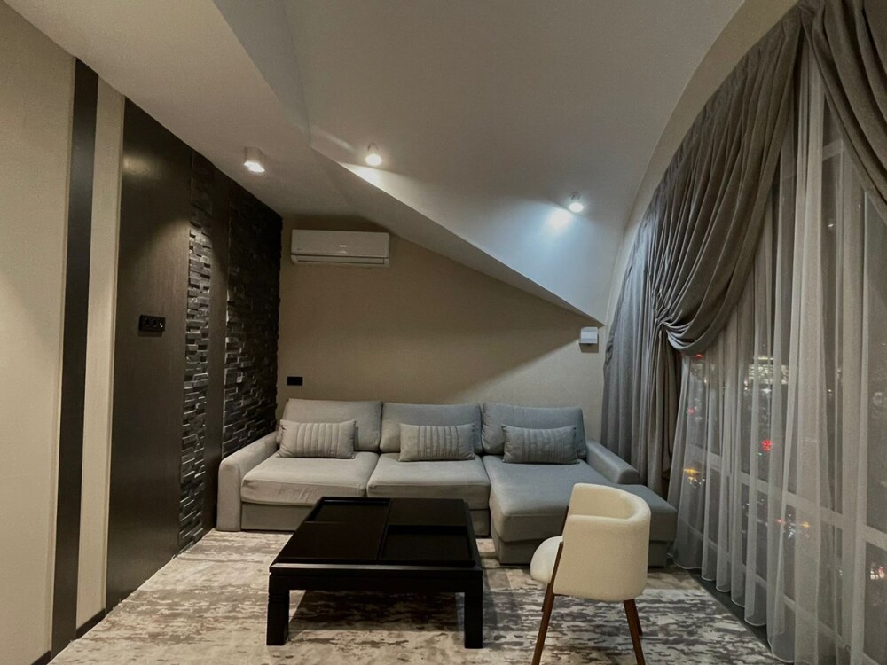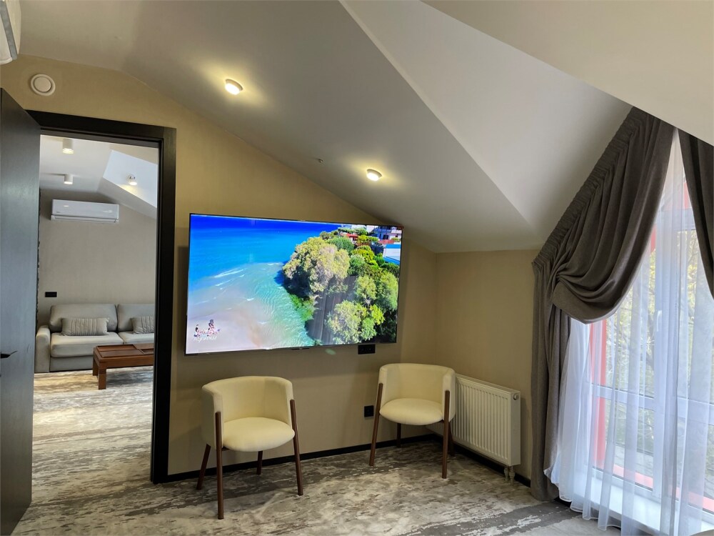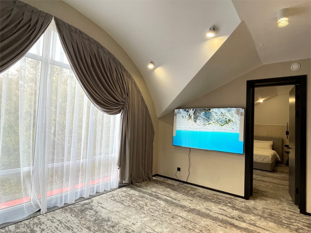 Номер категории «Люкс» - это просторный двухкомнатный номер с современным интерьером и панорамным видом на парк . Номер укомплектован всем необходимым для безупречного отдыха 2-4 человек. В номере двуспальная кровать, которая при необходимости трансформируется в 2 односпальные, двуспальный раскладной диван-кровать, 2 огромных телевизора, кондиционеры, фен, шкаф для одежды, санузел с просторной душевой кабиной и тропическим душем.