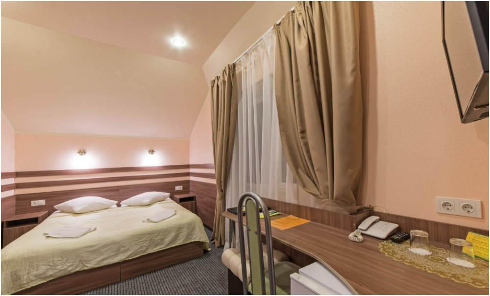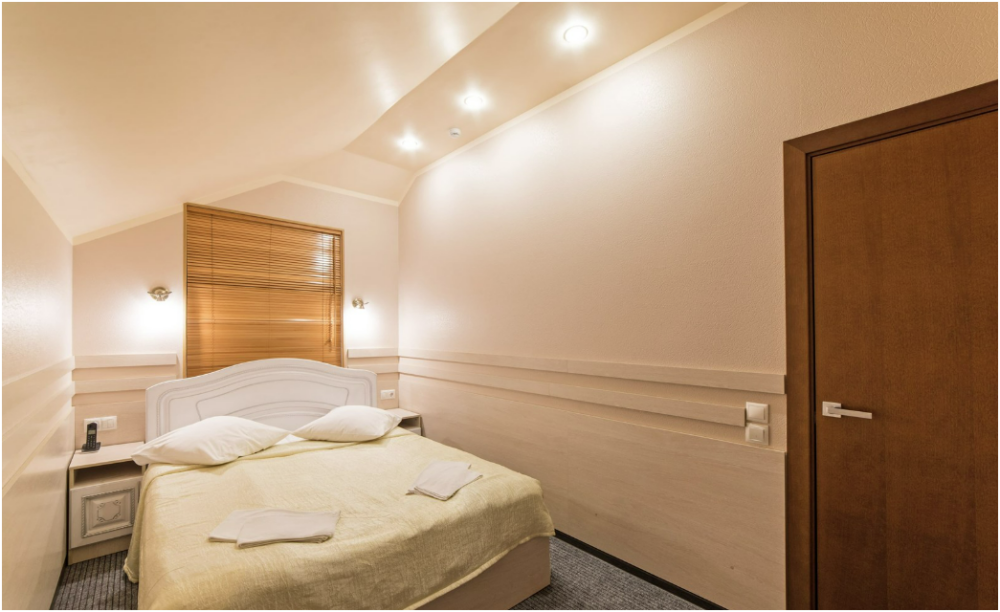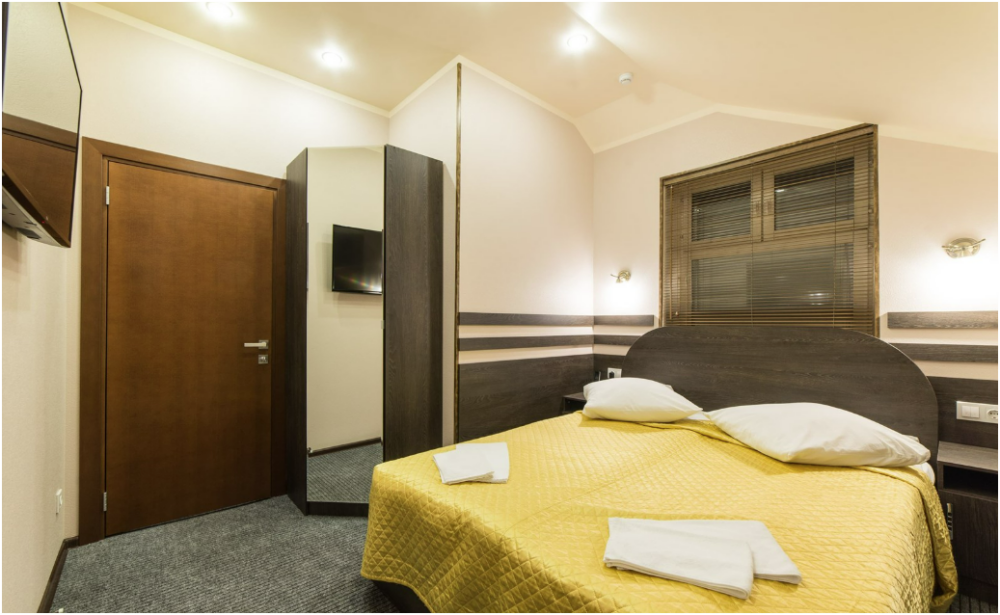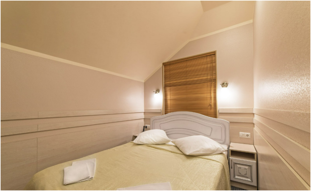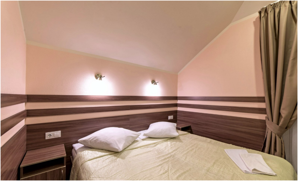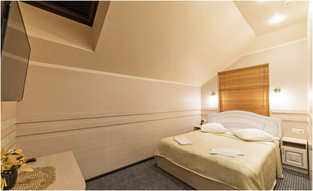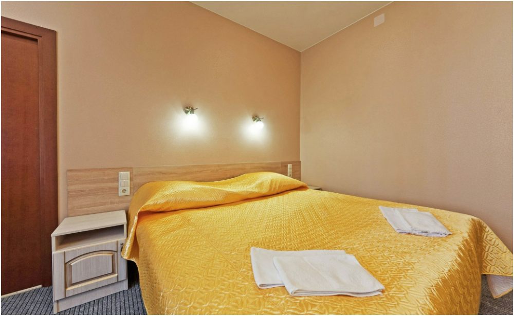 Уютный однокомнатный номер выполнен в теплых тонах. Номер состоит из спальной комнаты и совмещенного санузла.