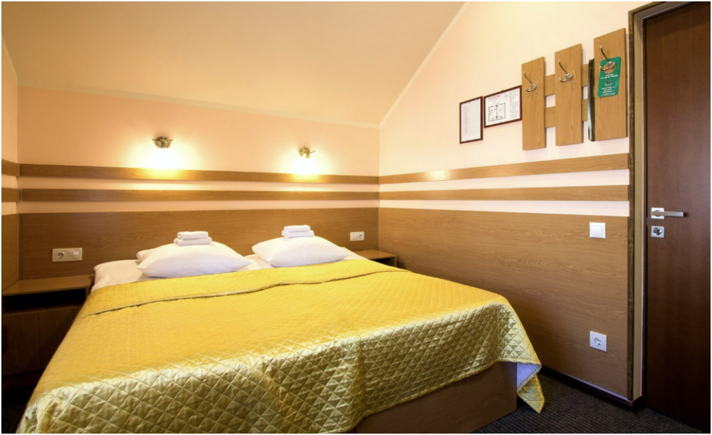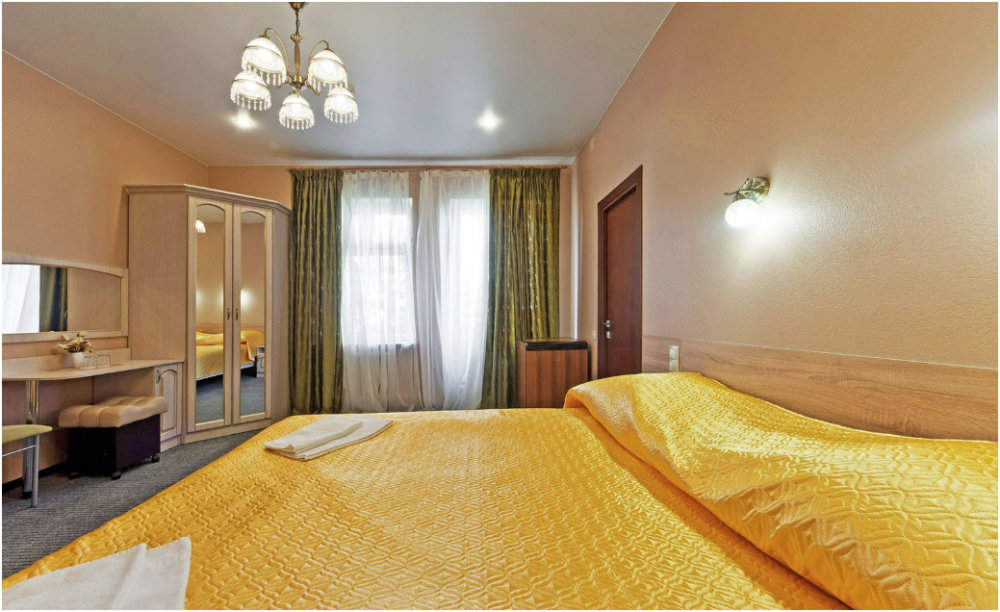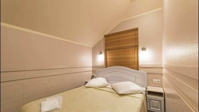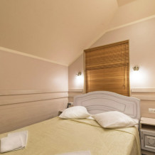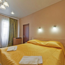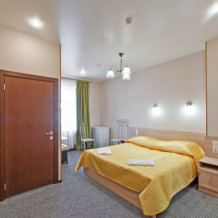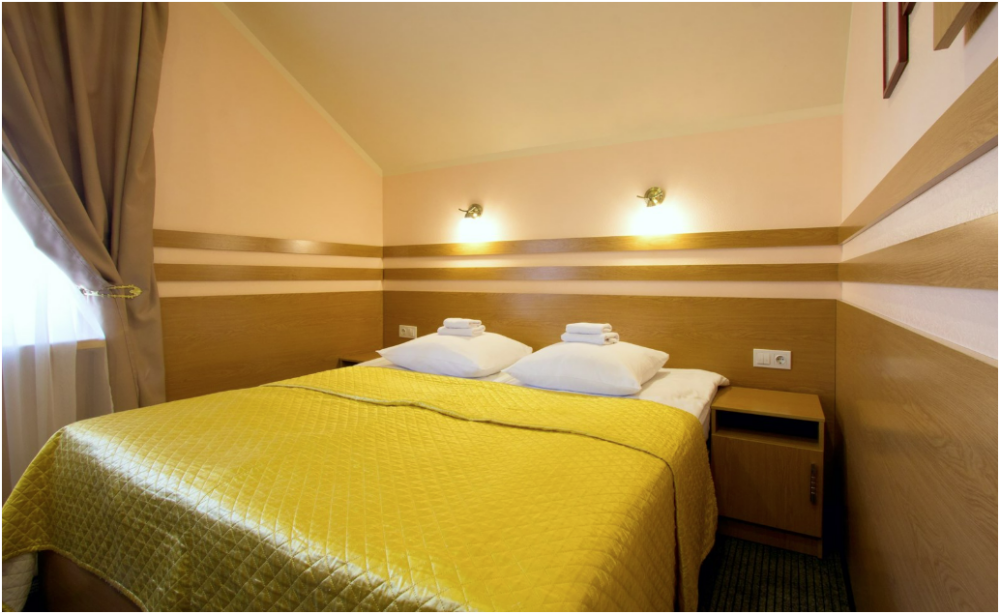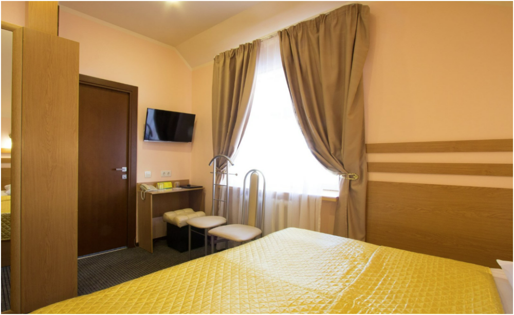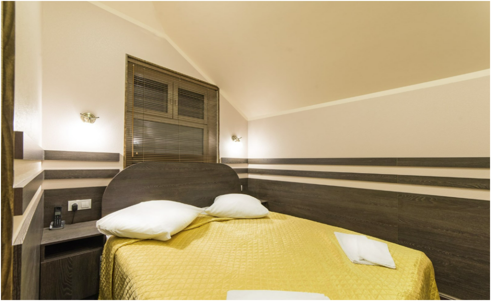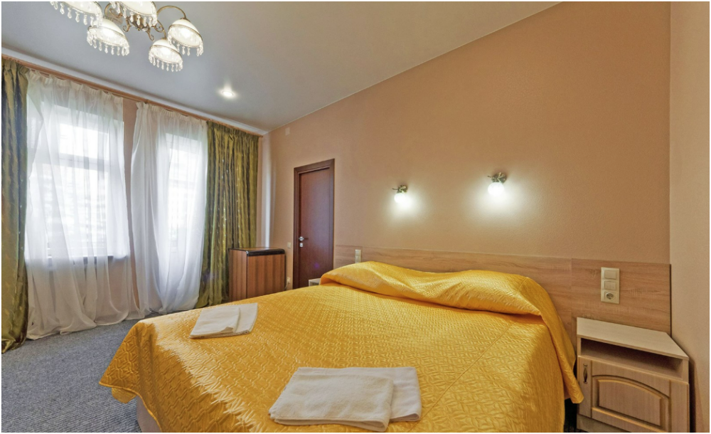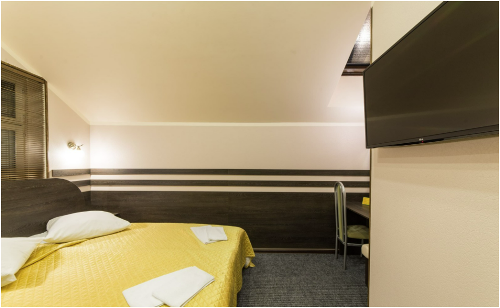 Уютный однокомнатный номер выполнен в теплых тонах. Номер состоит из спальной комнаты и совмещенного санузла.