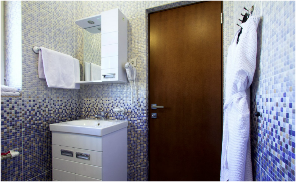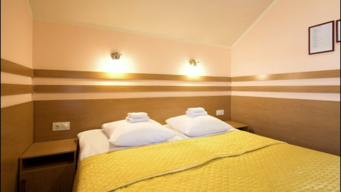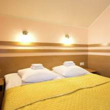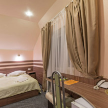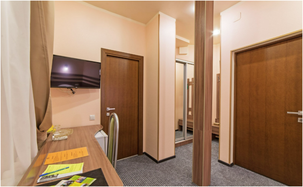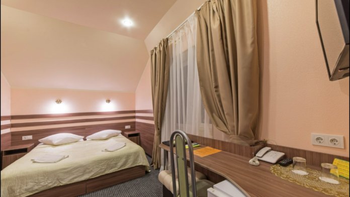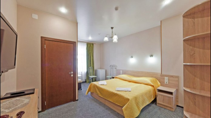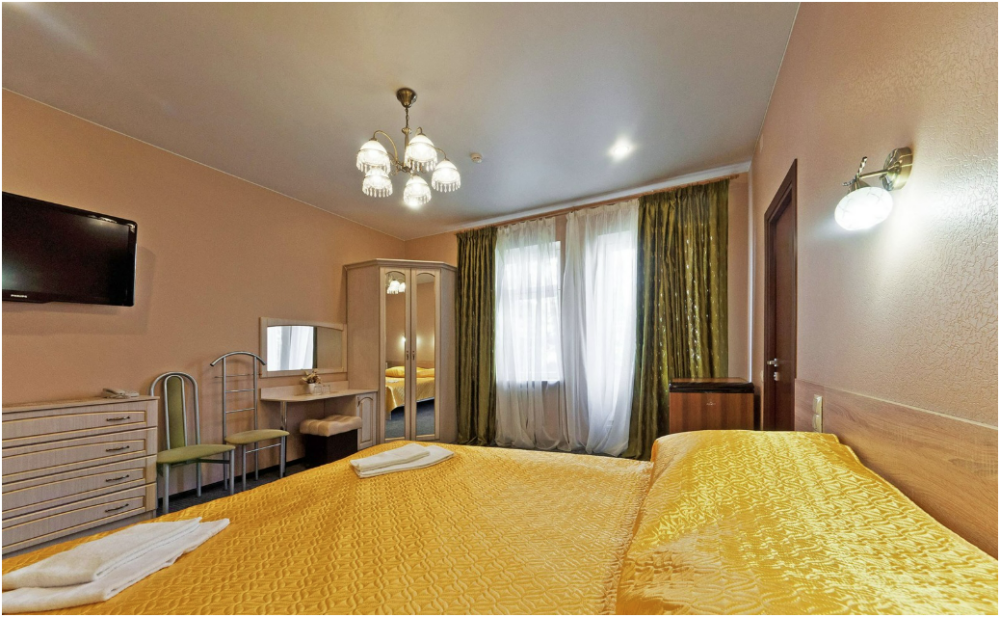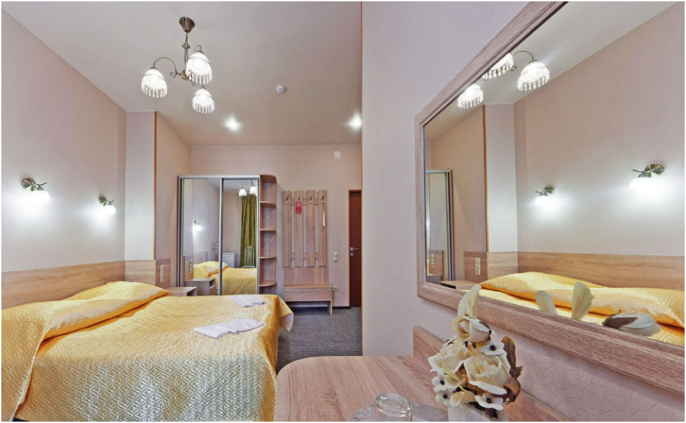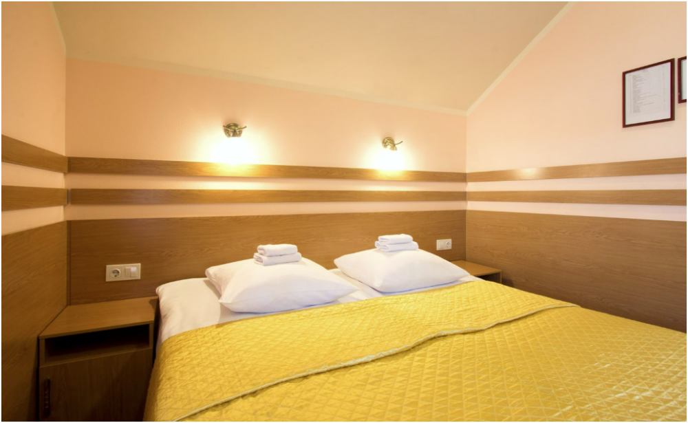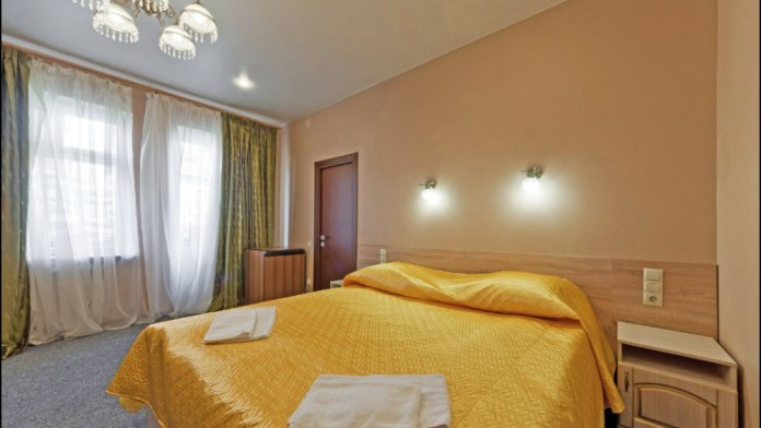 Уютный однокомнатный номер выполнен в теплых тонах. Номер состоит из спальной комнаты и совмещенного санузла.
