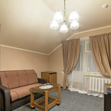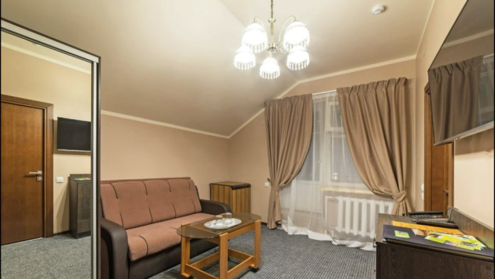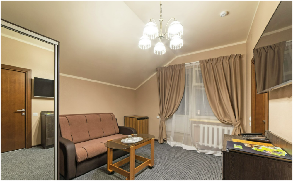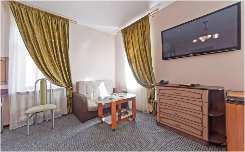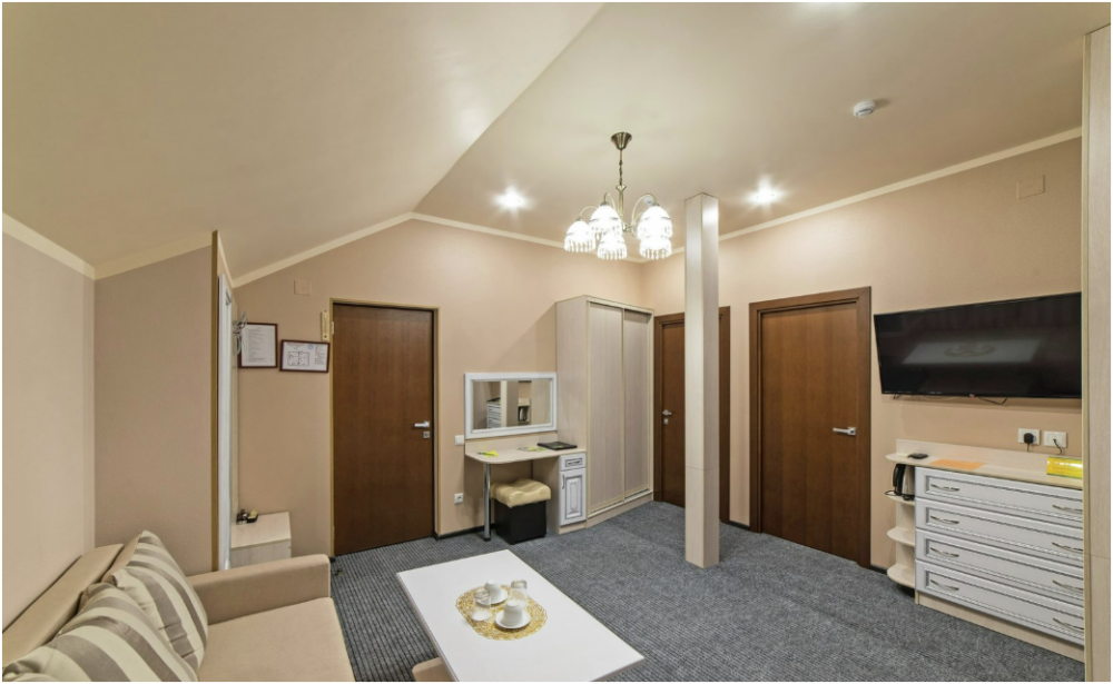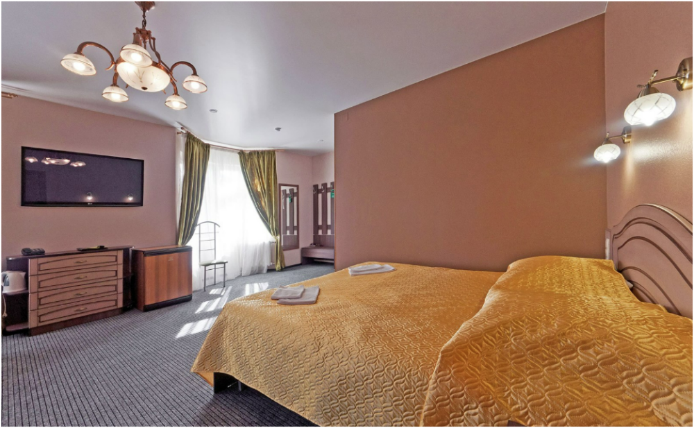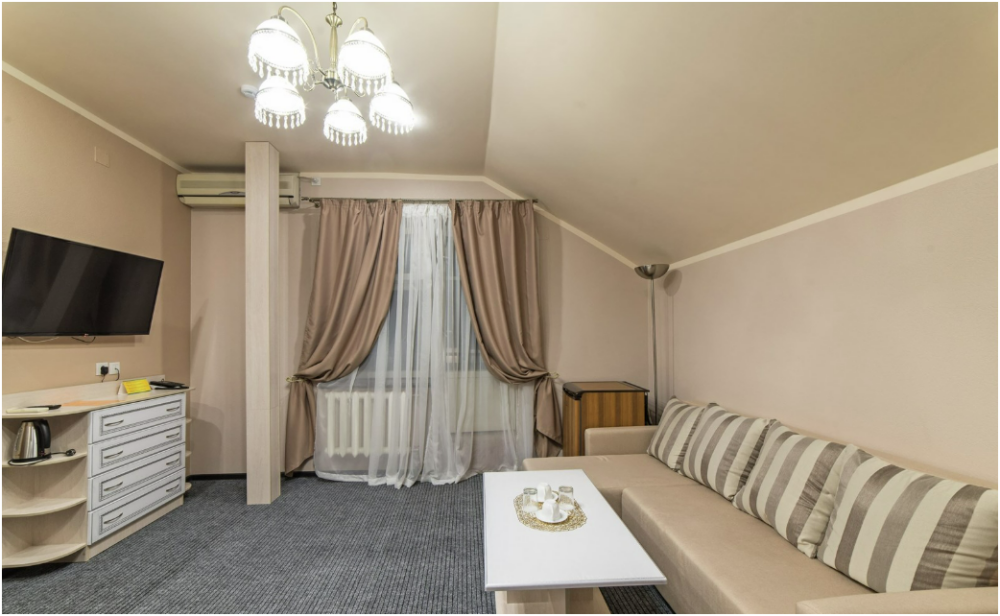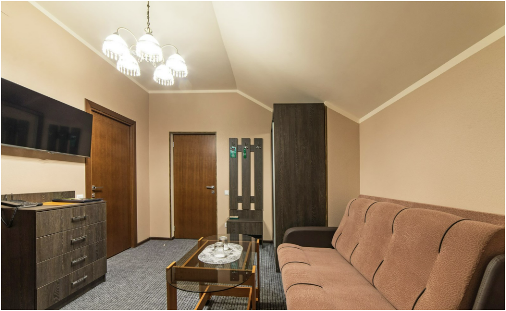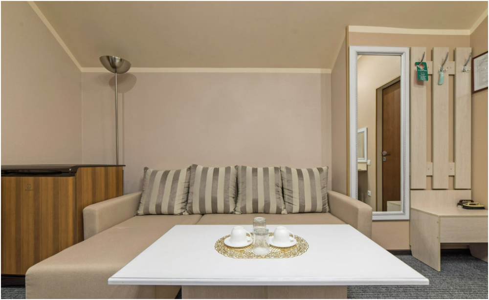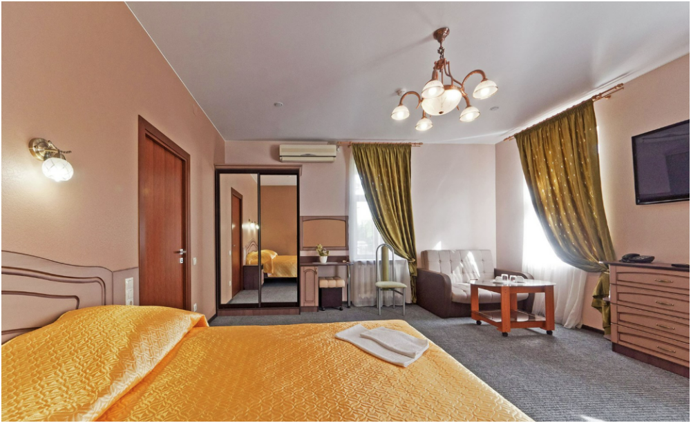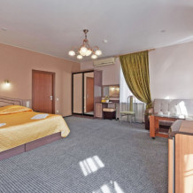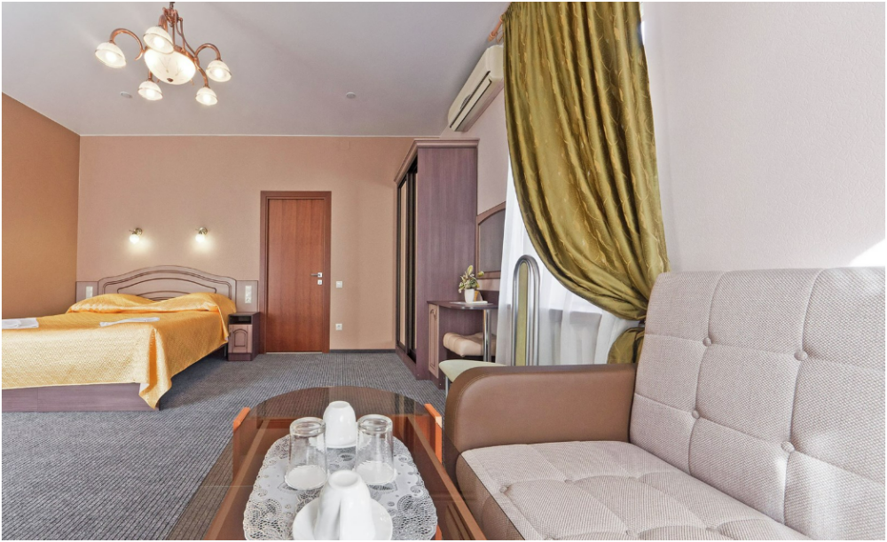 Уютный двухкомнатный номер выполнен в теплых тонах. Номер состоит из гостиной, спальной комнаты и совмещенного санузла.