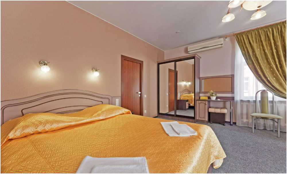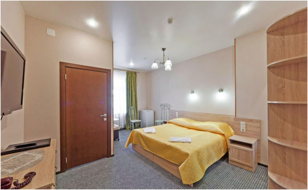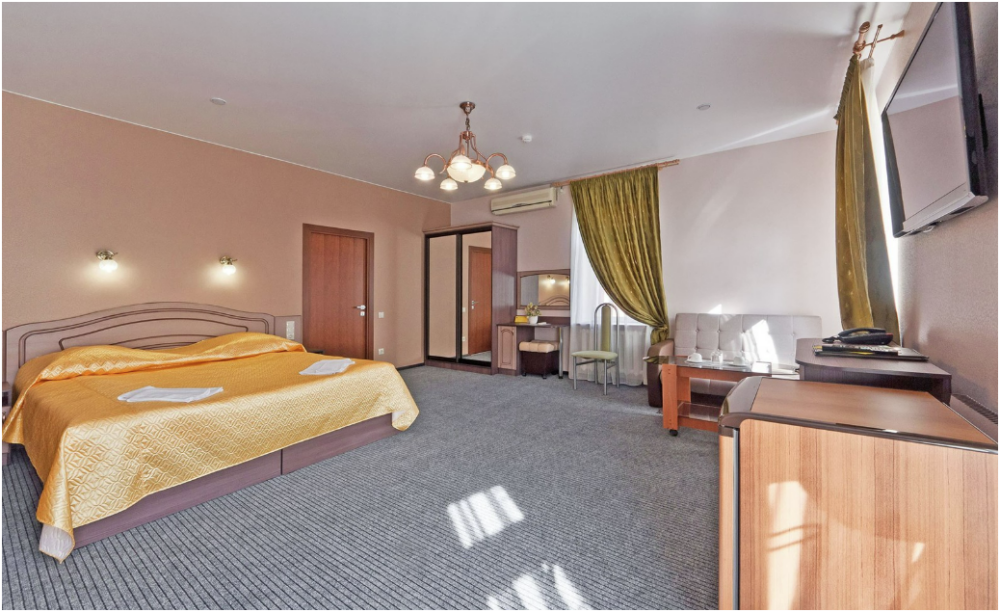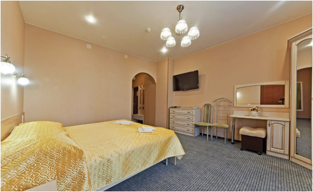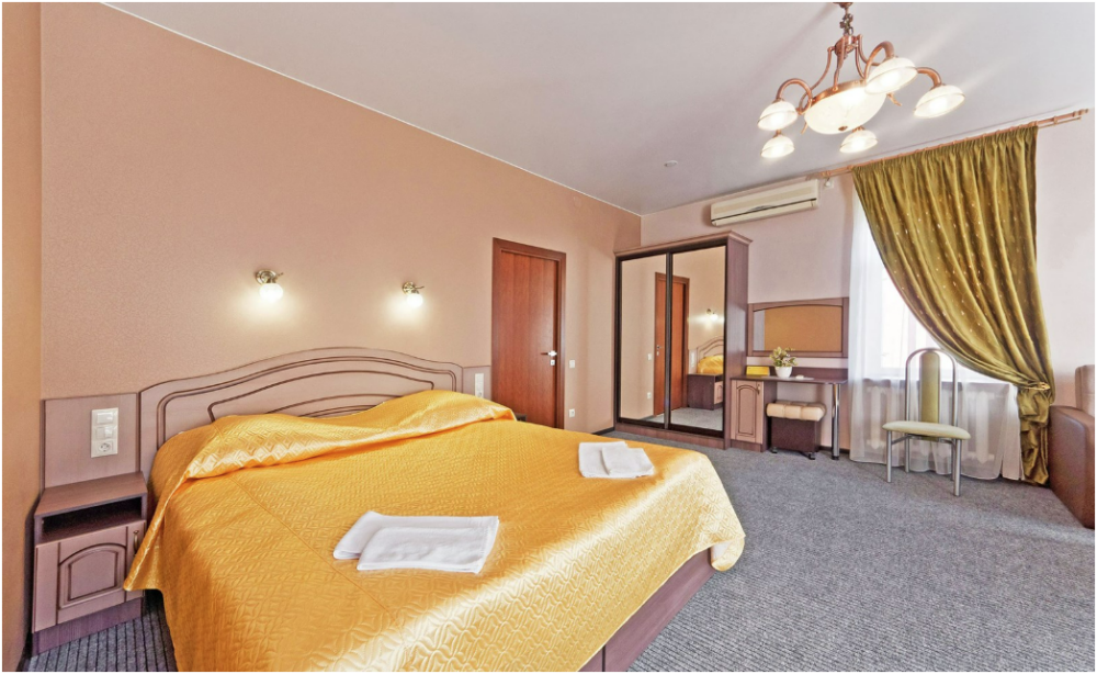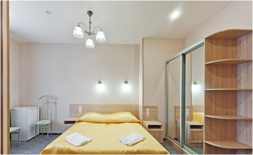Просторный однокомнатный номер выполнен в теплых тонах. Номер состоит из спальной комнаты и совмещенного санузла.