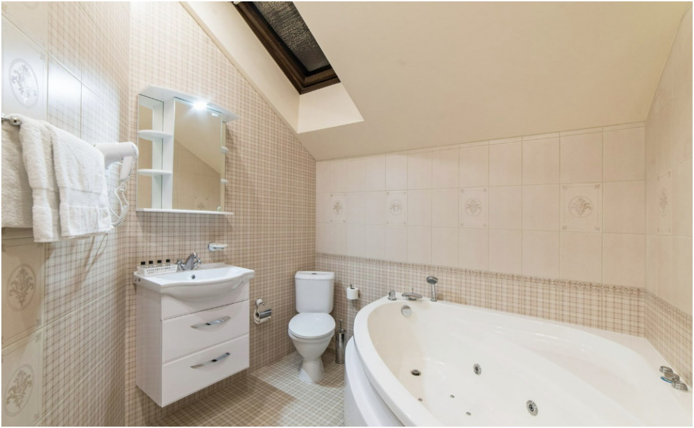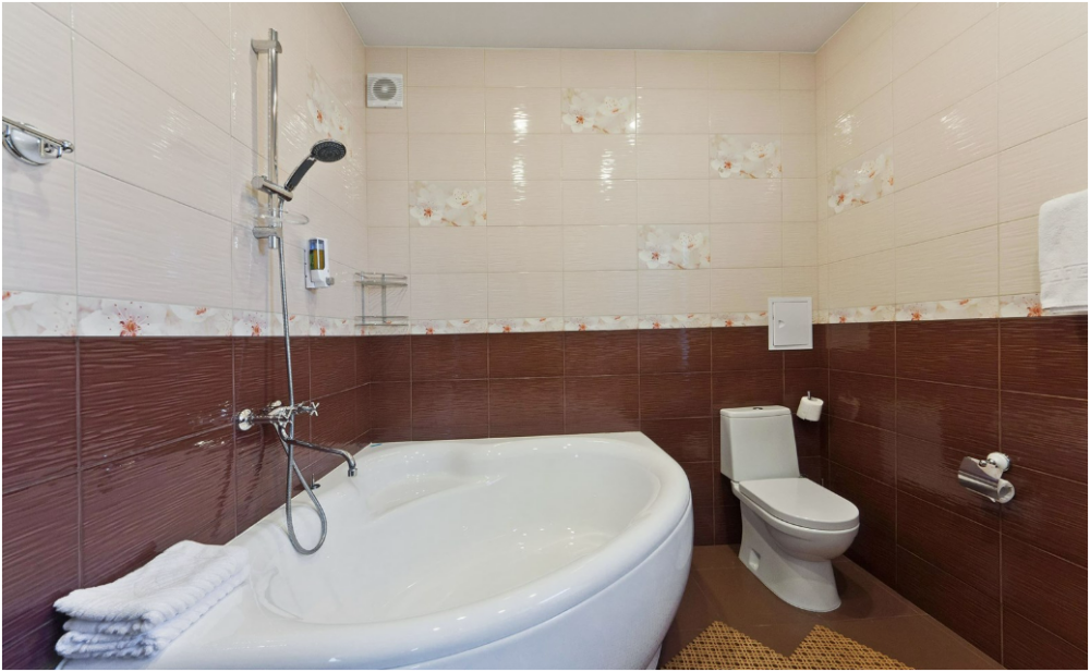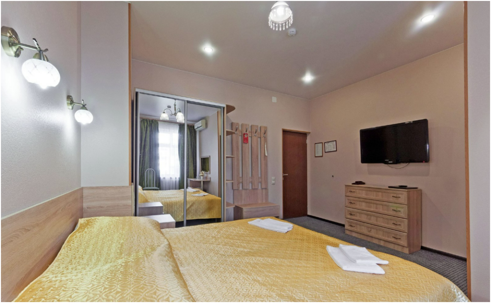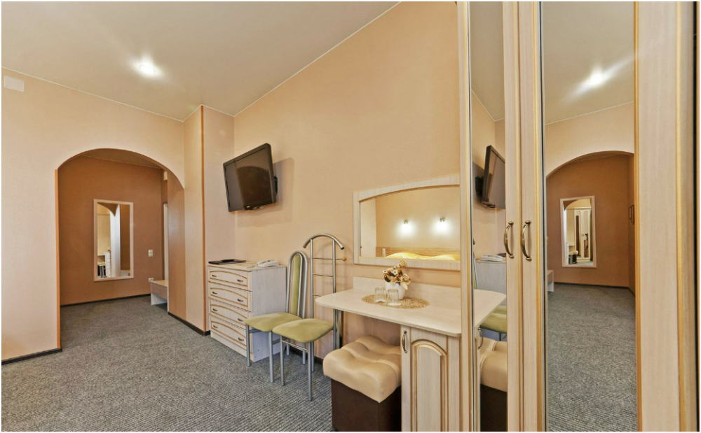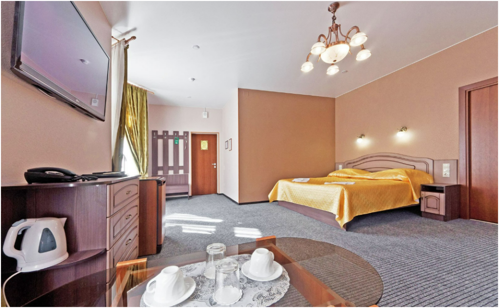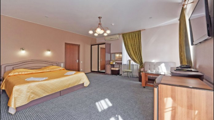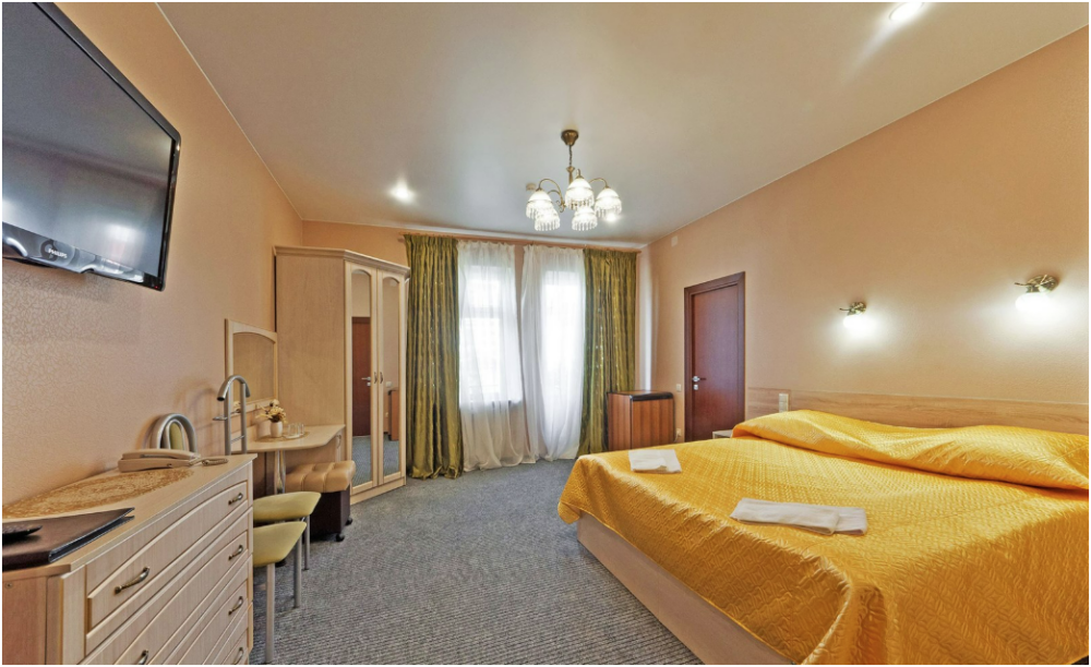 Просторный однокомнатный номер выполнен в теплых тонах. Номер состоит из спальной комнаты и совмещенного санузла.