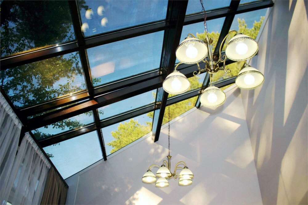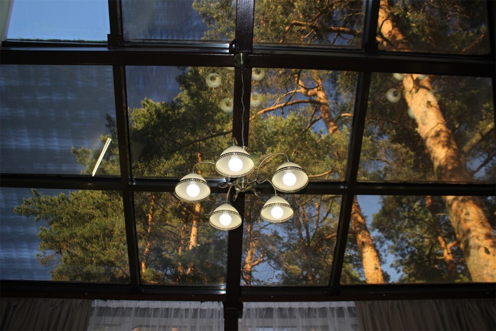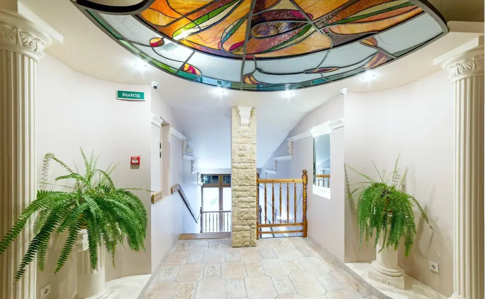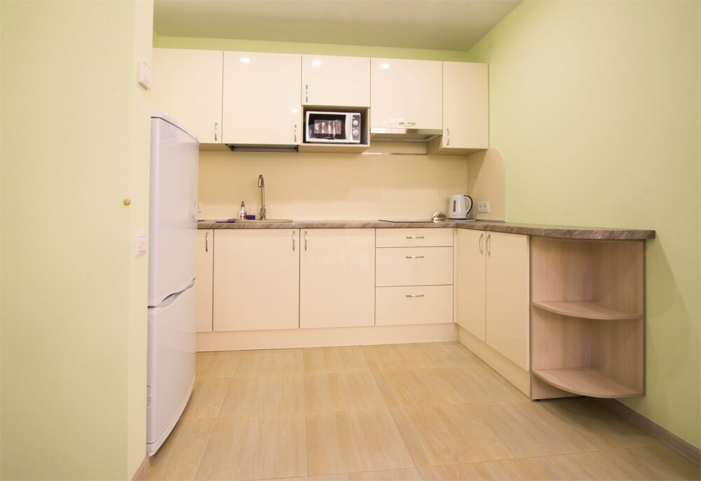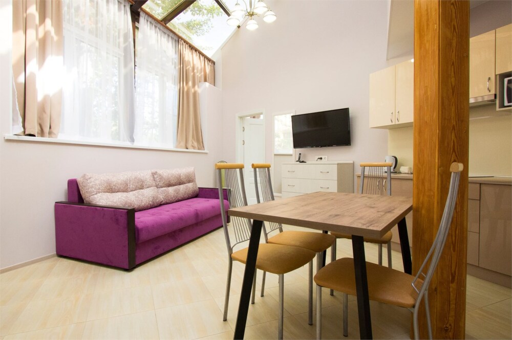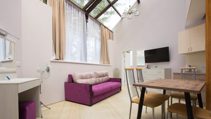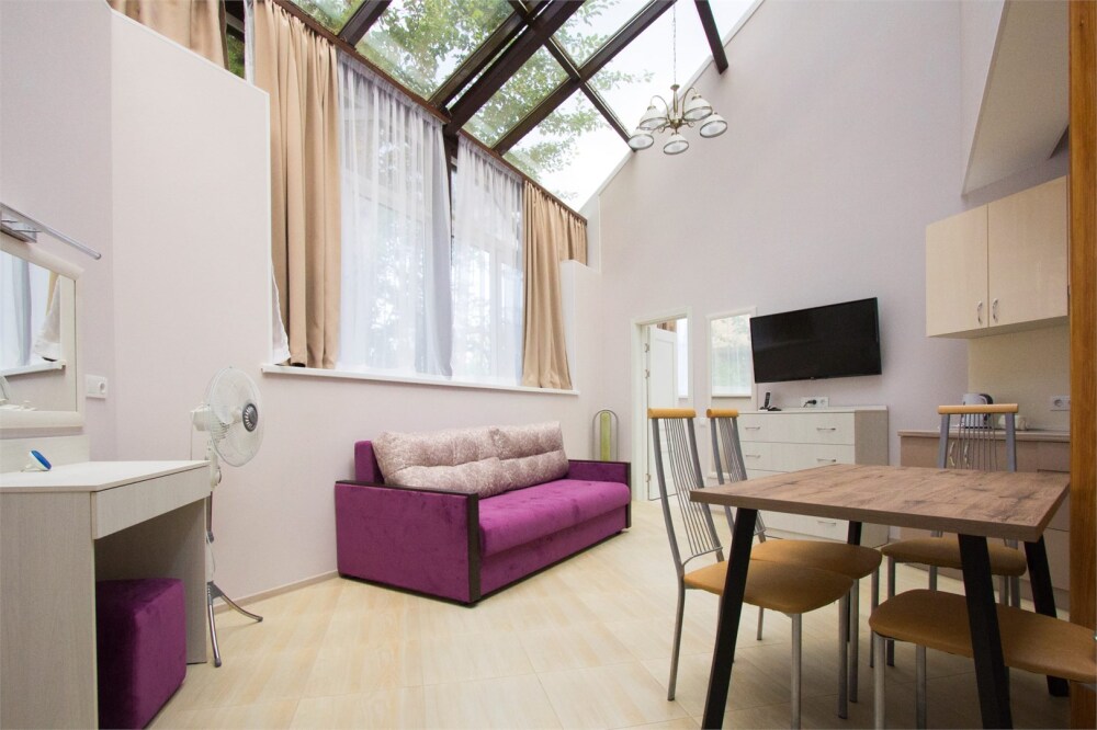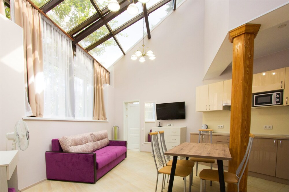 Просторные апартаменты со стеклянной крышей, 1 спальной комнатой, гостиной зоной с кухней и совмещенным санузлом с душем. Кухня оборудована варочной панелью, холодильником, эл. чайником, микроволновкой, есть вся необходимая посуда.