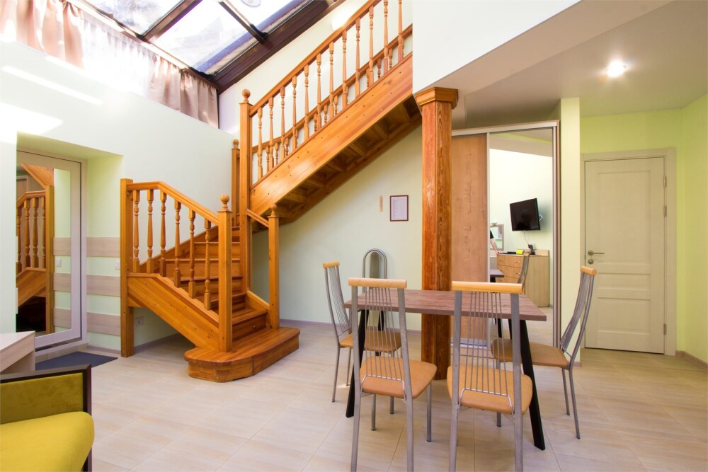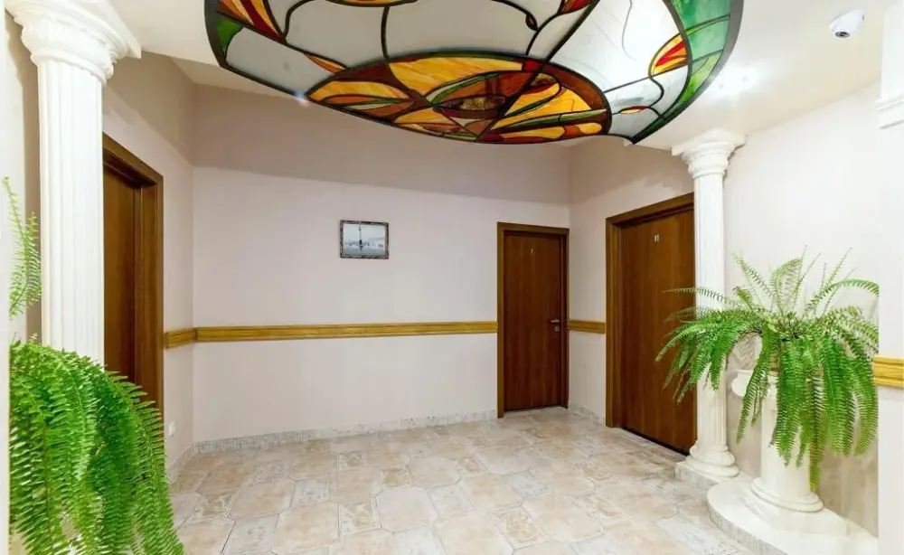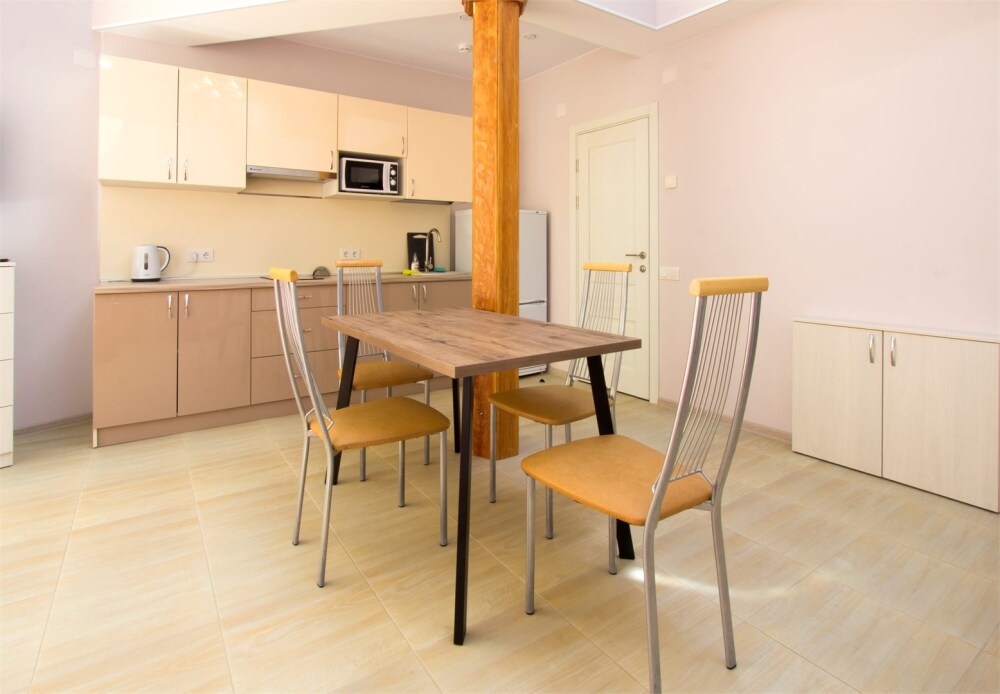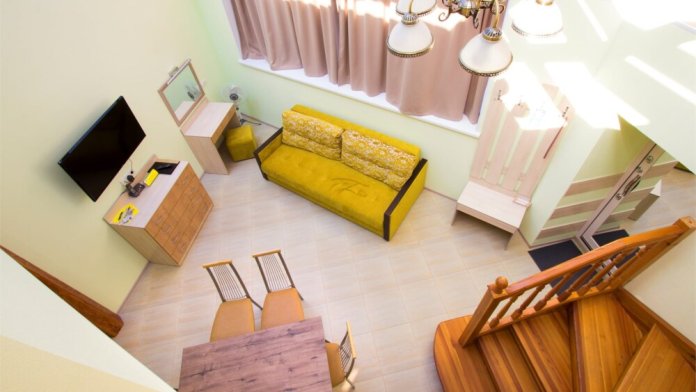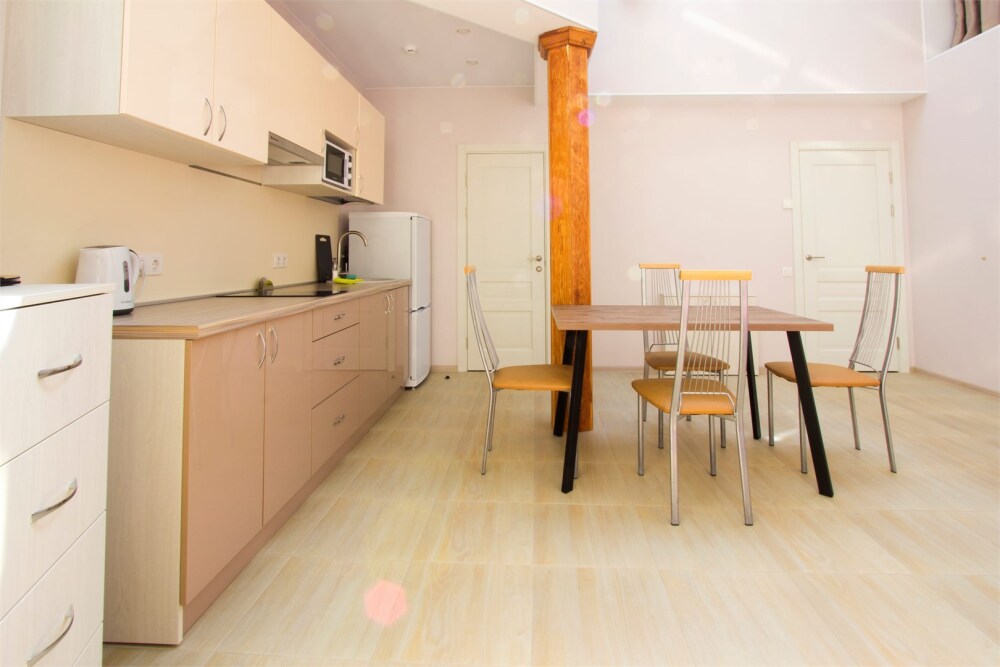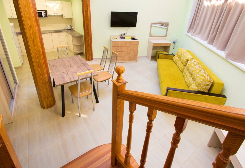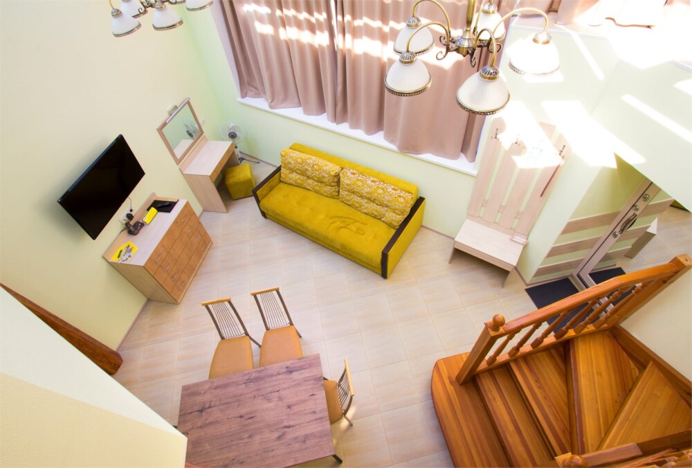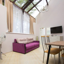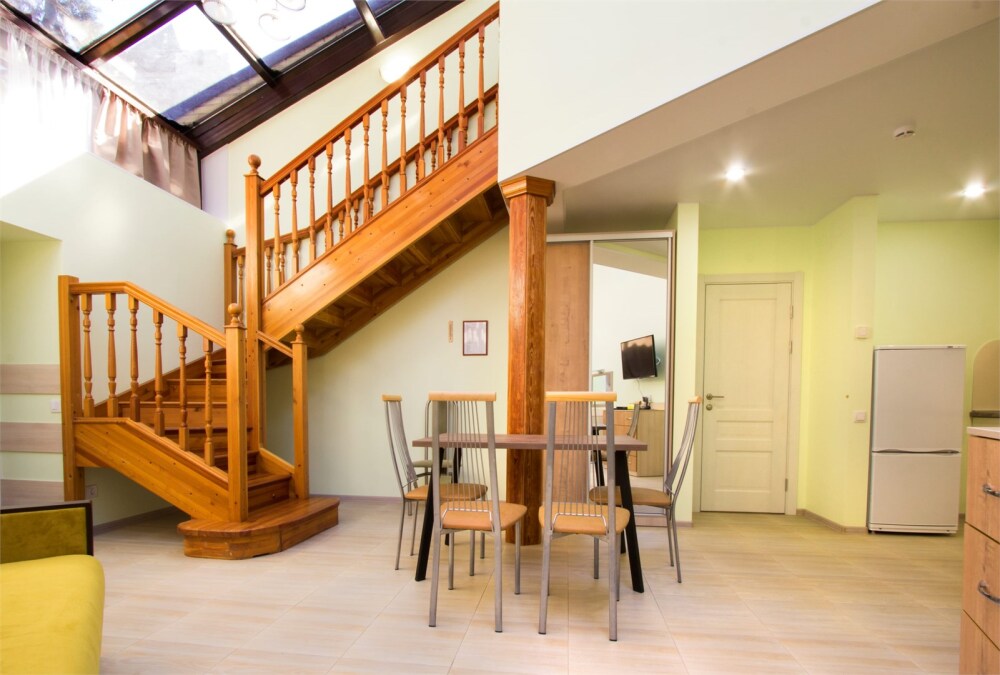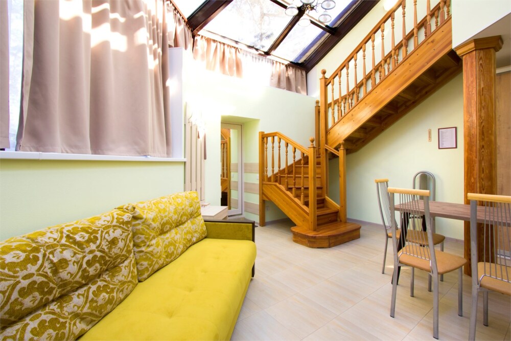 Оригинальные 2-х уровневые апартаменты со стеклянной крышей. В номере: 1 спальня, гостиная с диваном, кухня и совмещённый санузел с душем и сауной. Кухня оборудована варочной панелью, холодильником, эл. чайником, микроволновкой, есть вся необходимая посуда.